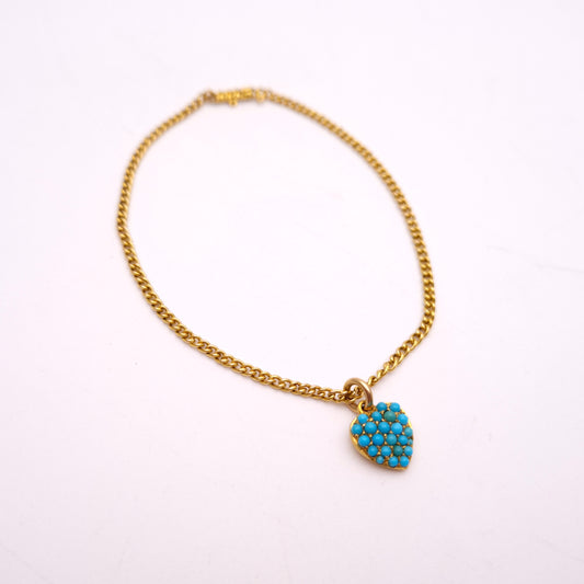 14ct / 15ct Yellow Gold Antique Turquoise Heart Charm and Curb Chain Bracelet