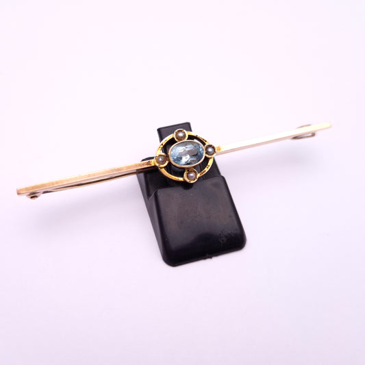 9ct Rose Gold Aquamarine and Seed Pearl Antique Bar Brooch