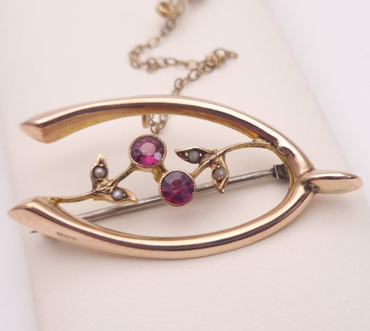 9ct Rose Gold Red Stone and seed pearl Wishbone Floral Brooch