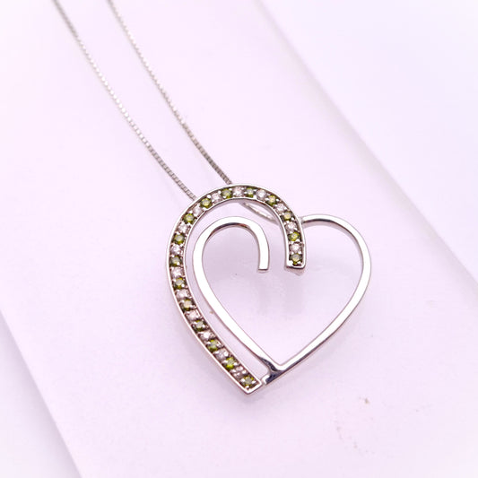 9ct White Gold Green and White Stone Open Heart Pendant and 18 inch Box Chain