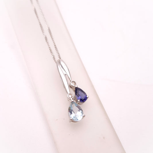 9ct White Gold Iolite, Aquamarine and Diamond Drop Pendant and Chain Necklace