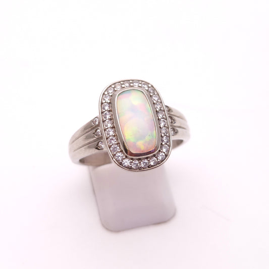 Sterling Silver Opal Doublet and CZ Halo Cushion Shaped Ring