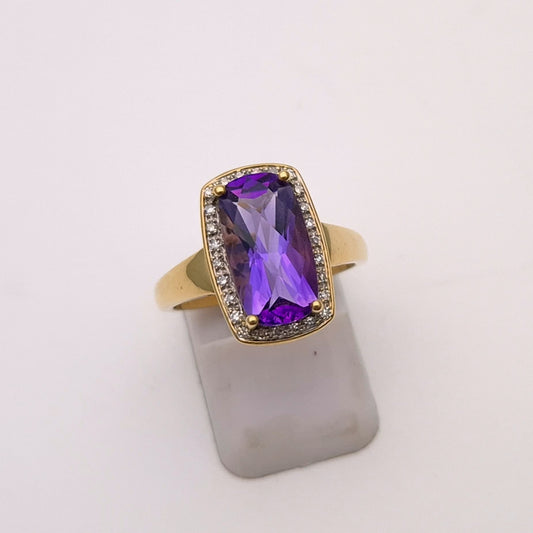 9ct Yellow Gold Chequerboard Rectangular Amethyst and Diamond Halo Cluster Ring