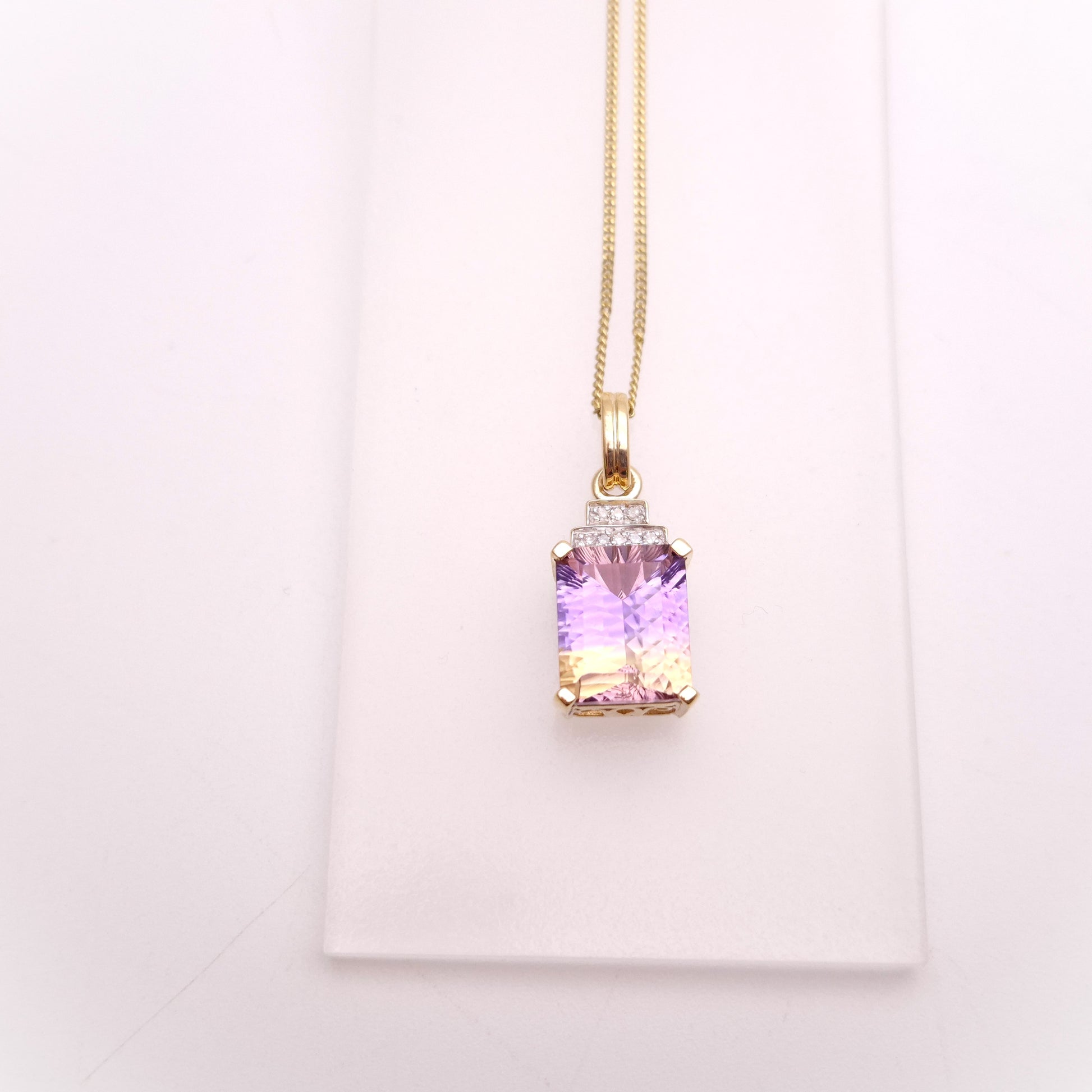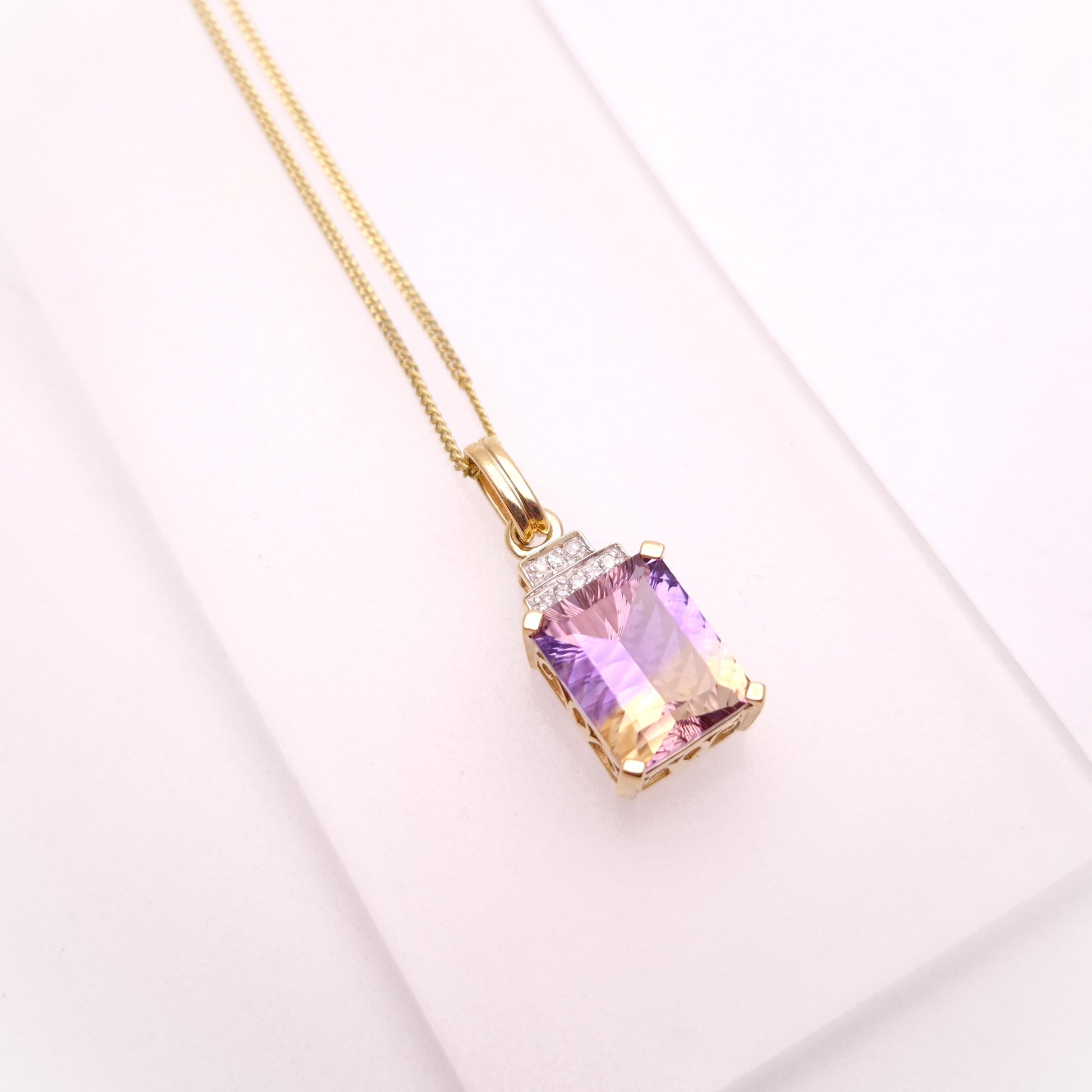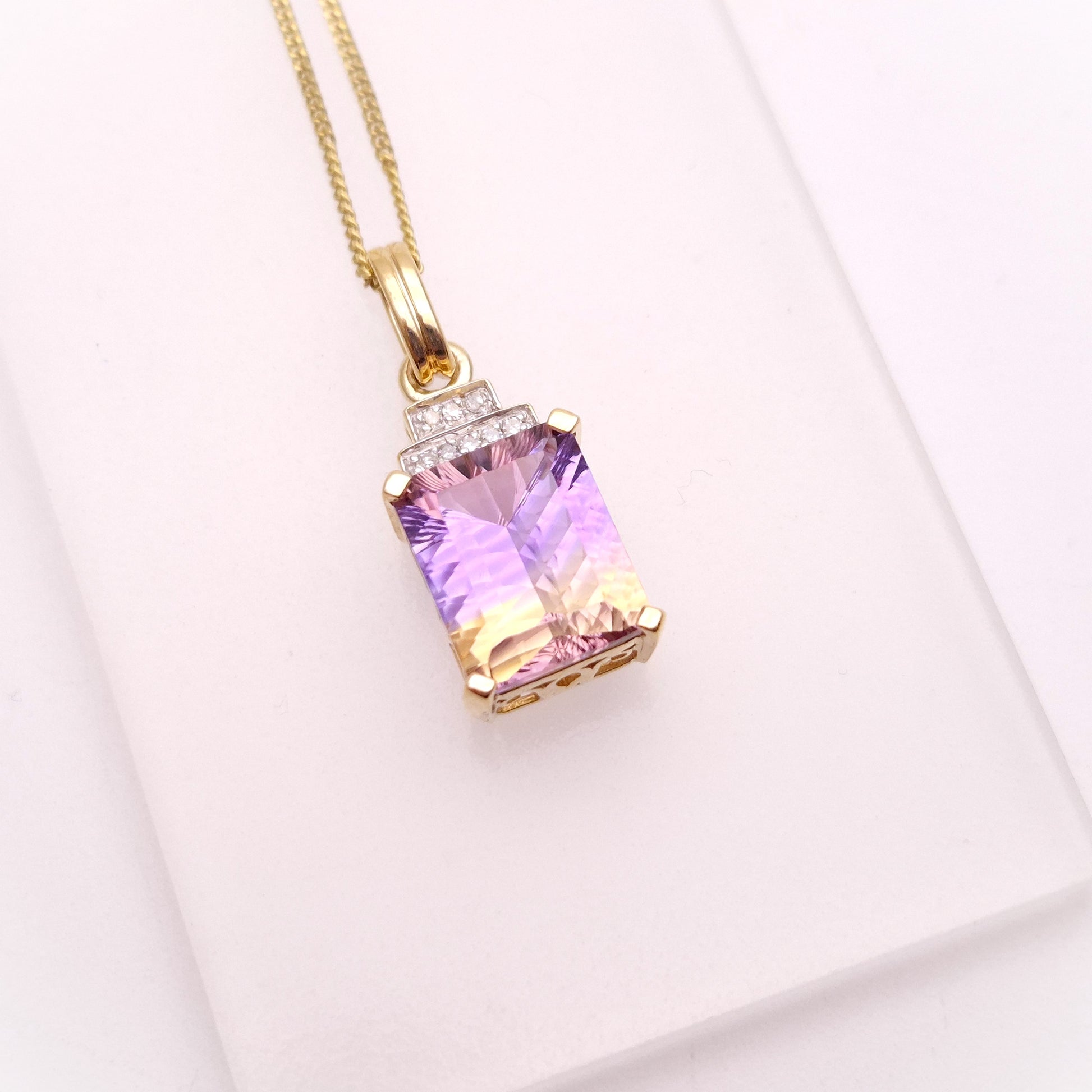 This stunning pendant features a captivating 10ct ametrine gemstone, showcasing a beautiful blend of purple amethyst and golden citrine within a single stone. The rectangular shape of the ametrine is elegantly framed, and accented by sparkling diamonds, adding a touch of brilliance and luxury. The yellow gold setting complements the unique colour combination of the ametrine, and is matched by a 9ct gold curb chain, known for its classic and durable design. The chain provides a secure and stylish way to showcase this eye-catching piece.