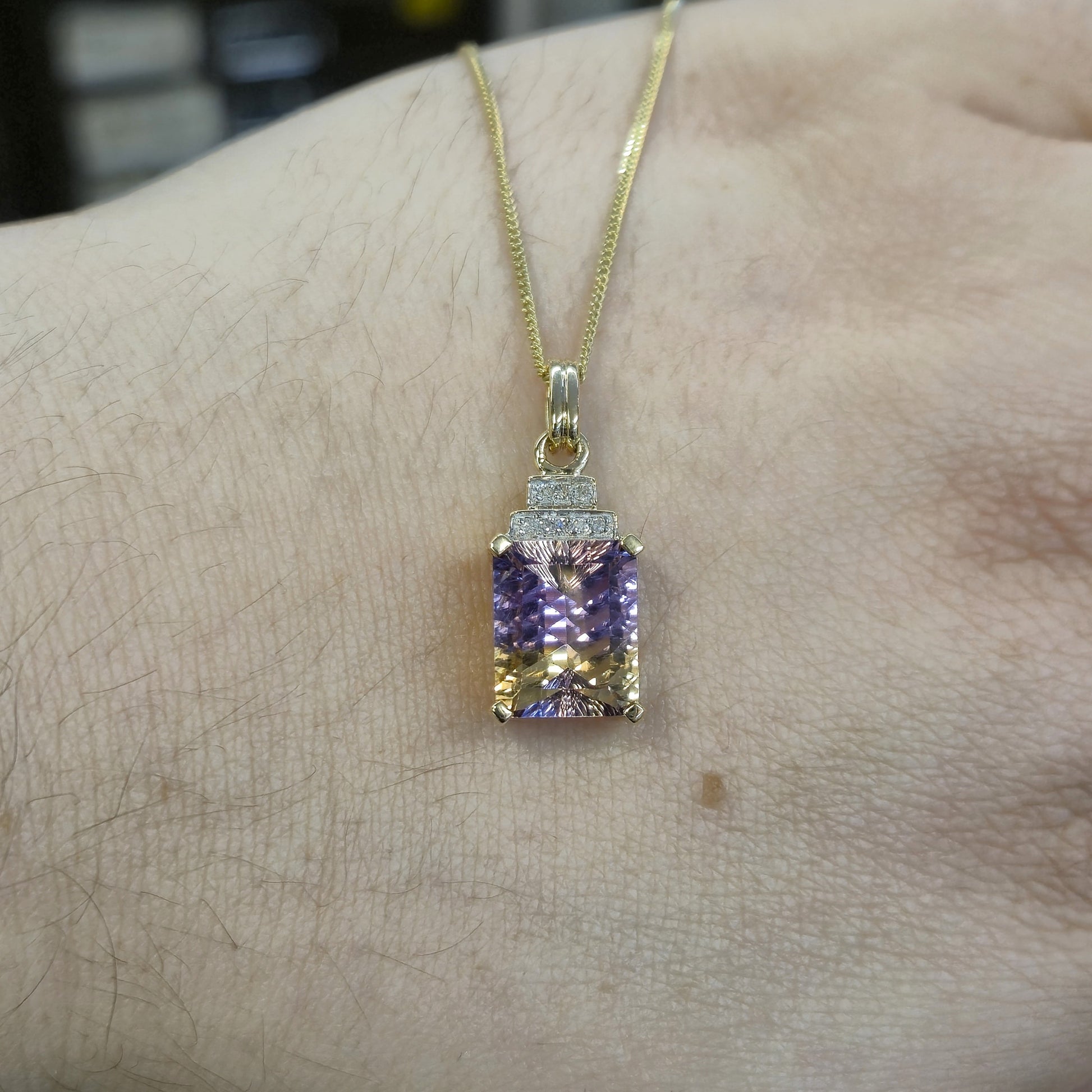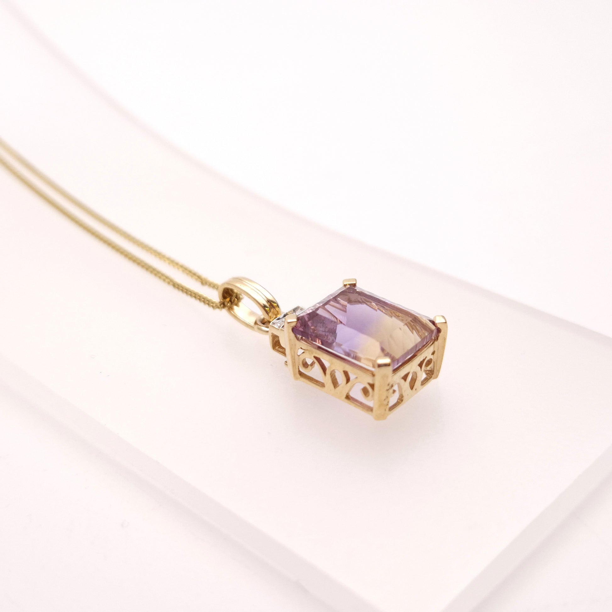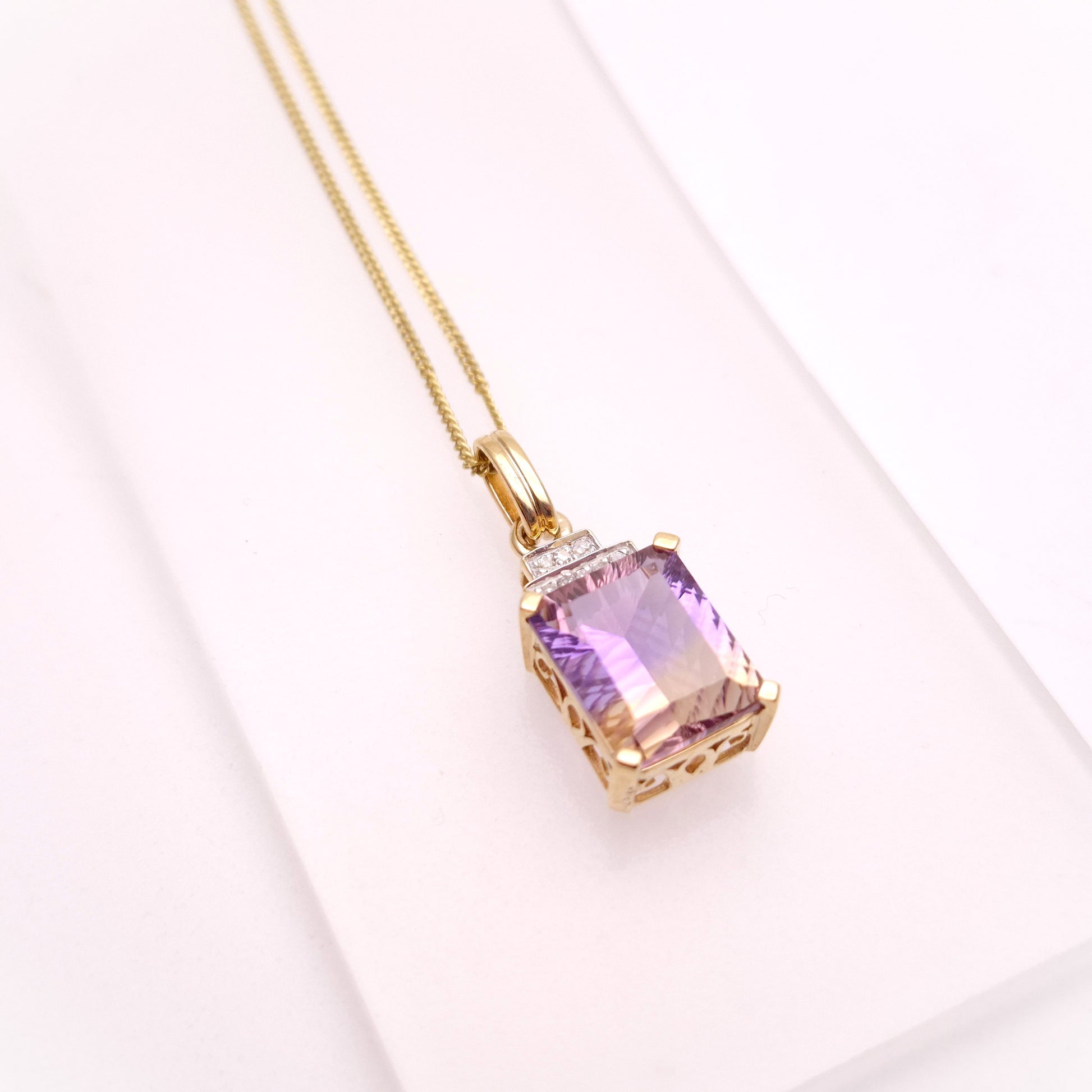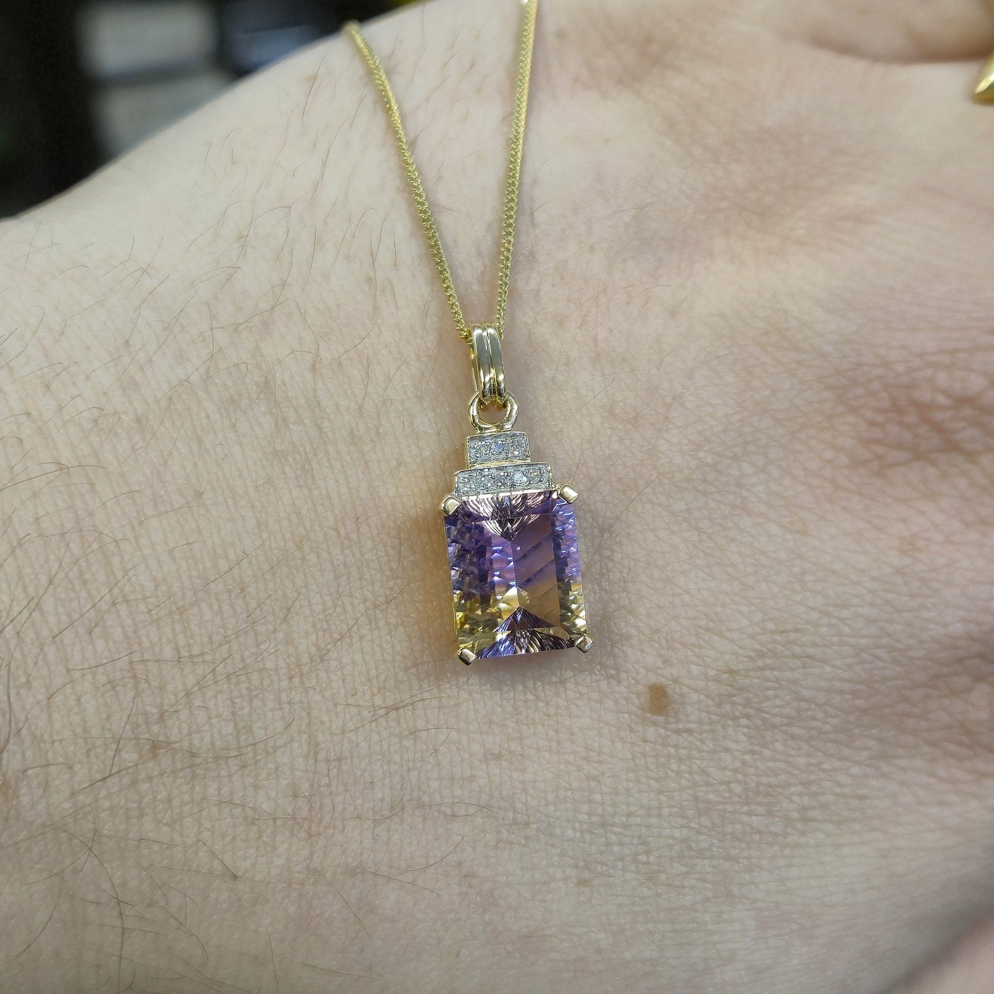 This stunning pendant features a captivating 10ct ametrine gemstone, showcasing a beautiful blend of purple amethyst and golden citrine within a single stone. The rectangular shape of the ametrine is elegantly framed, and accented by sparkling diamonds, adding a touch of brilliance and luxury. The yellow gold setting complements the unique colour combination of the ametrine, and is matched by a 9ct gold curb chain, known for its classic and durable design. The chain provides a secure and stylish way to showcase this eye-catching piece.