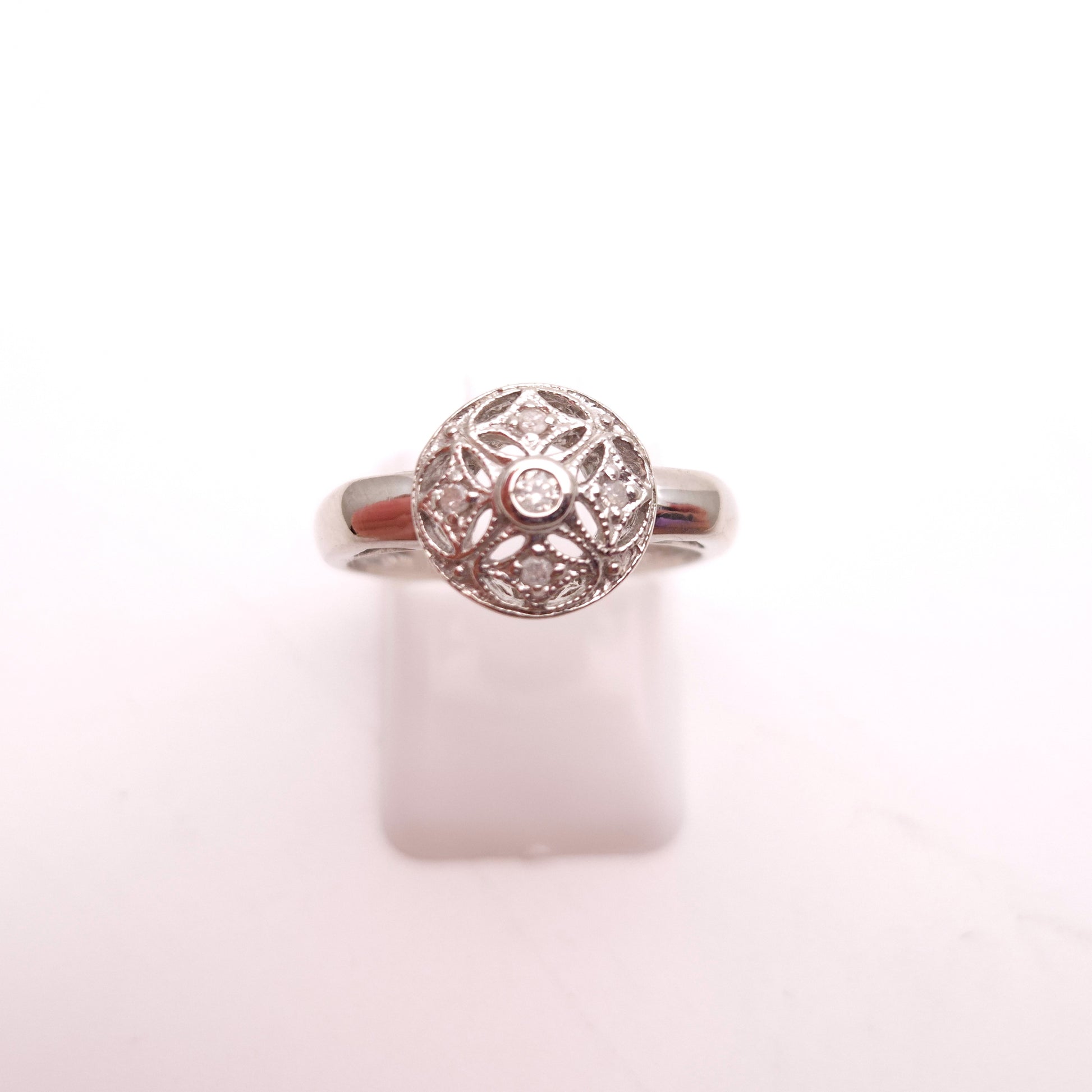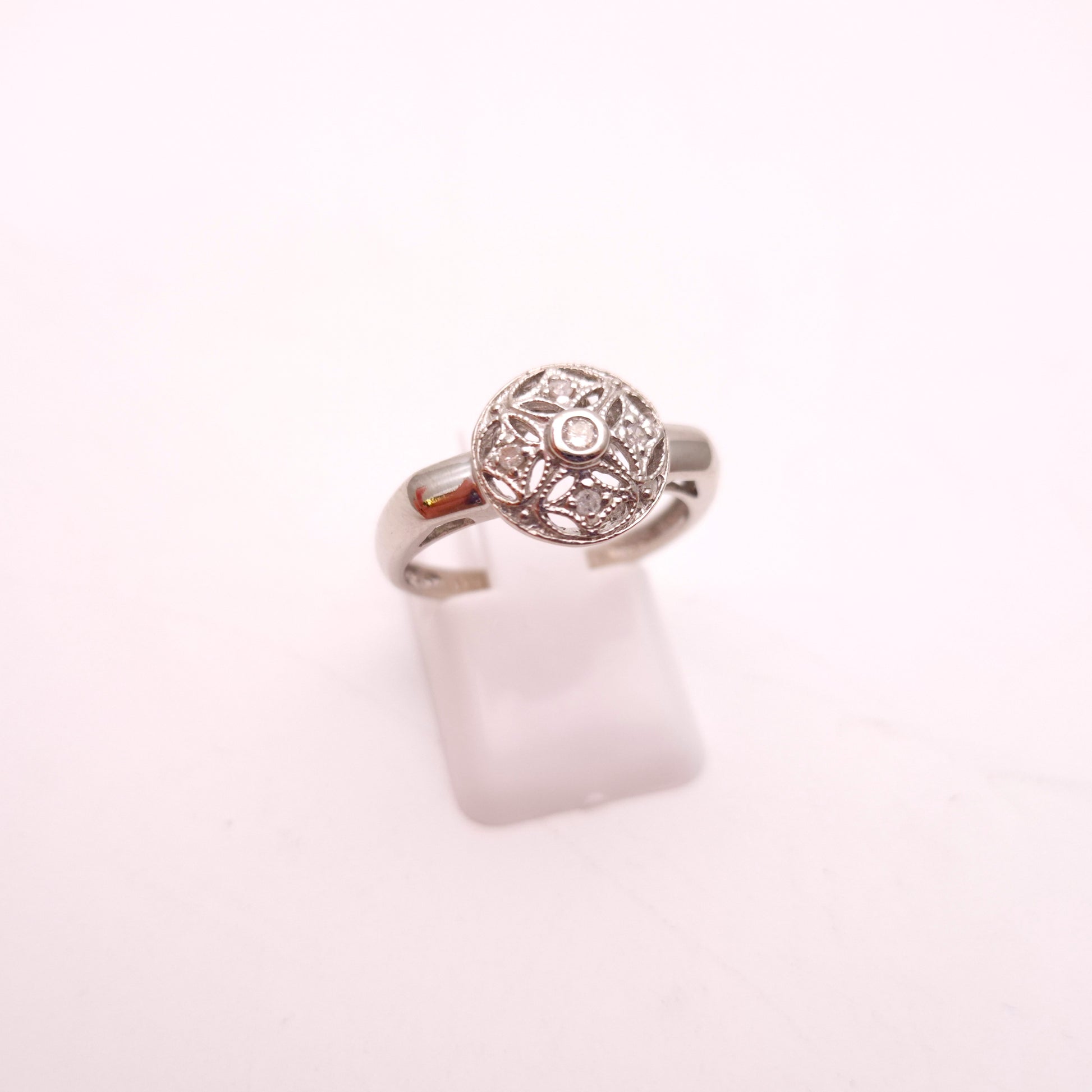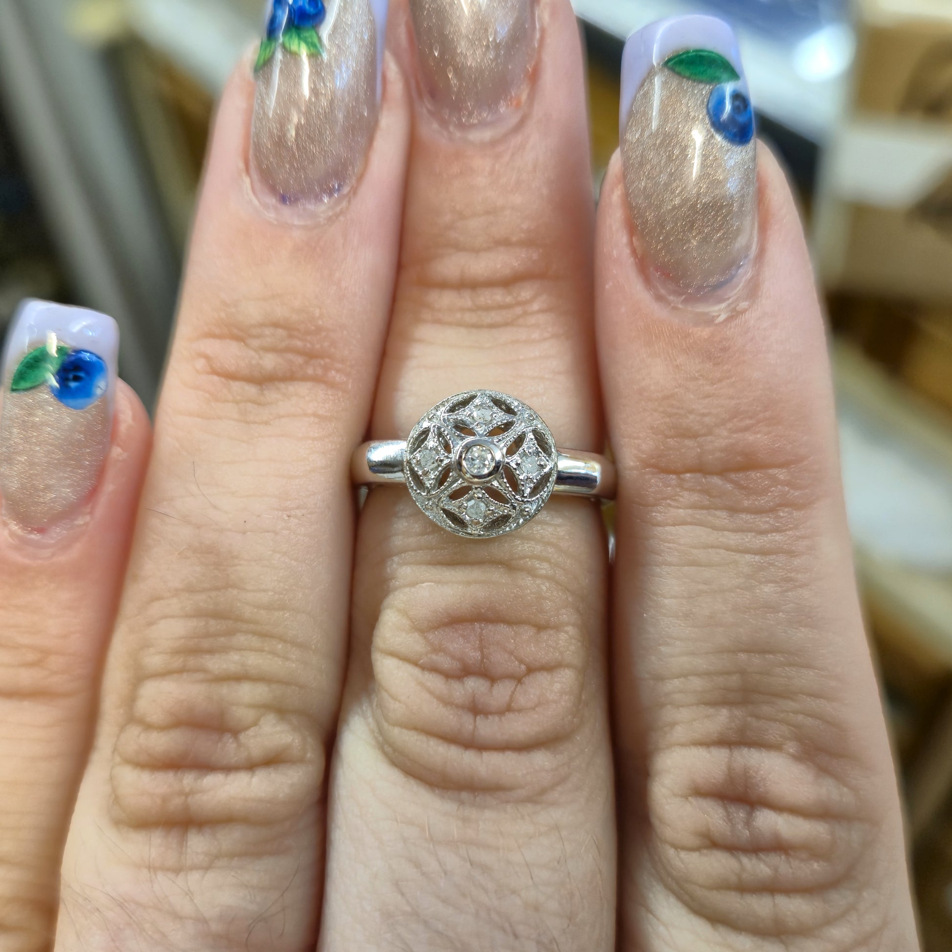 This exquisite ring, crafted in lustrous 10ct white gold, evokes the timeless elegance of the Art Deco era with its intricate openwork design and sparkling diamond accents. The central feature is a captivating circular motif, set with multiple small diamonds surrounded by a delicate framework of geometric openwork.