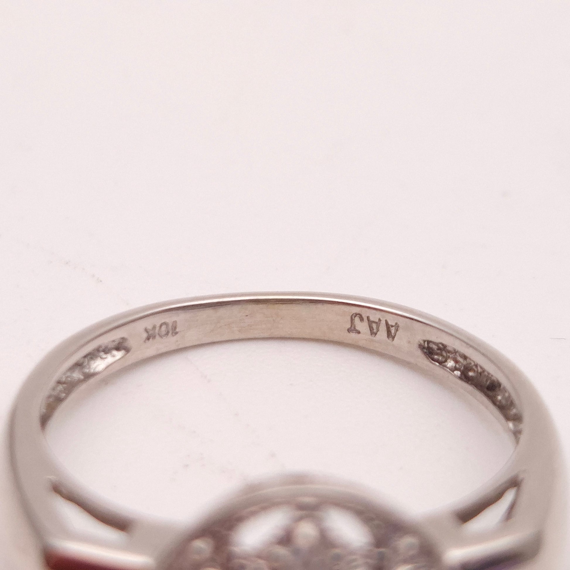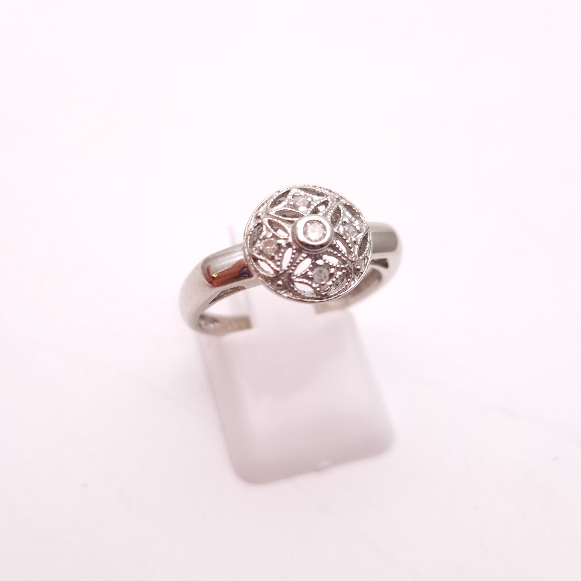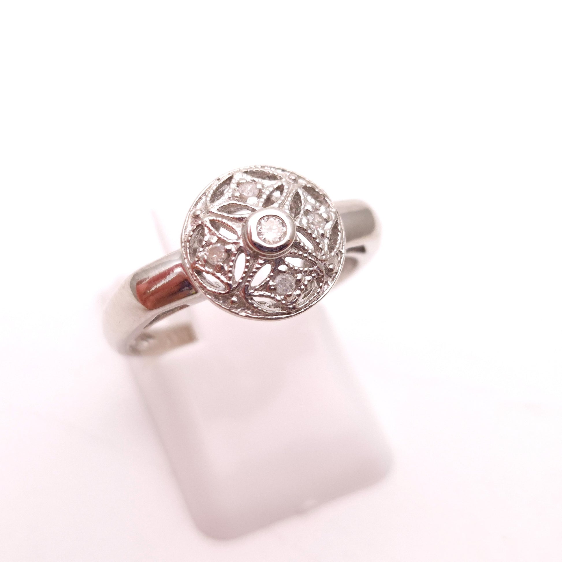 This exquisite ring, crafted in lustrous 10ct white gold, evokes the timeless elegance of the Art Deco era with its intricate openwork design and sparkling diamond accents. The central feature is a captivating circular motif, set with multiple small diamonds surrounded by a delicate framework of geometric openwork.