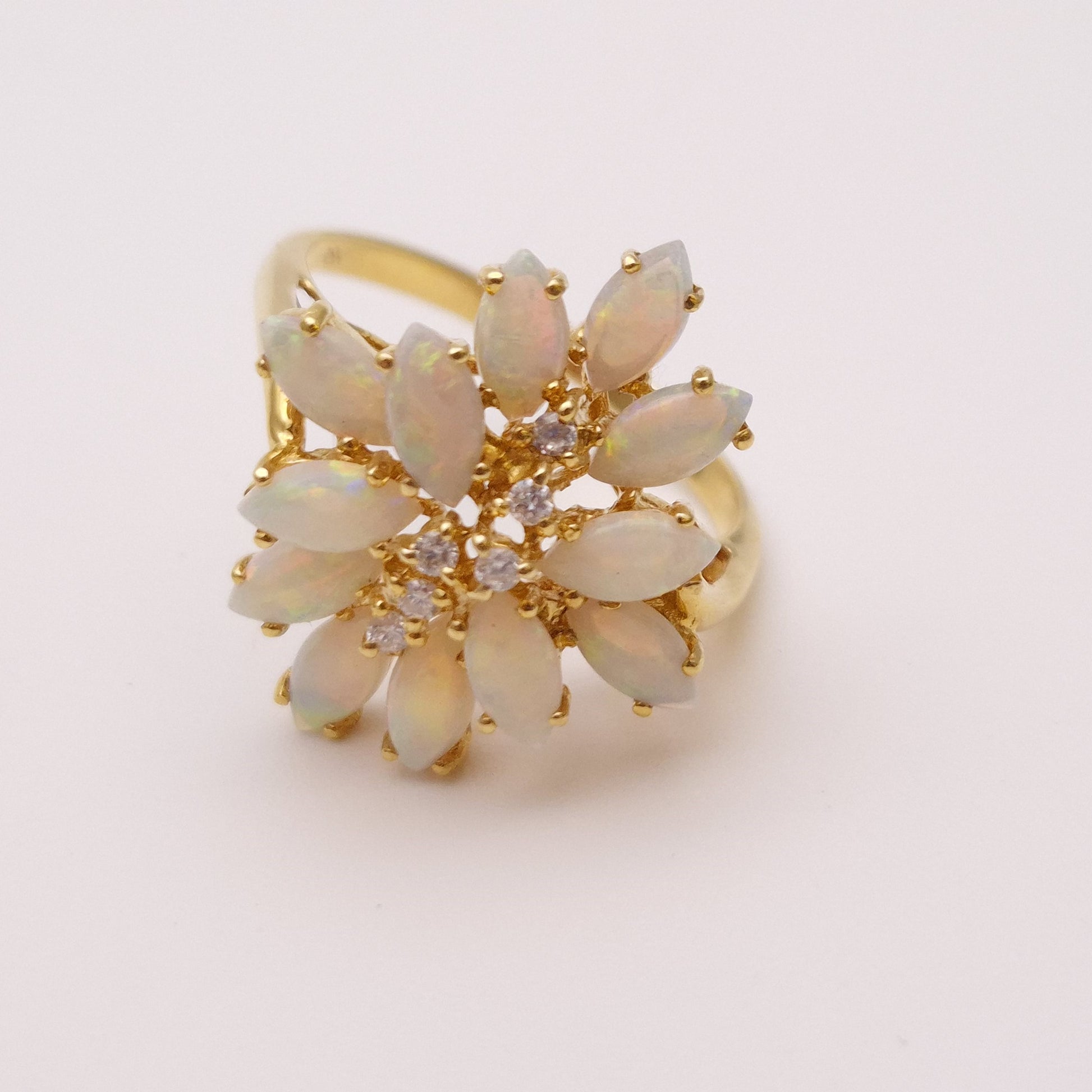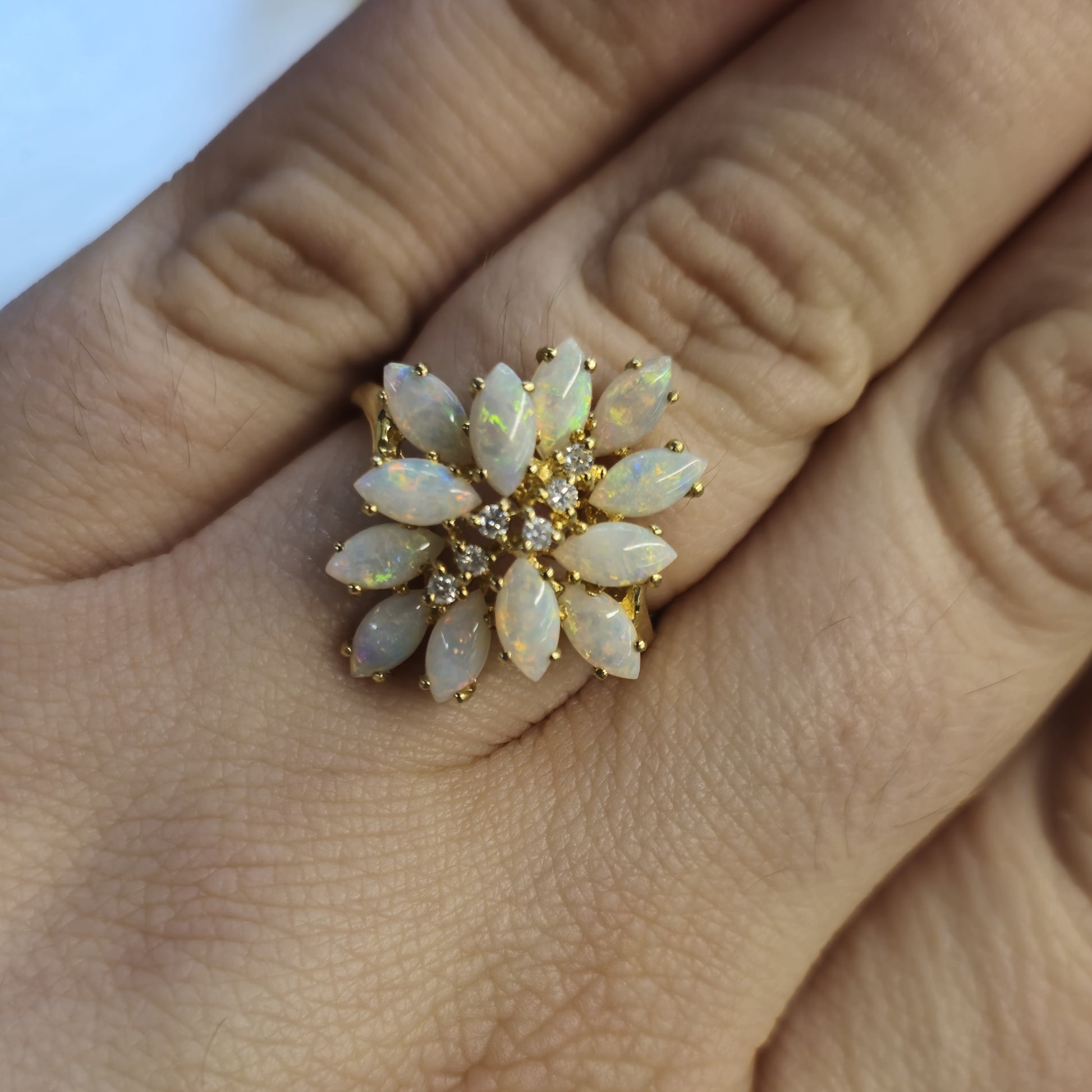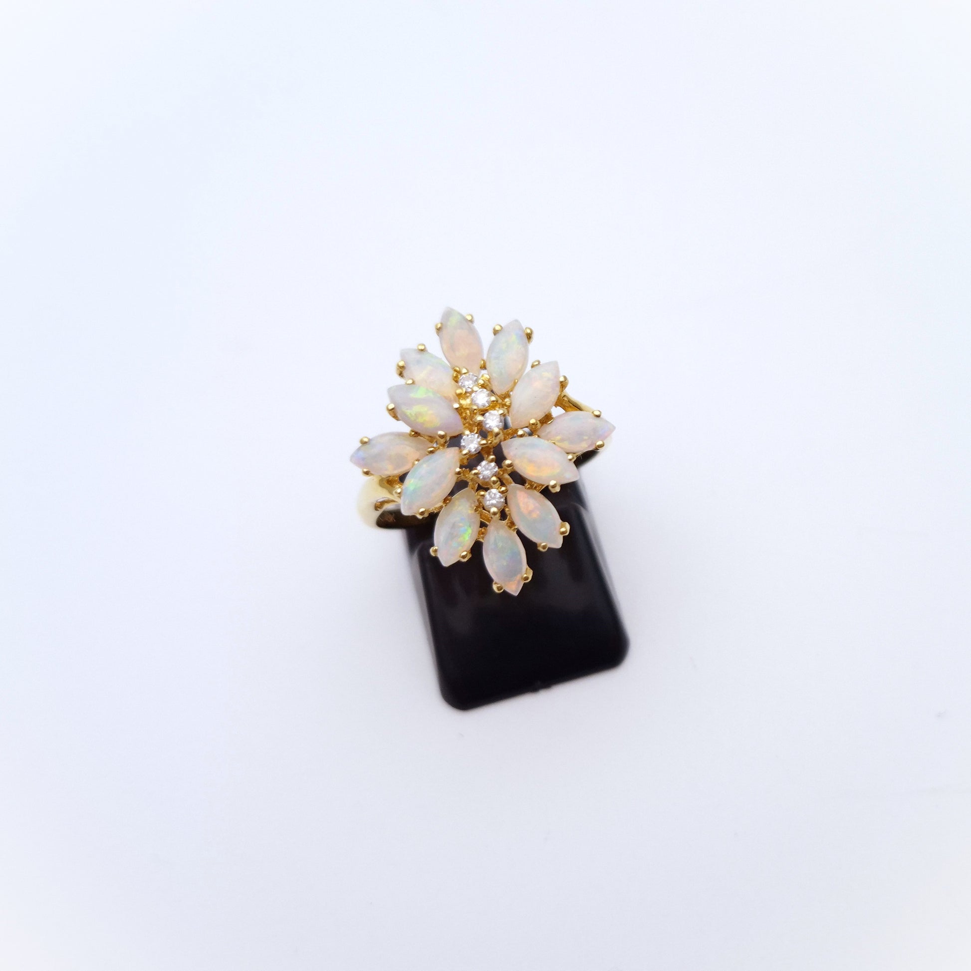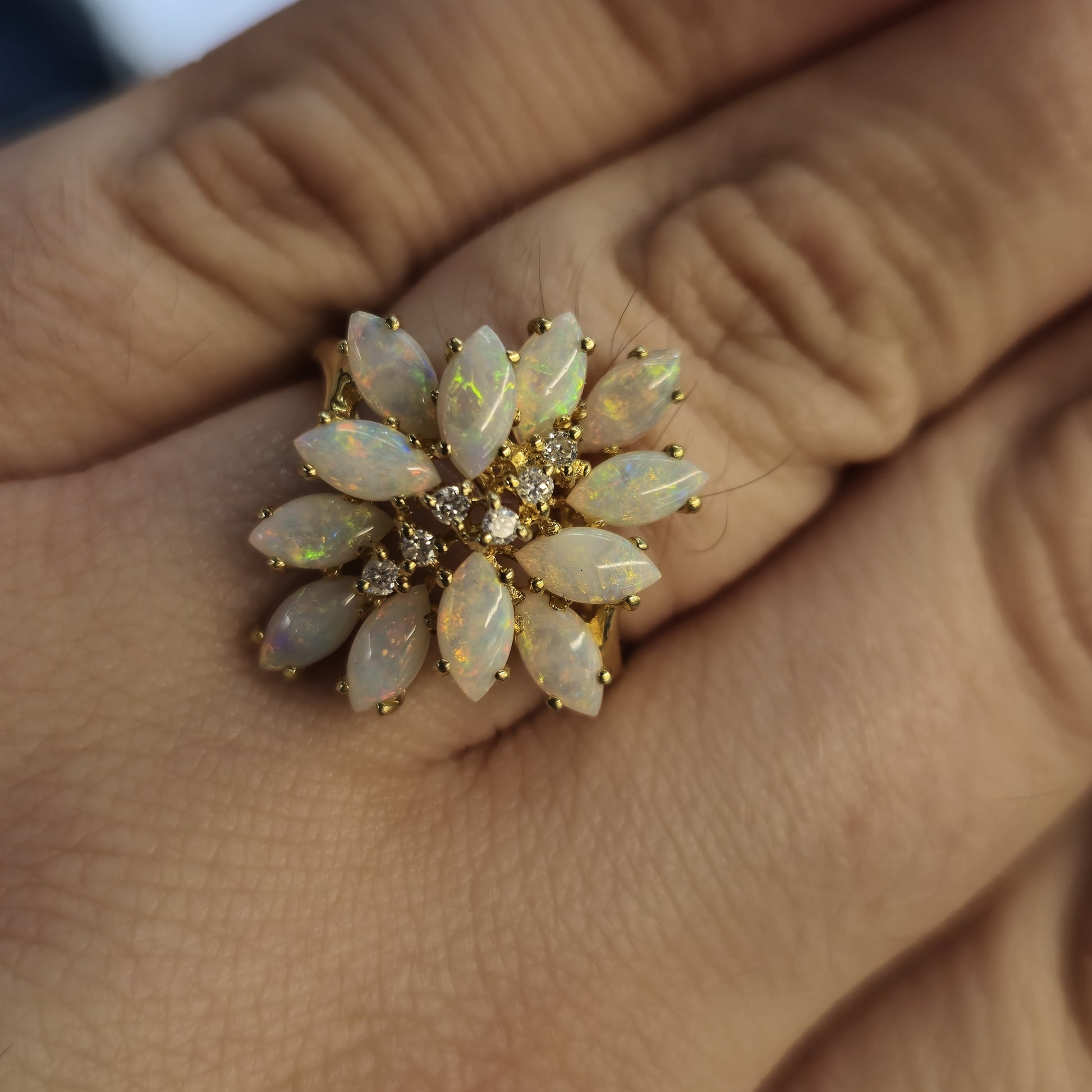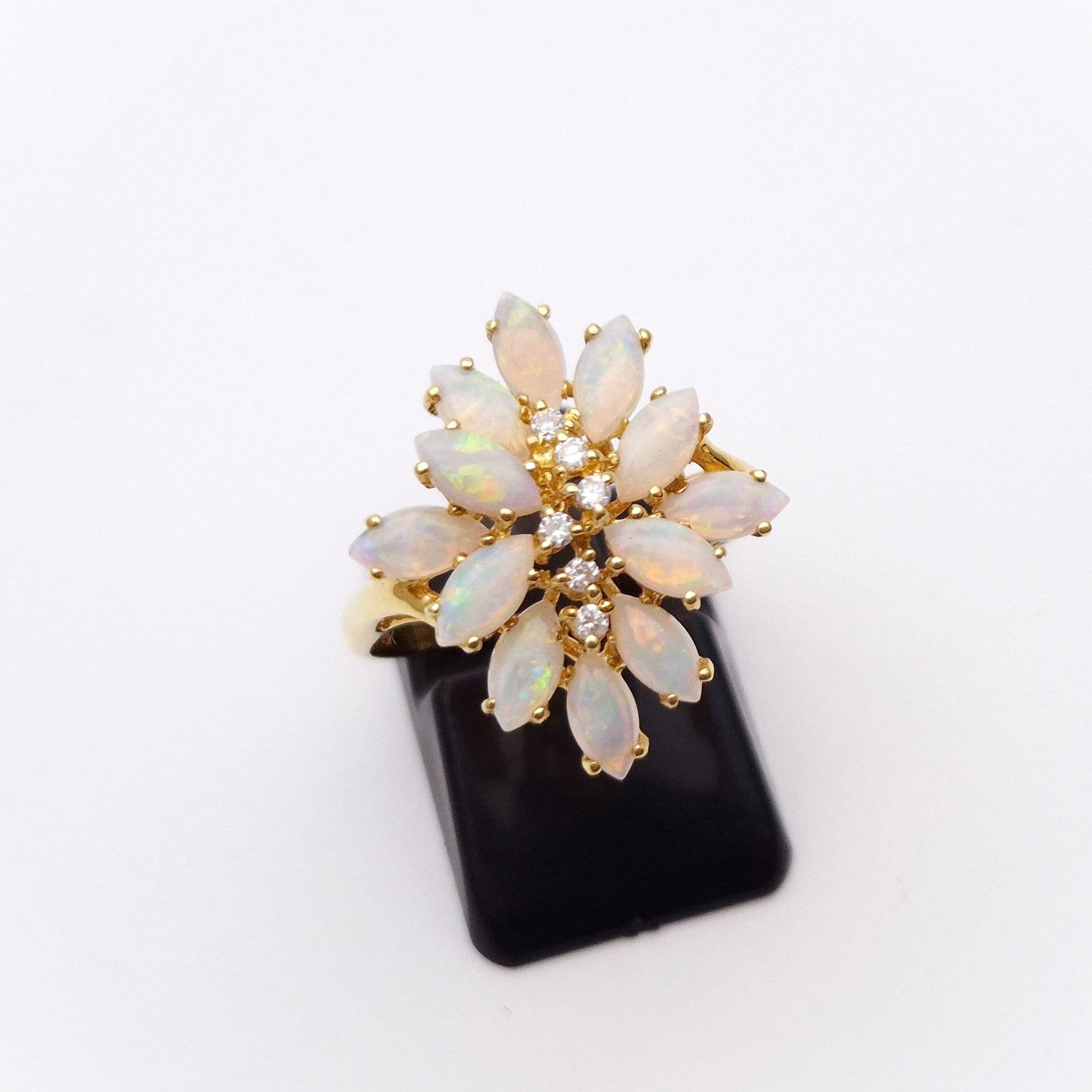 This Unusual cluster style ring is made form 10ct yellow gold and features 12 gorgeously coloured marquise cut cabochon opals in a unique multi-level cluster design with 6 small round cut diamonds in a line down the centre.