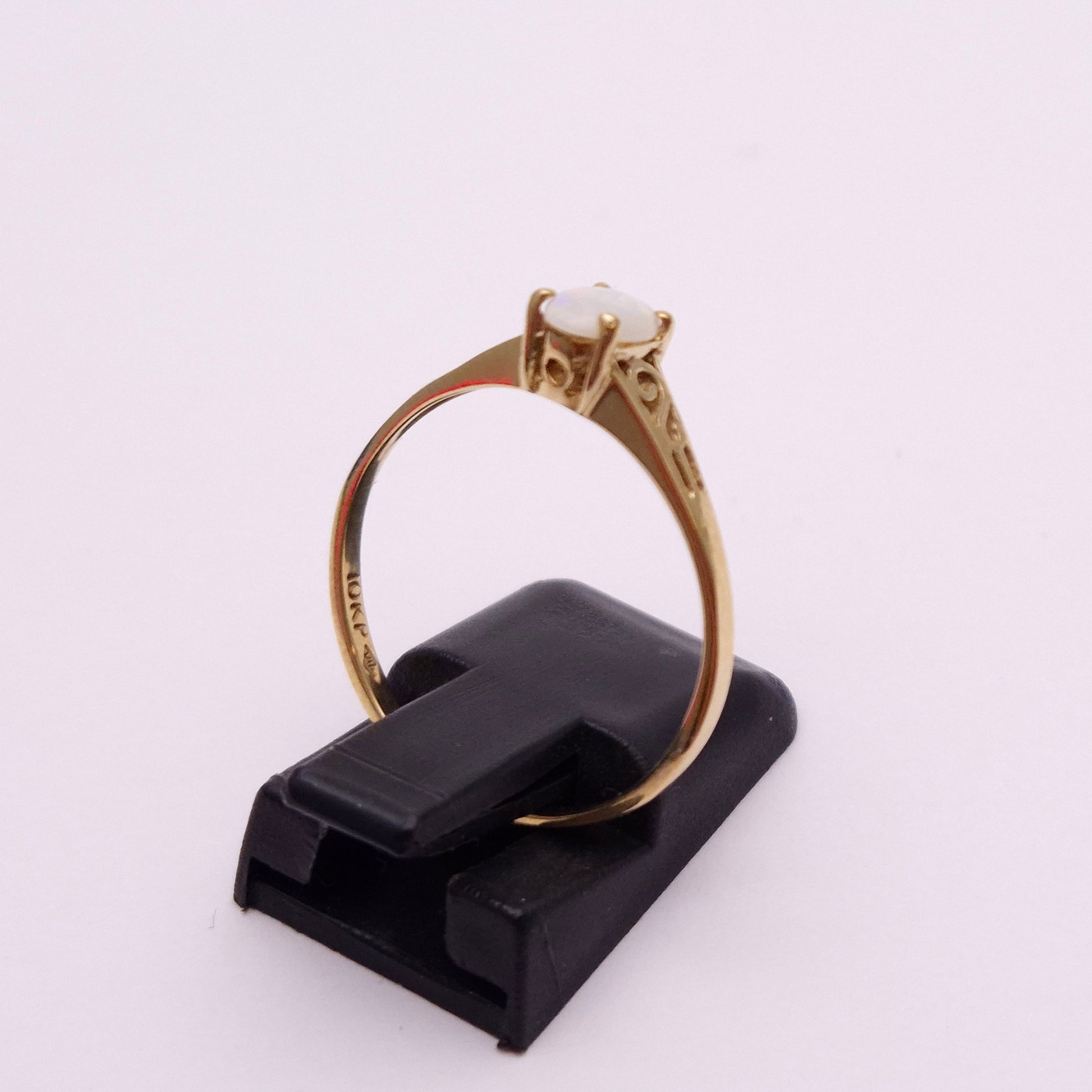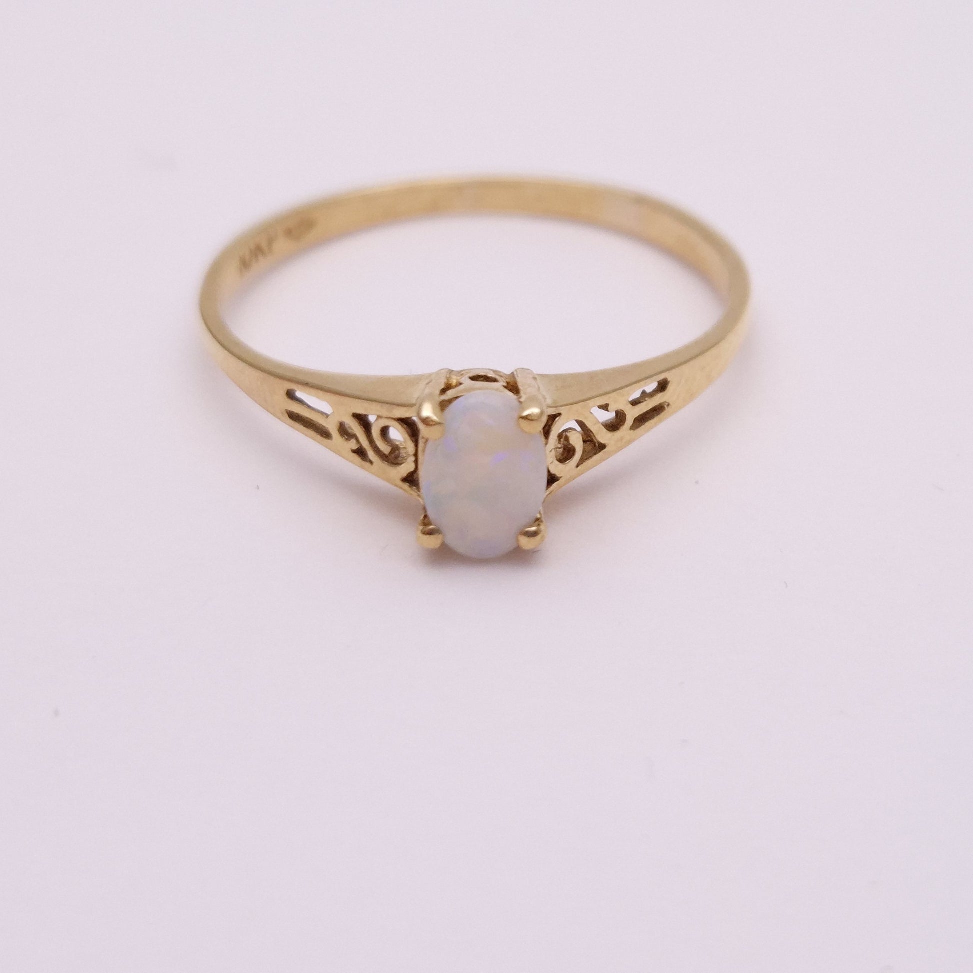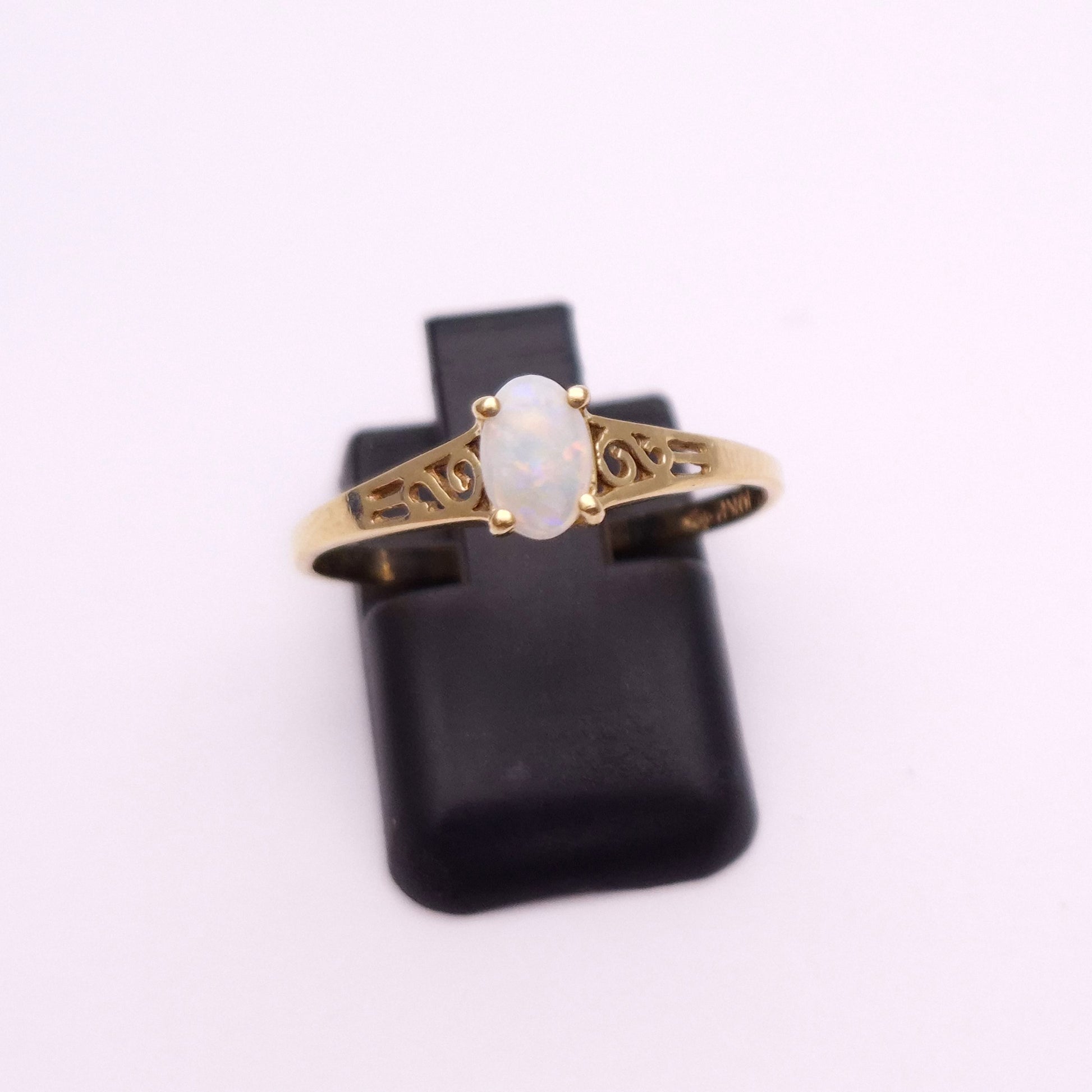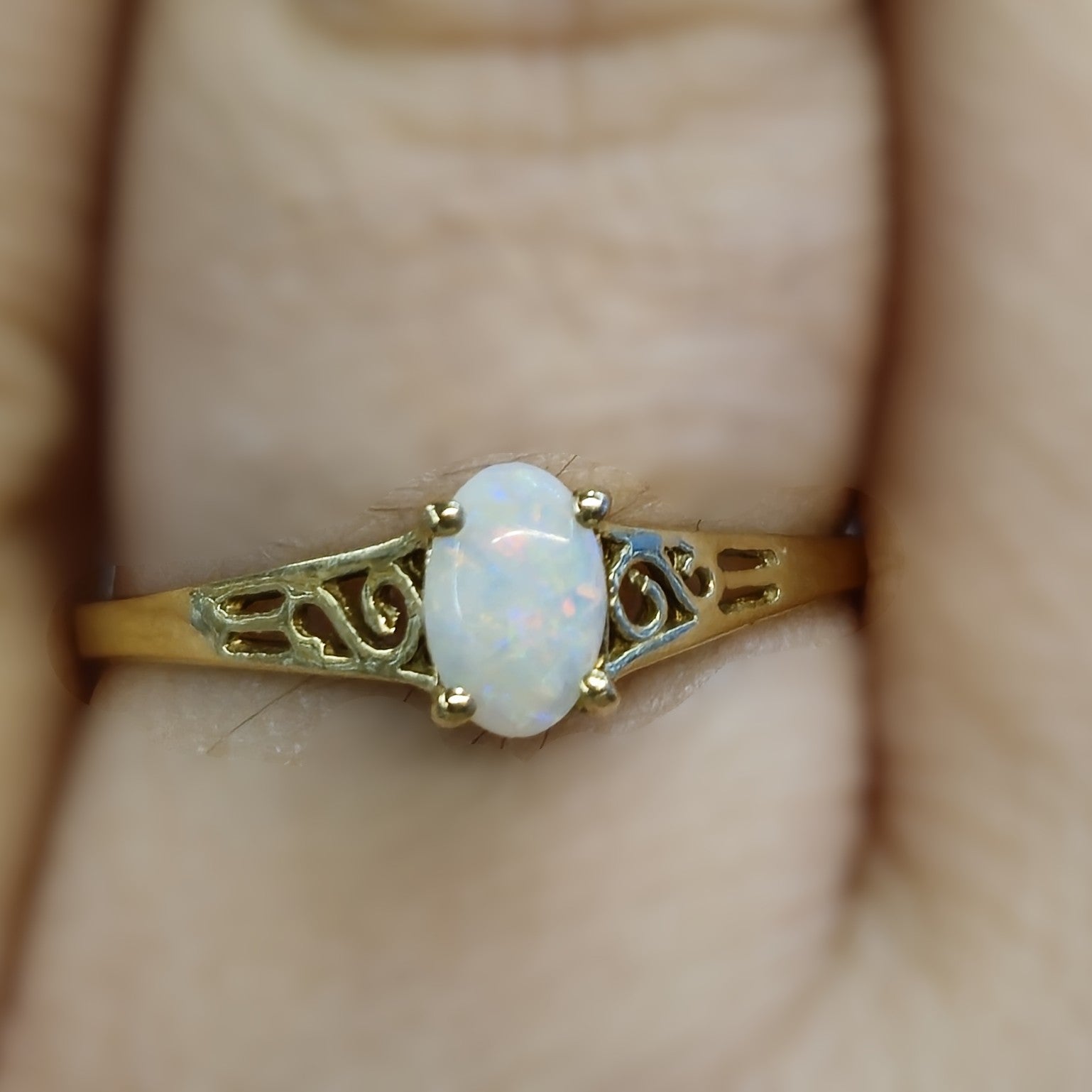 This pretty but simple ring is made from 10ct yellow gold and simple in design with an oval cabochon opal set at the centre with swirly cut out detailing on the shoulders and a plain band.