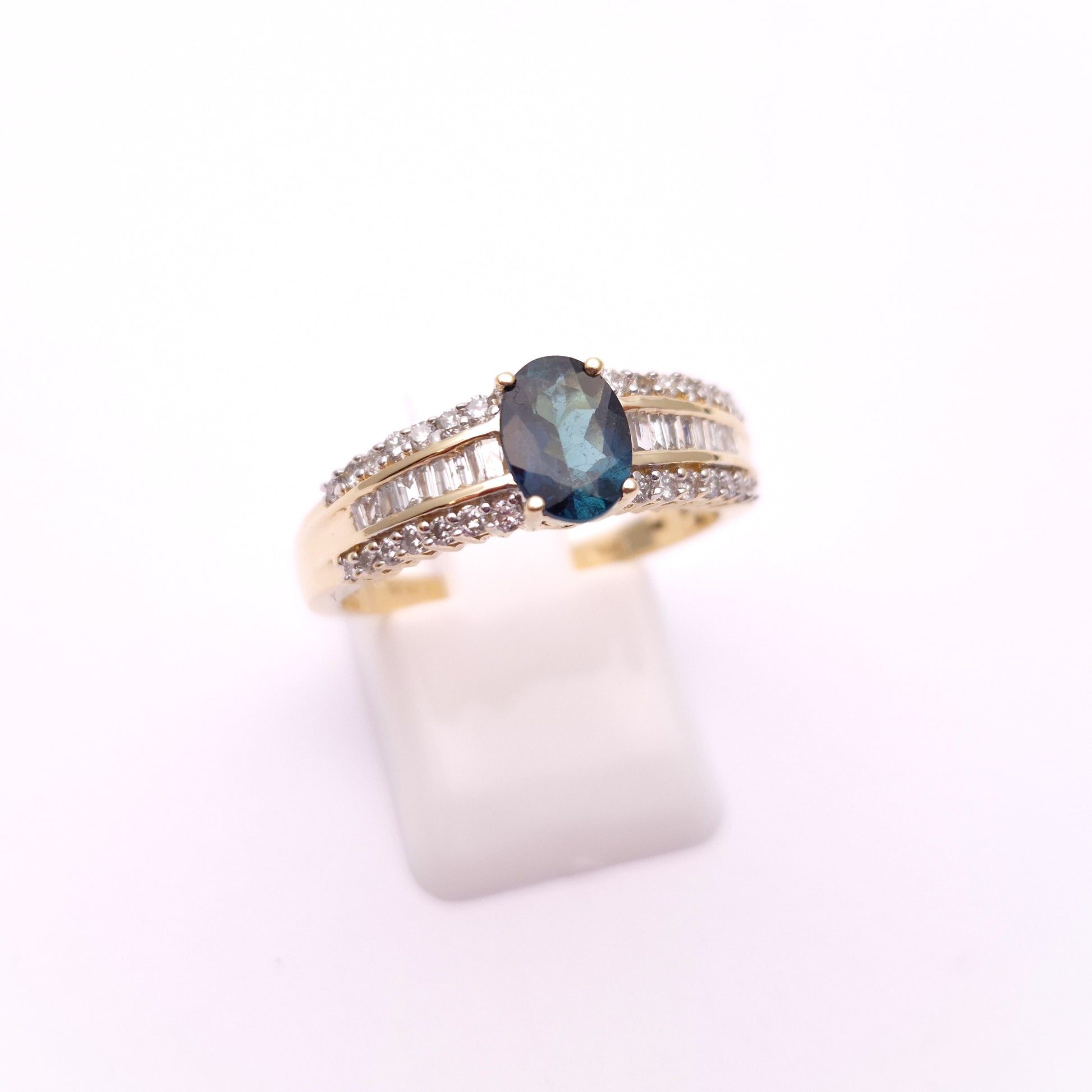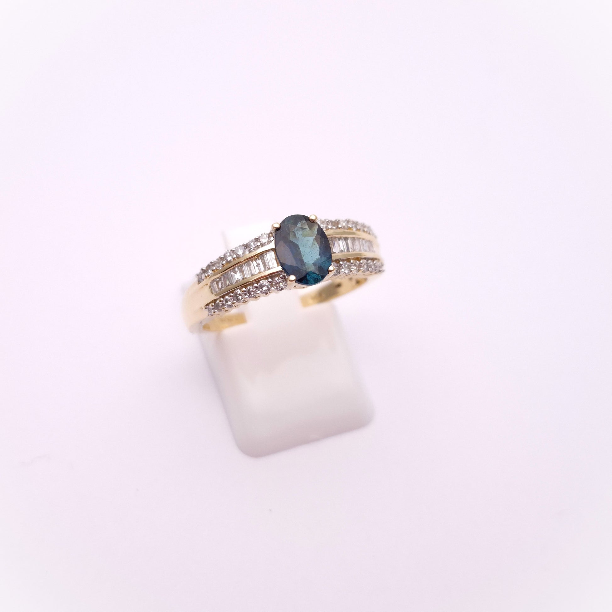 This is a sophisticated and elegant ring crafted in 14ct yellow gold. It features a striking oval-cut blue tourmaline as its centrepiece, beautifully complemented by a dazzling array of diamonds in a half-eternity style setting.
