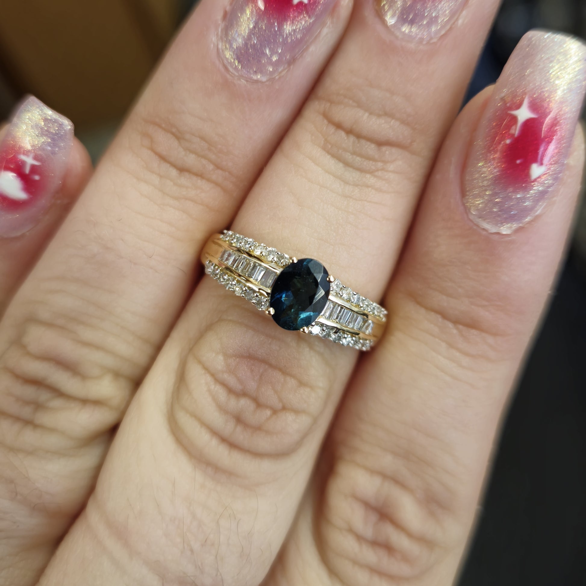 The oval-cut blue tourmaline is a captivating focal point with its rich blue tone and multiple diamonds are set across the top half of the ring shank, offering significant sparkle and brilliance visible to the wearer and others.