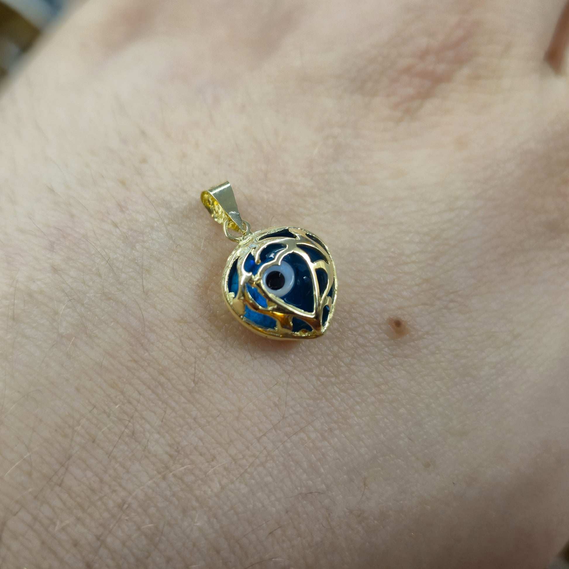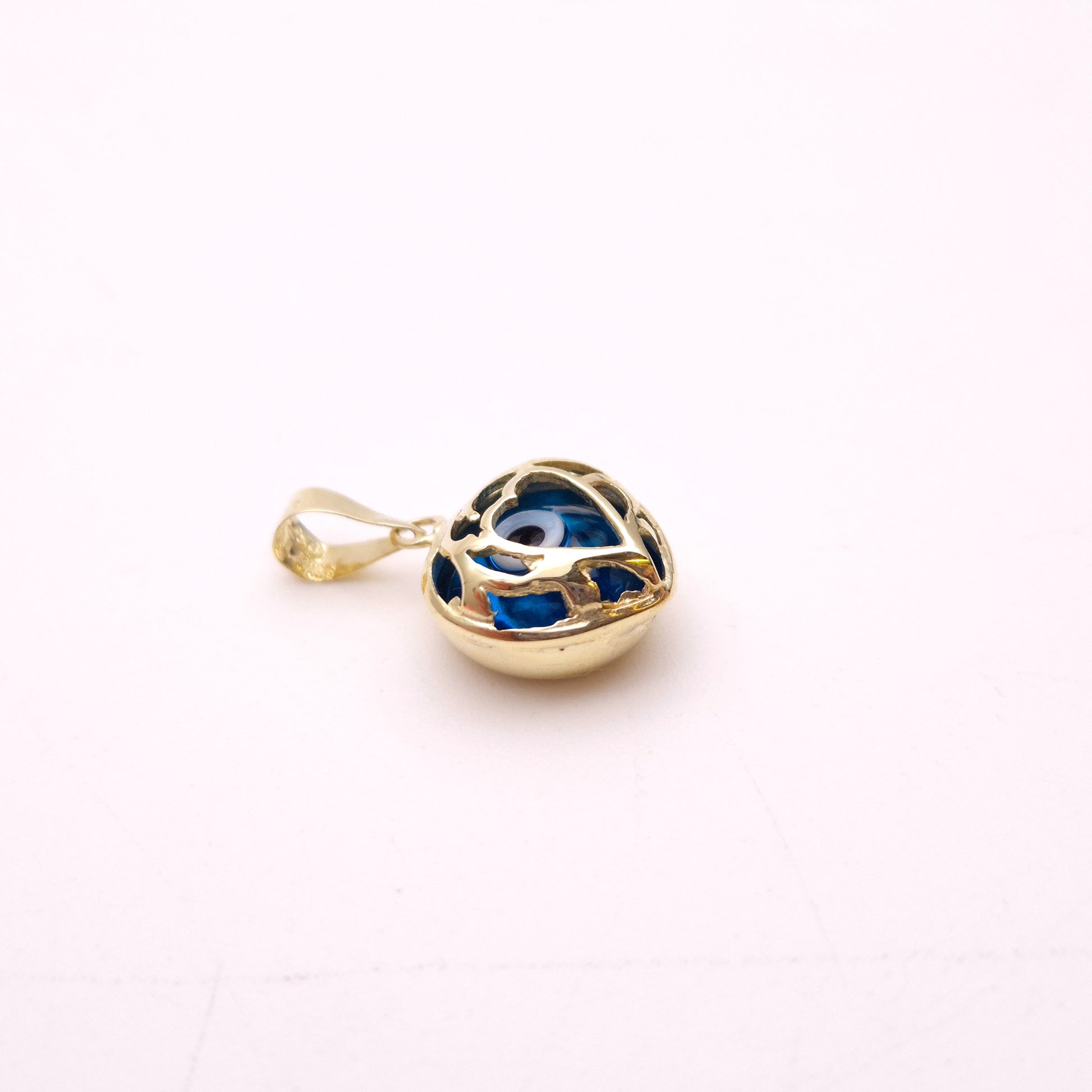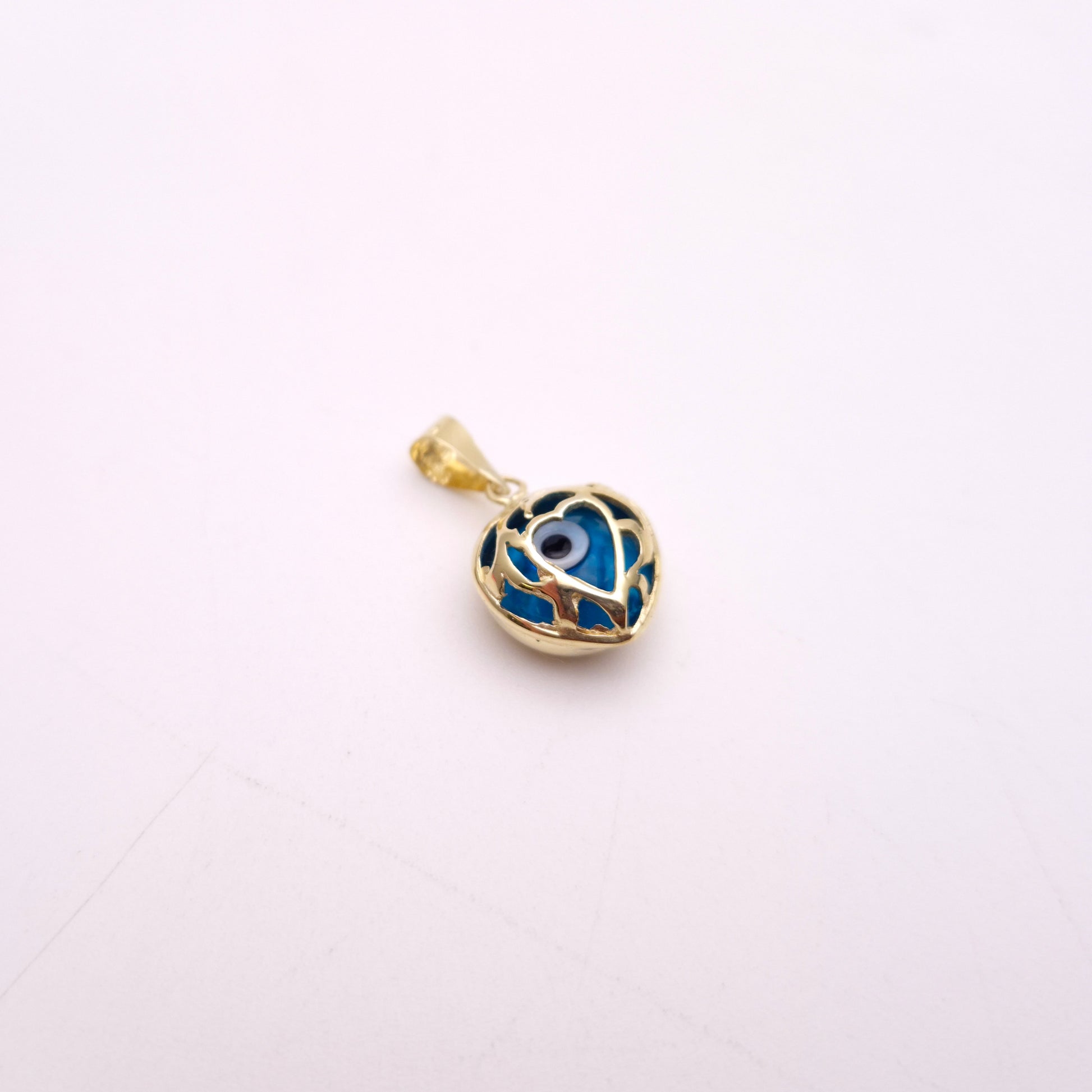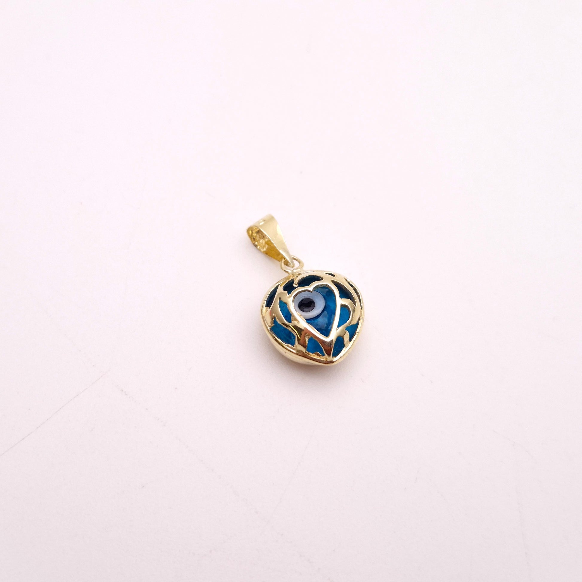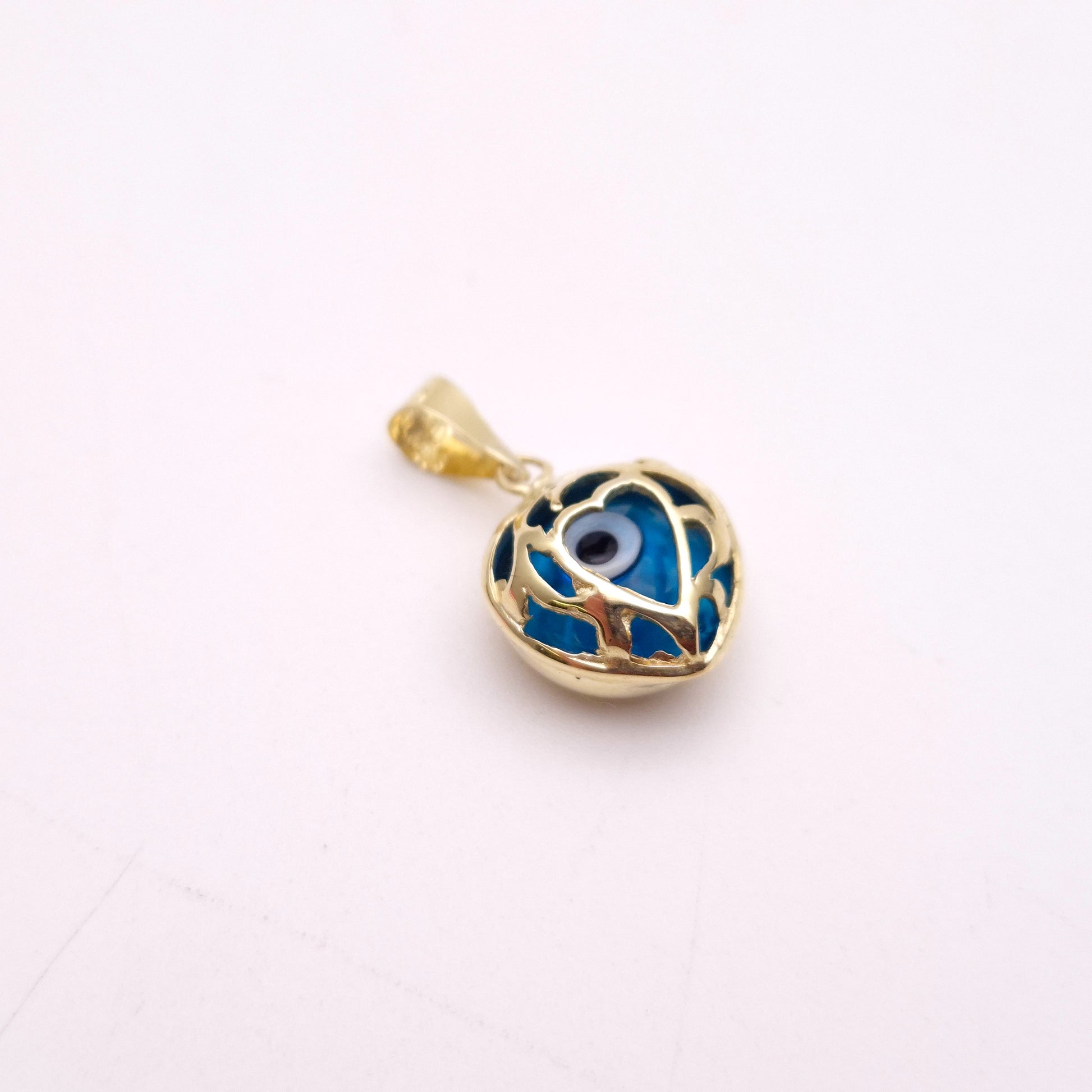 The focal point of the pendant is a vibrant blue evil eye, crafted from smooth glass or enamel, with the iconic concentric circles of blue and black, centred by a dark pupil. This protective symbol is beautifully encased within a highly polished 14ct yellow gold heart-shaped cage or filigree, which adds intricate detail and a romantic touch. The openwork design allows the striking blue of the evil eye to truly stand out, while the warm glow of the gold provides a luxurious frame.
