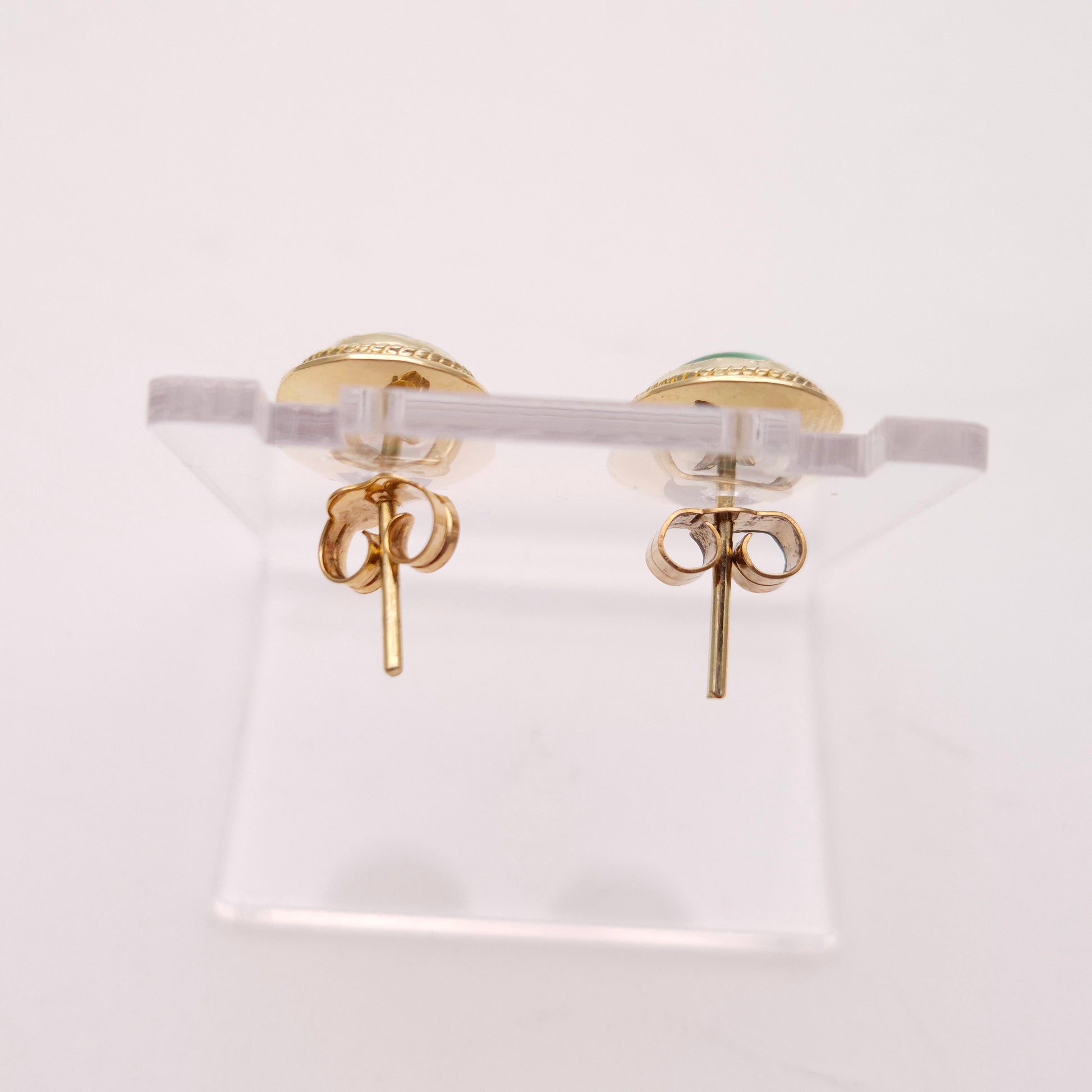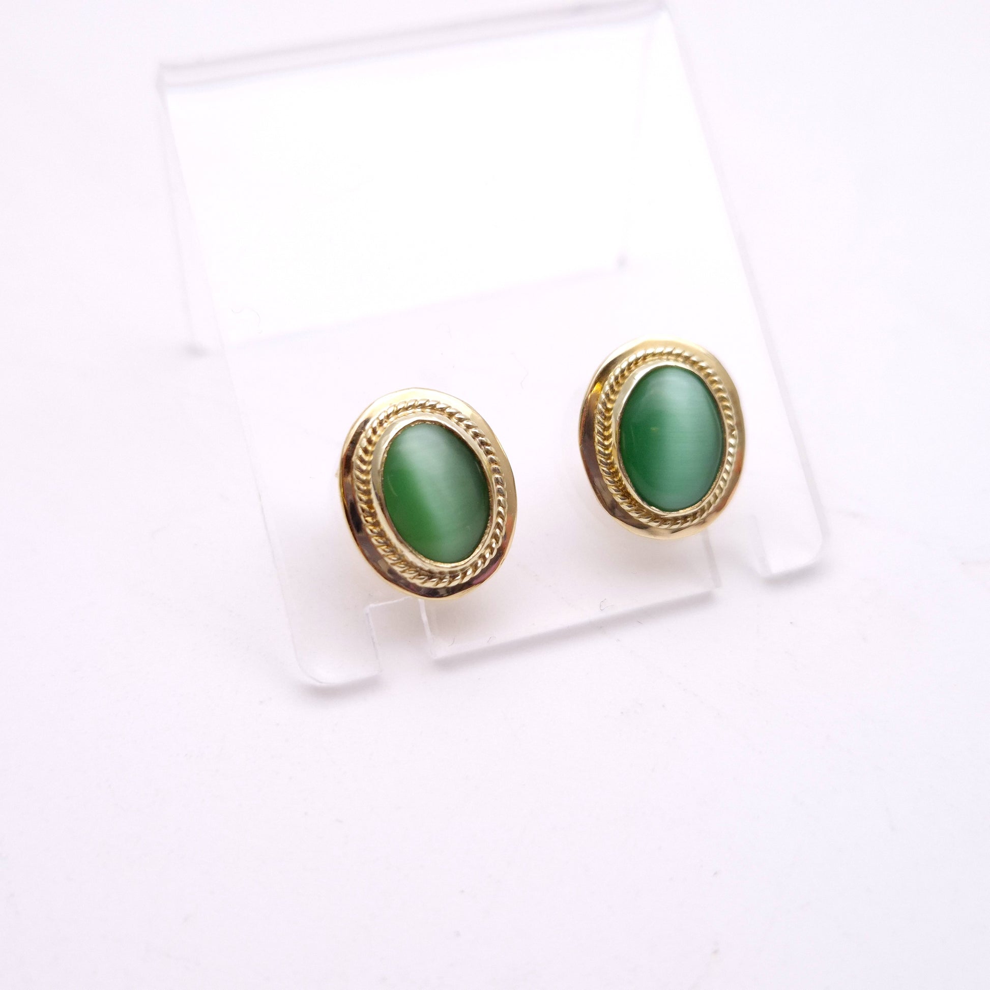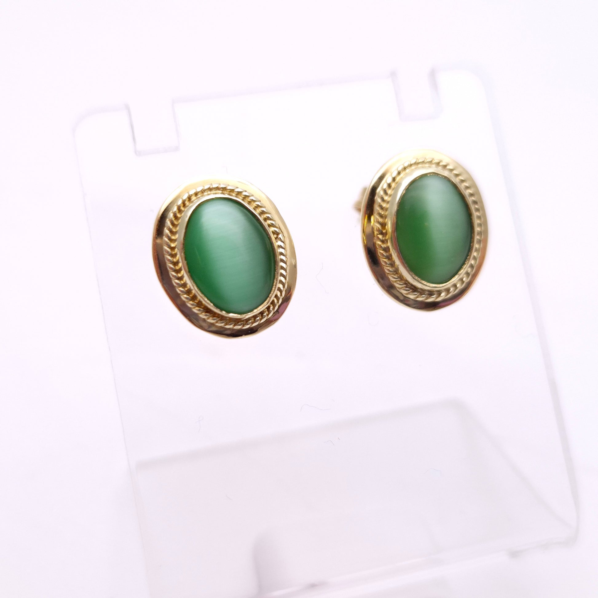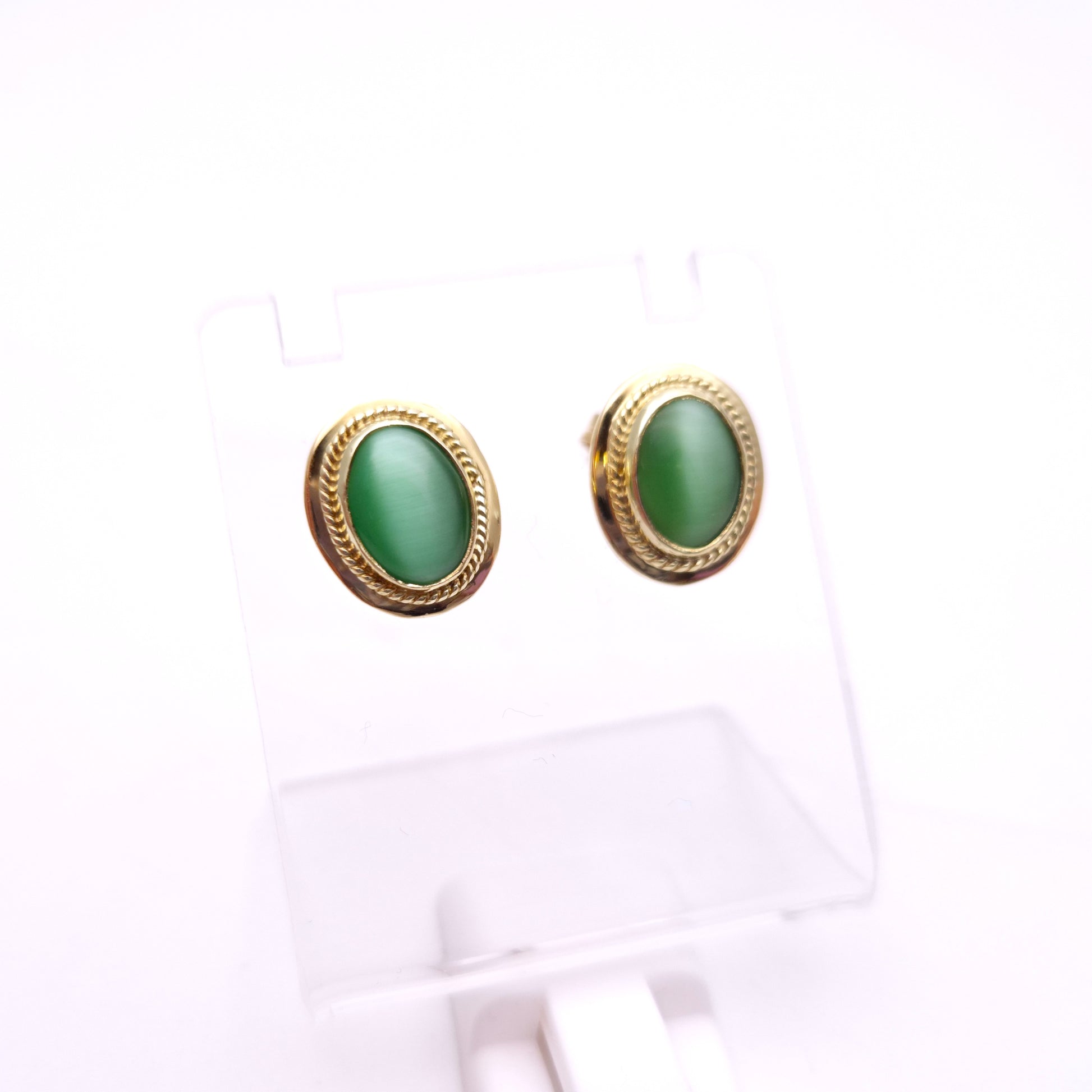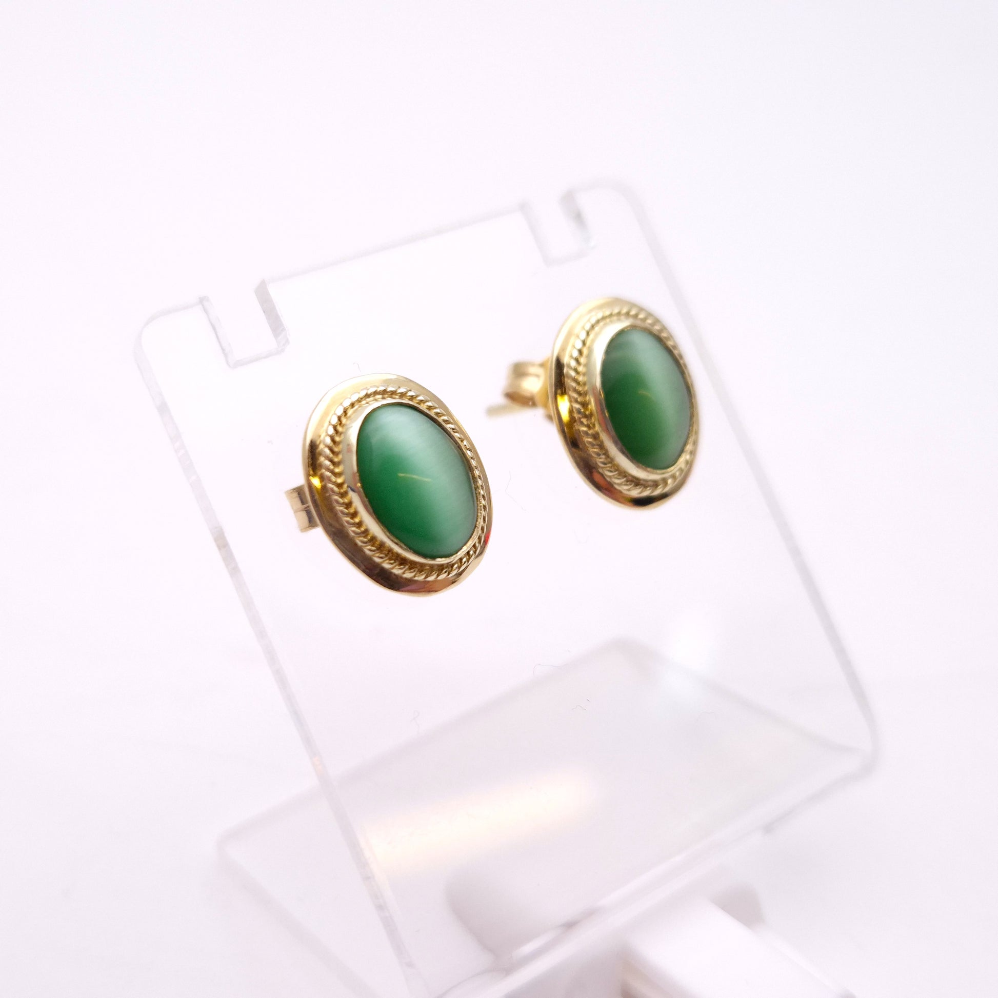 14ct Yellow Gold Green Agate Cats Eye Stud Earrings