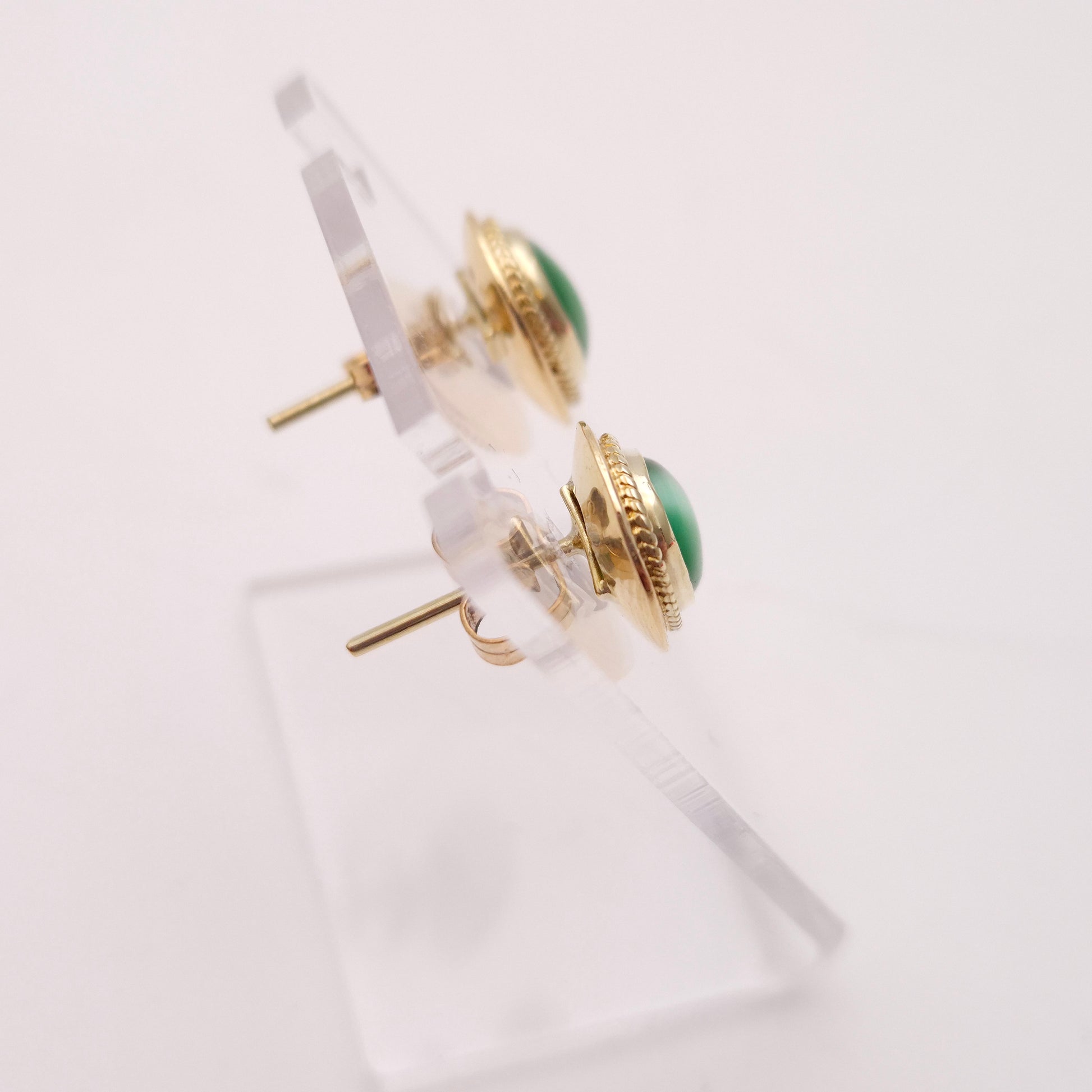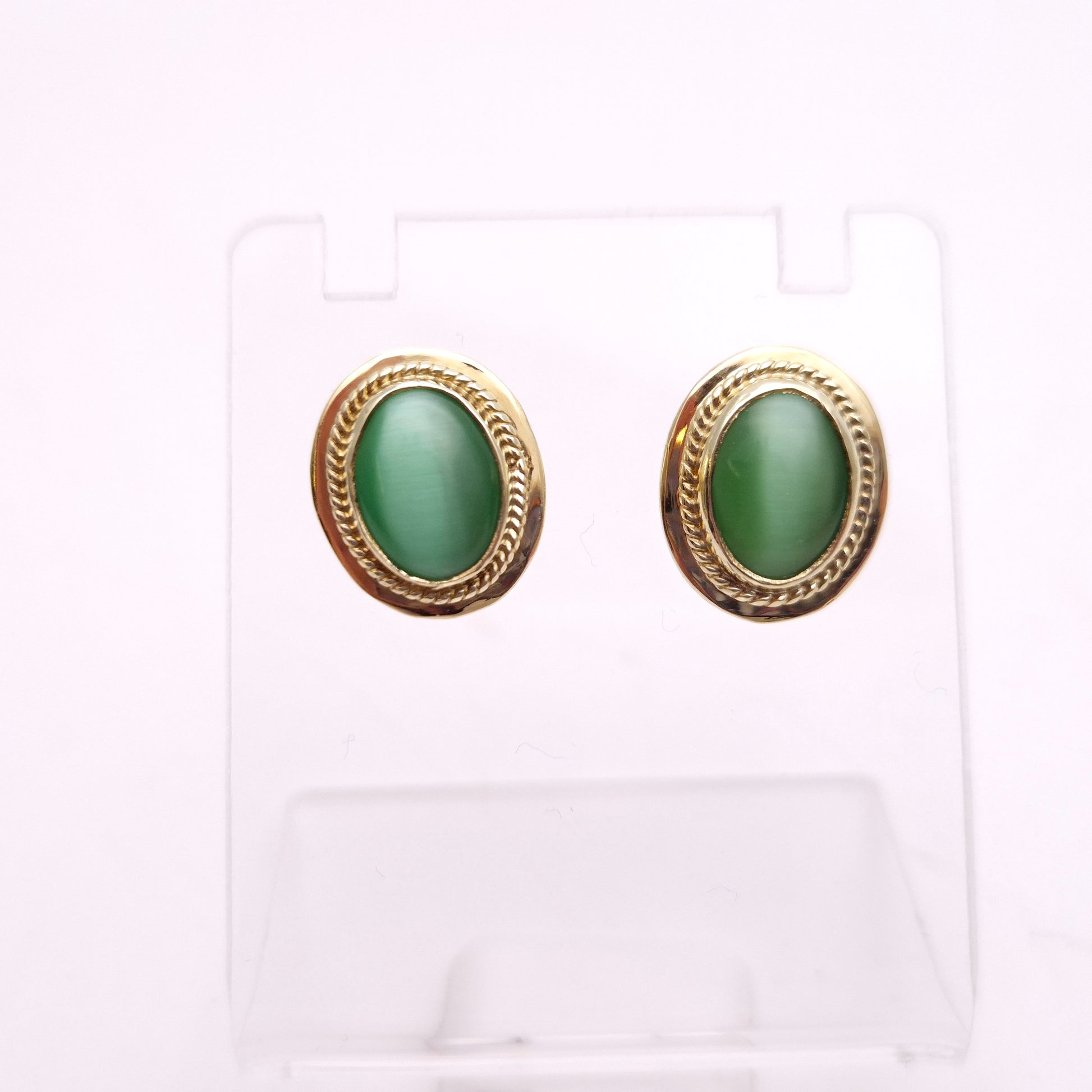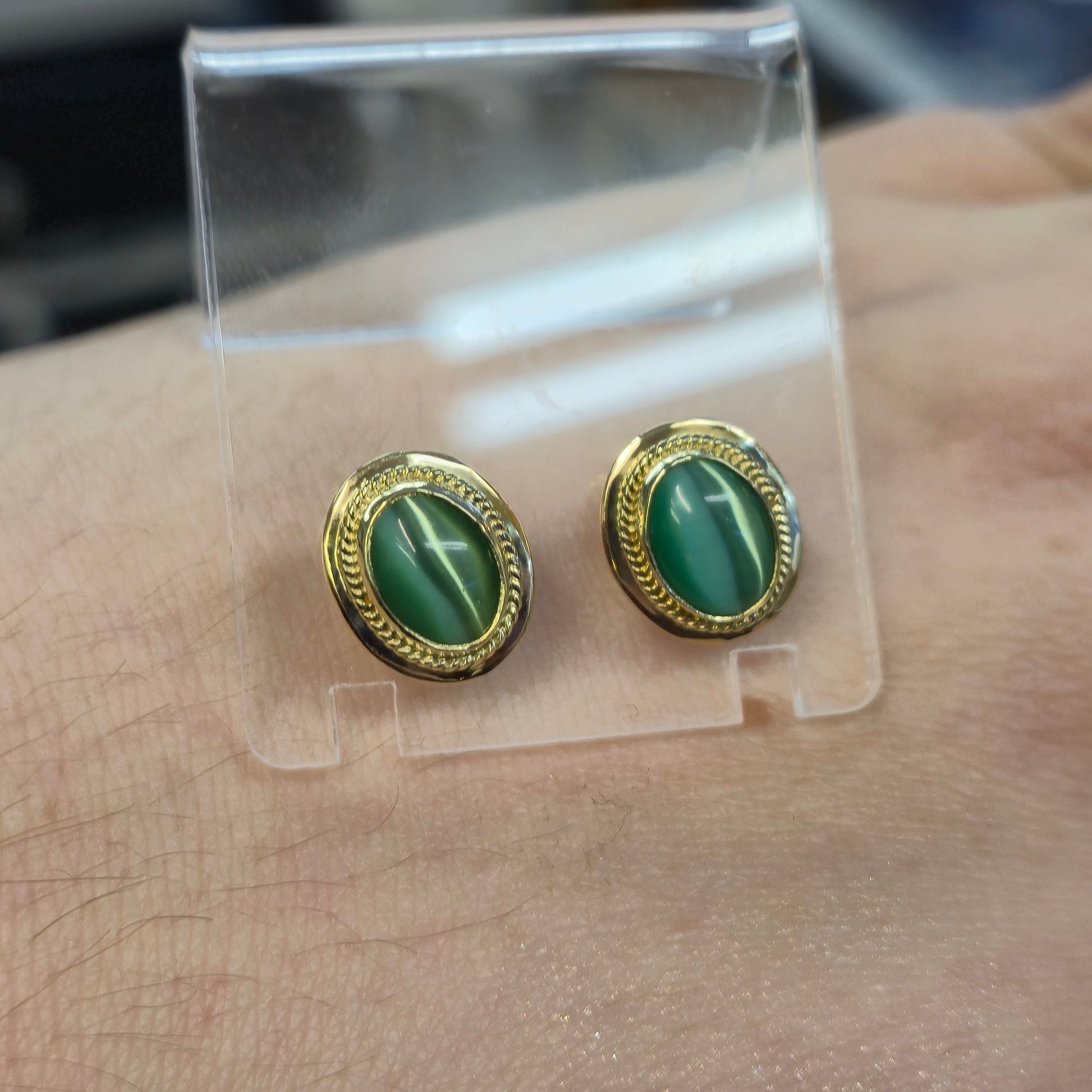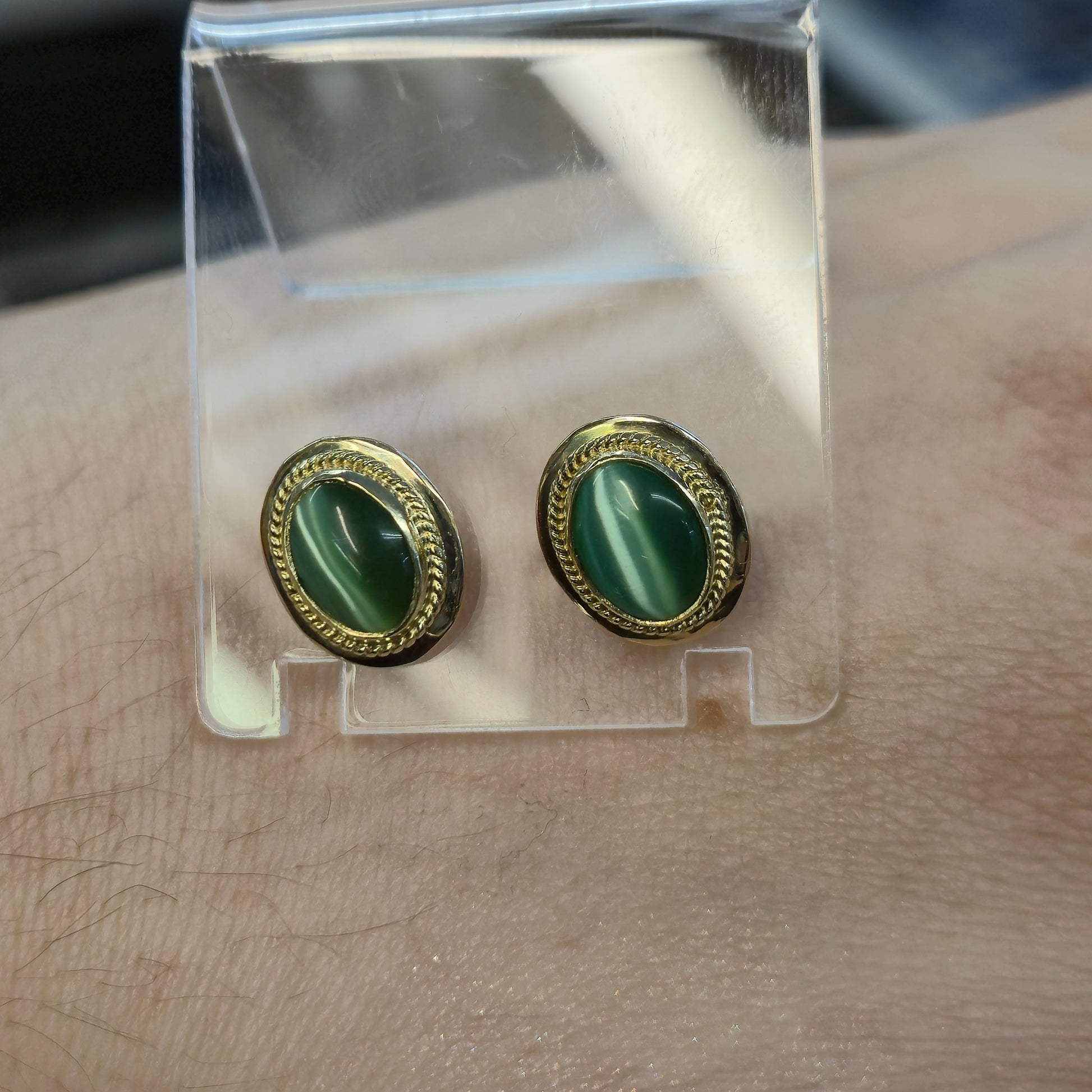 These exquisite stud earrings feature striking oval-shaped green agate cabochons, known for their captivating "cat's eye" effect, set within luxurious 14ct yellow gold. Each earring showcases a smoothly polished green agate stone with a distinct band of light across its surface, creating the mesmerizing chatoyancy that gives it its name.