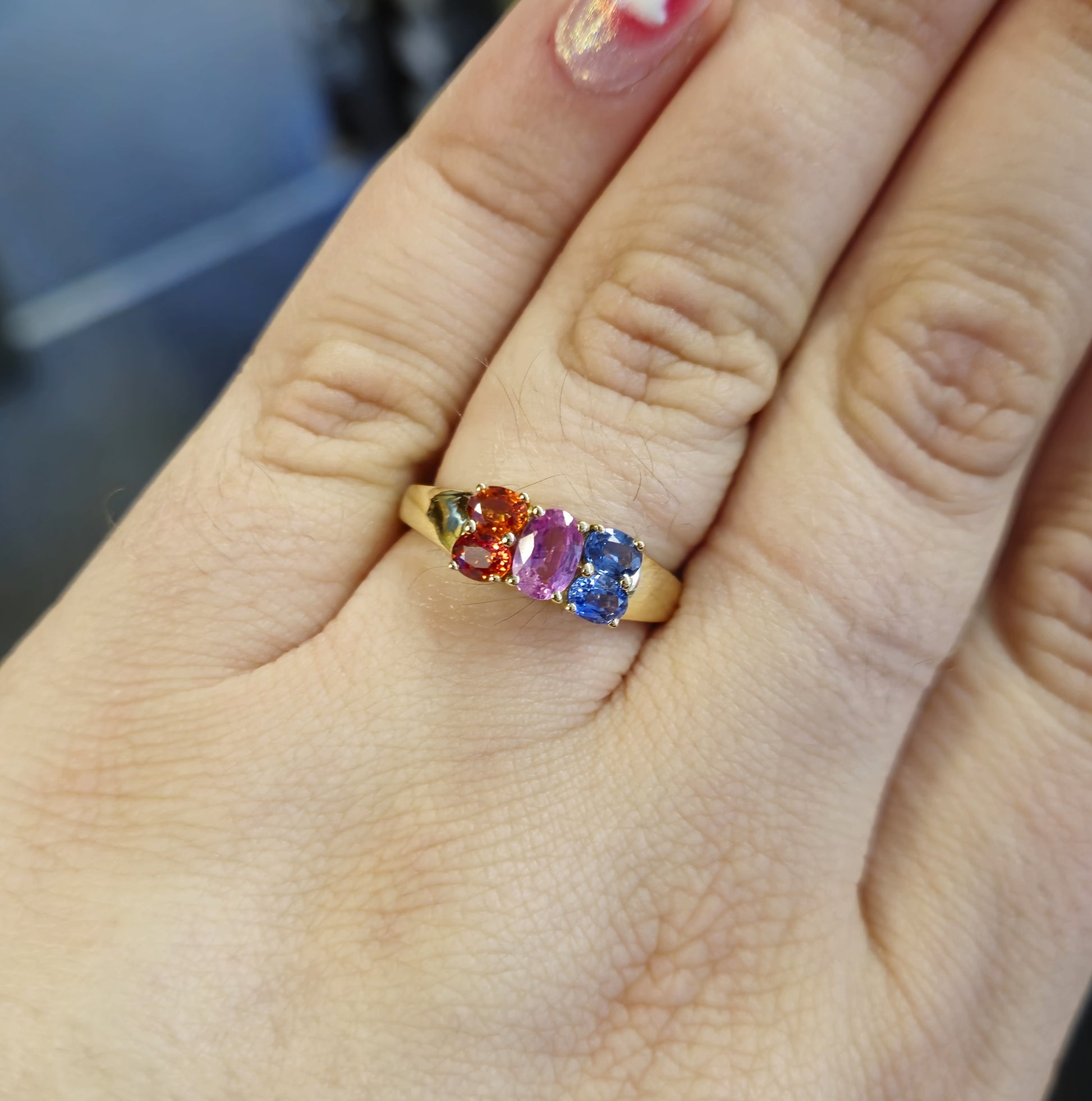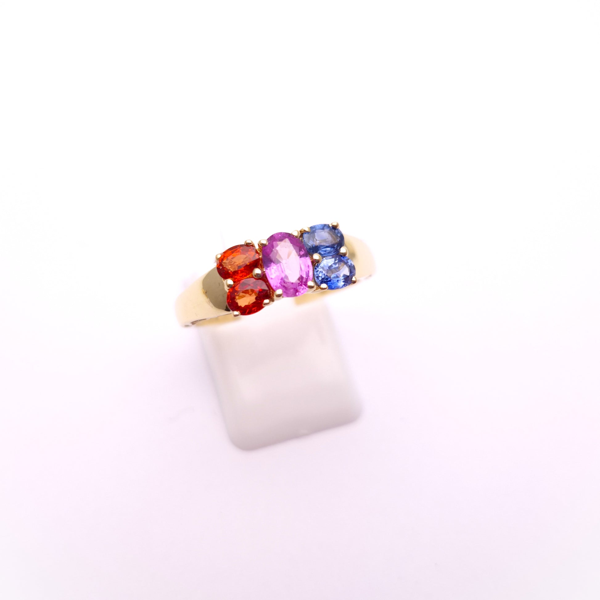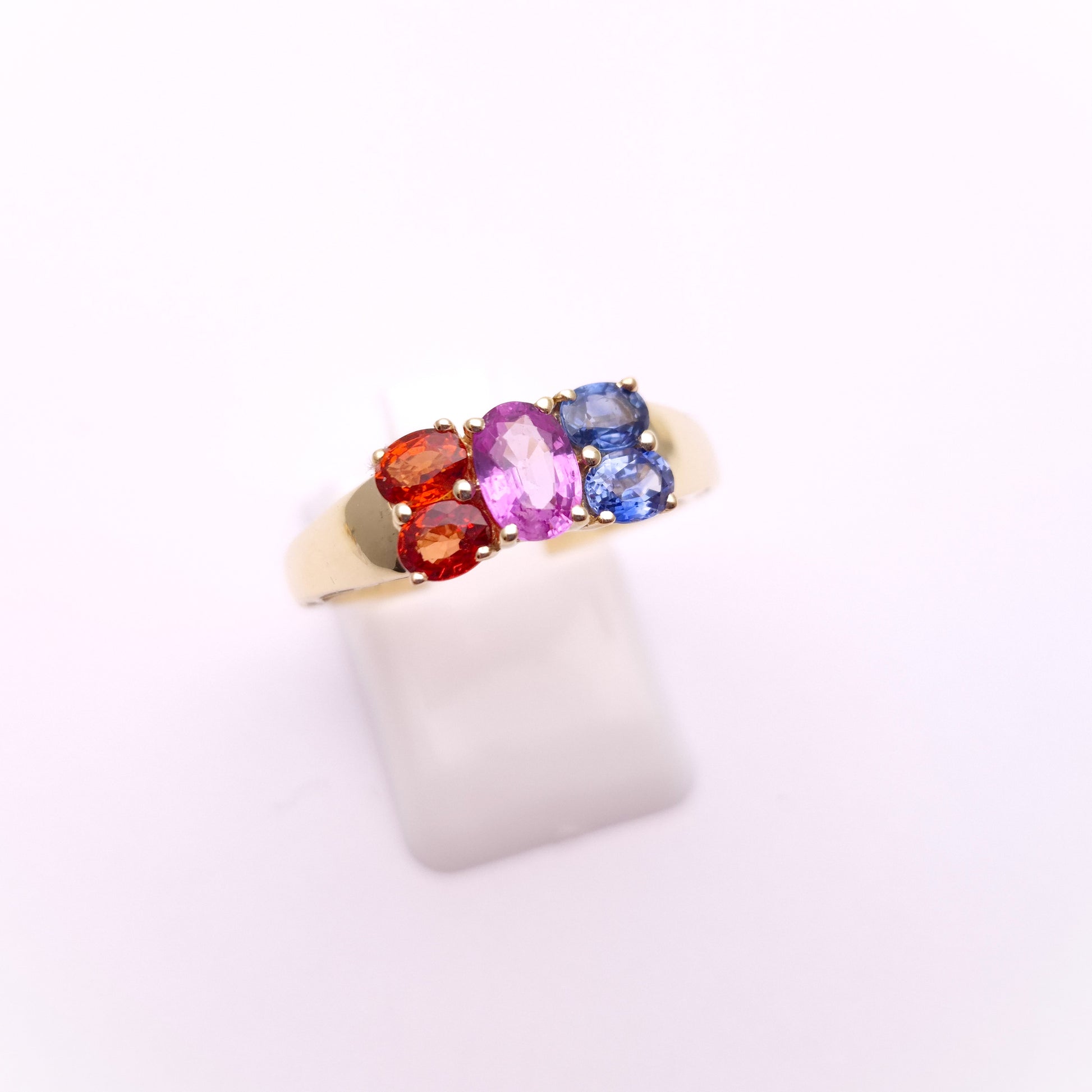 This eye-catching ring features a vibrant display of colour with five beautiful, oval-cut sapphires set in a warm 14ct yellow gold band. The design showcases a delightful arrangement of multi-coloured sapphires, including rich blues, vibrant pinks, and fiery oranges, creating a striking and harmonious gemstone medley.