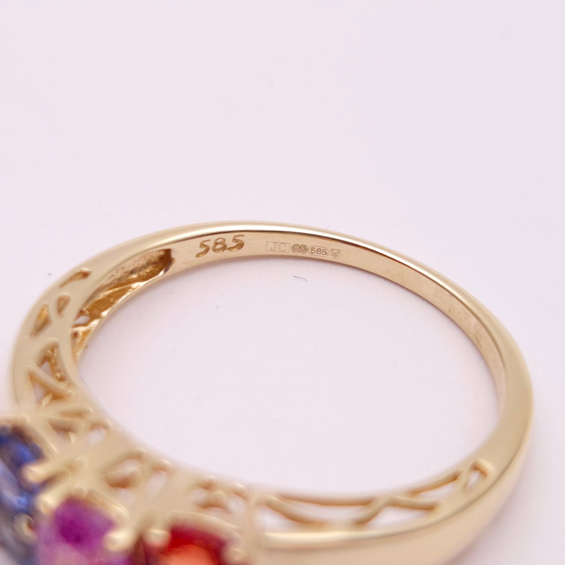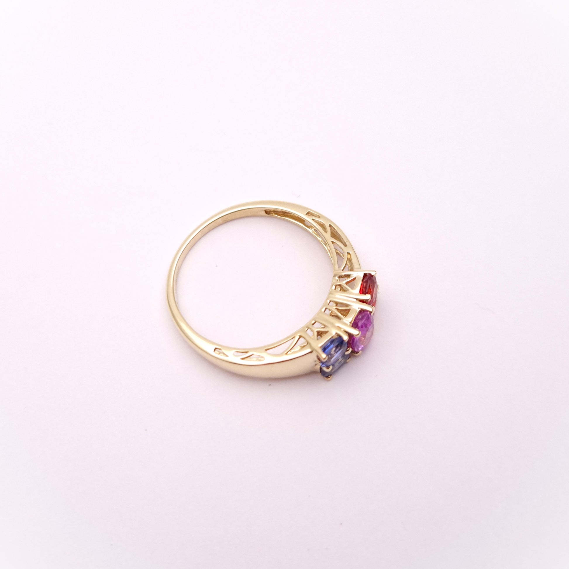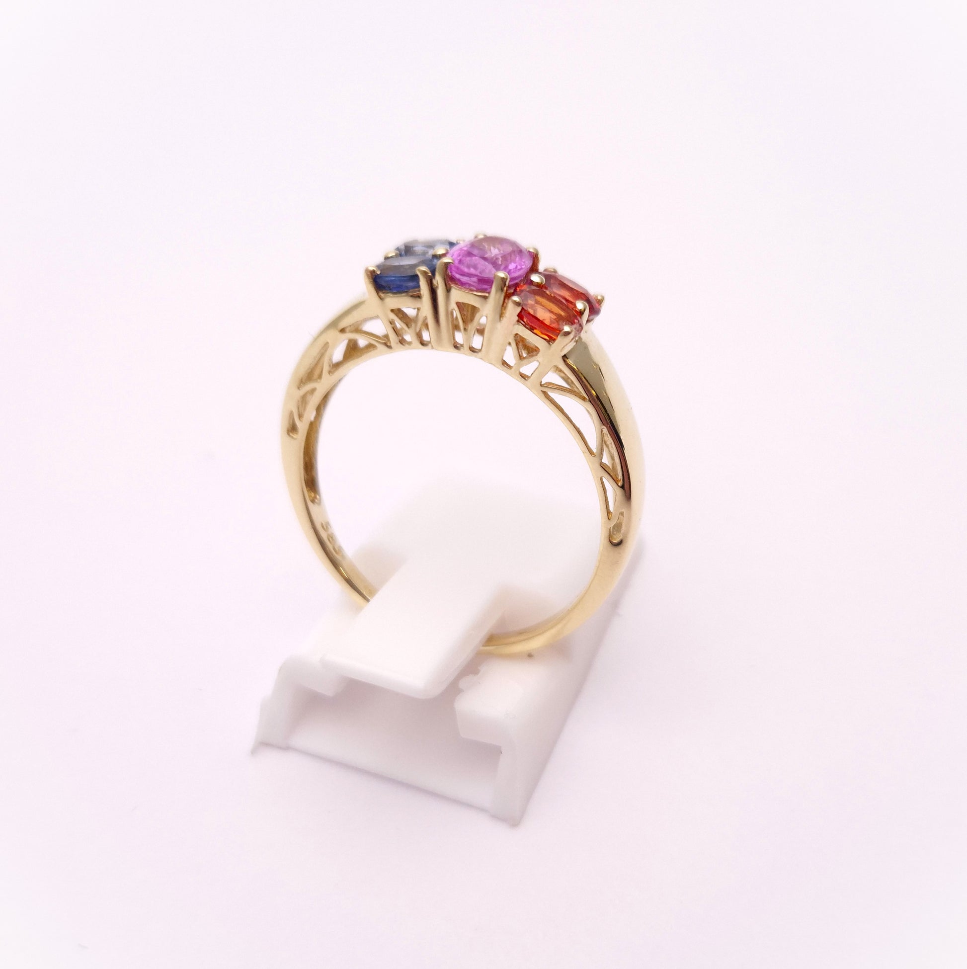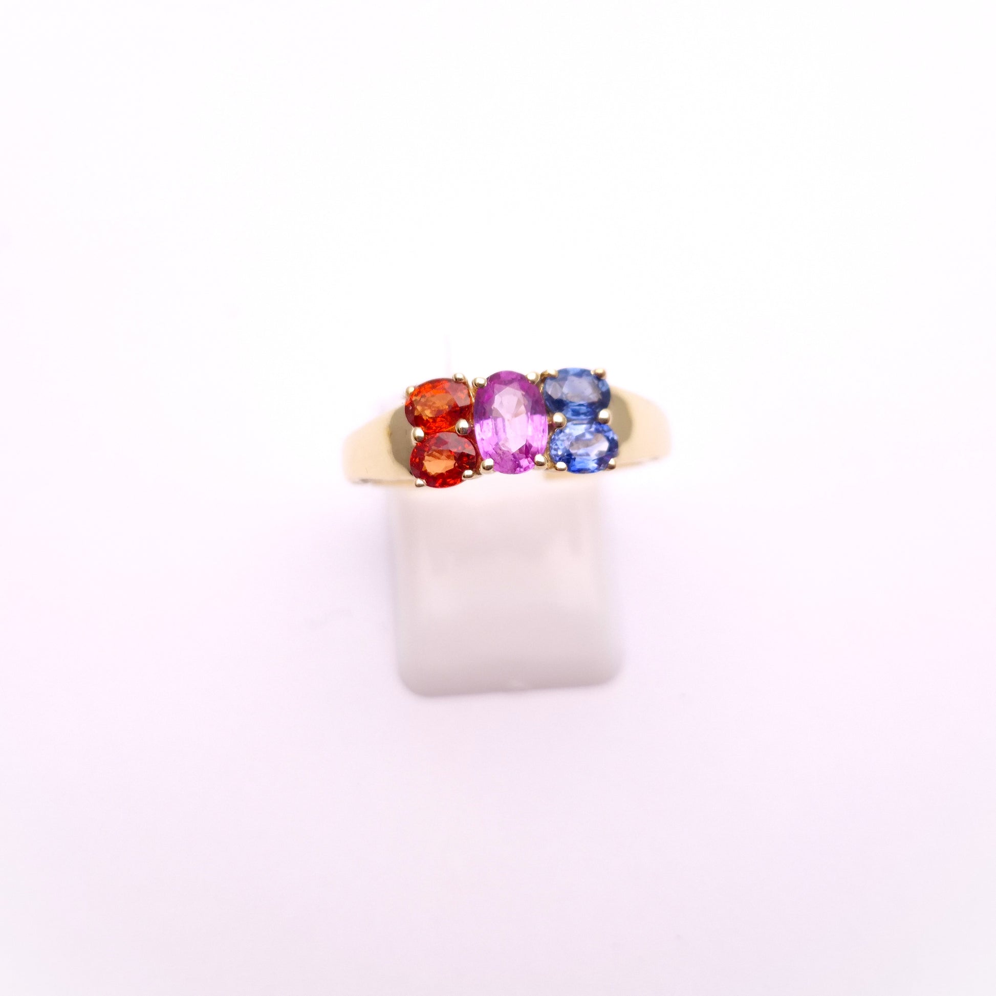This eye-catching ring features a vibrant display of colour with five beautiful, oval-cut sapphires set in a warm 14ct yellow gold band. The design showcases a delightful arrangement of multi-coloured sapphires, including rich blues, vibrant pinks, and fiery oranges, creating a striking and harmonious gemstone medley.