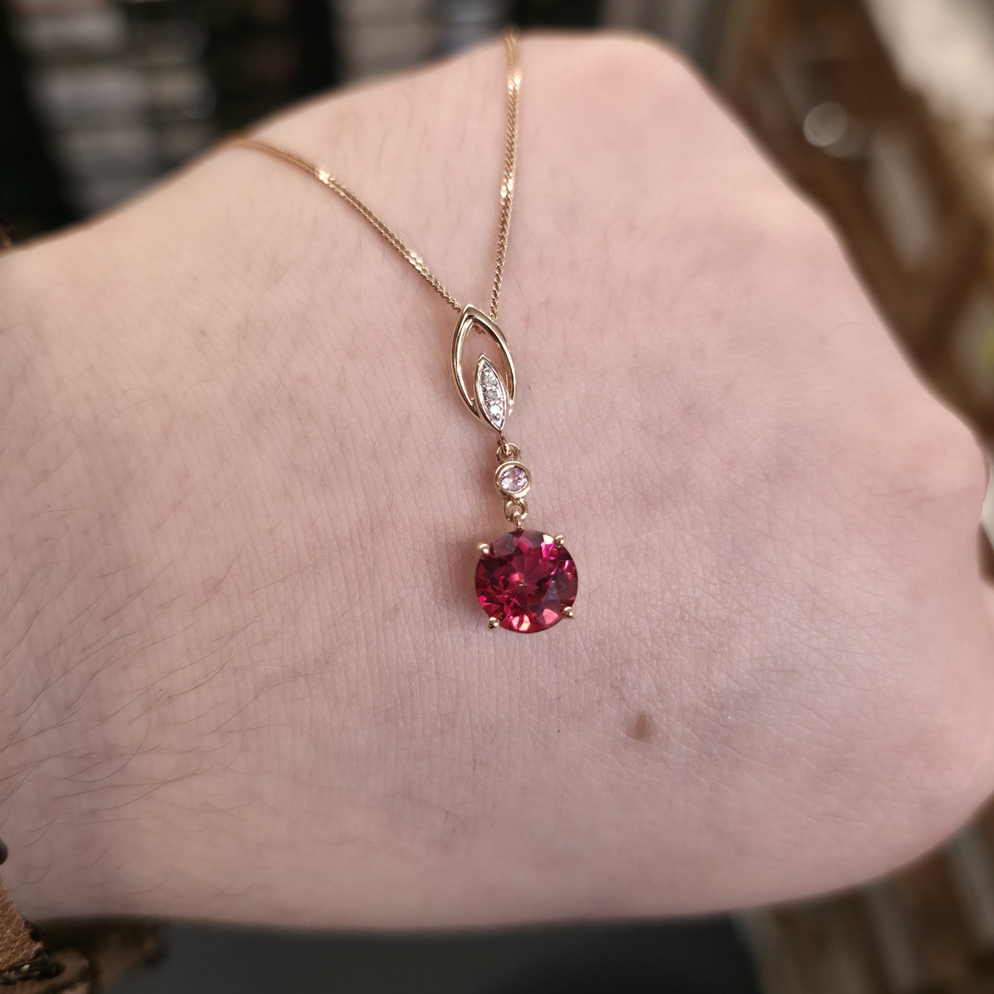 14ct Yellow Gold Red and Pink Topaz And Diamond Pendant on 9ct Gold Curb Chain