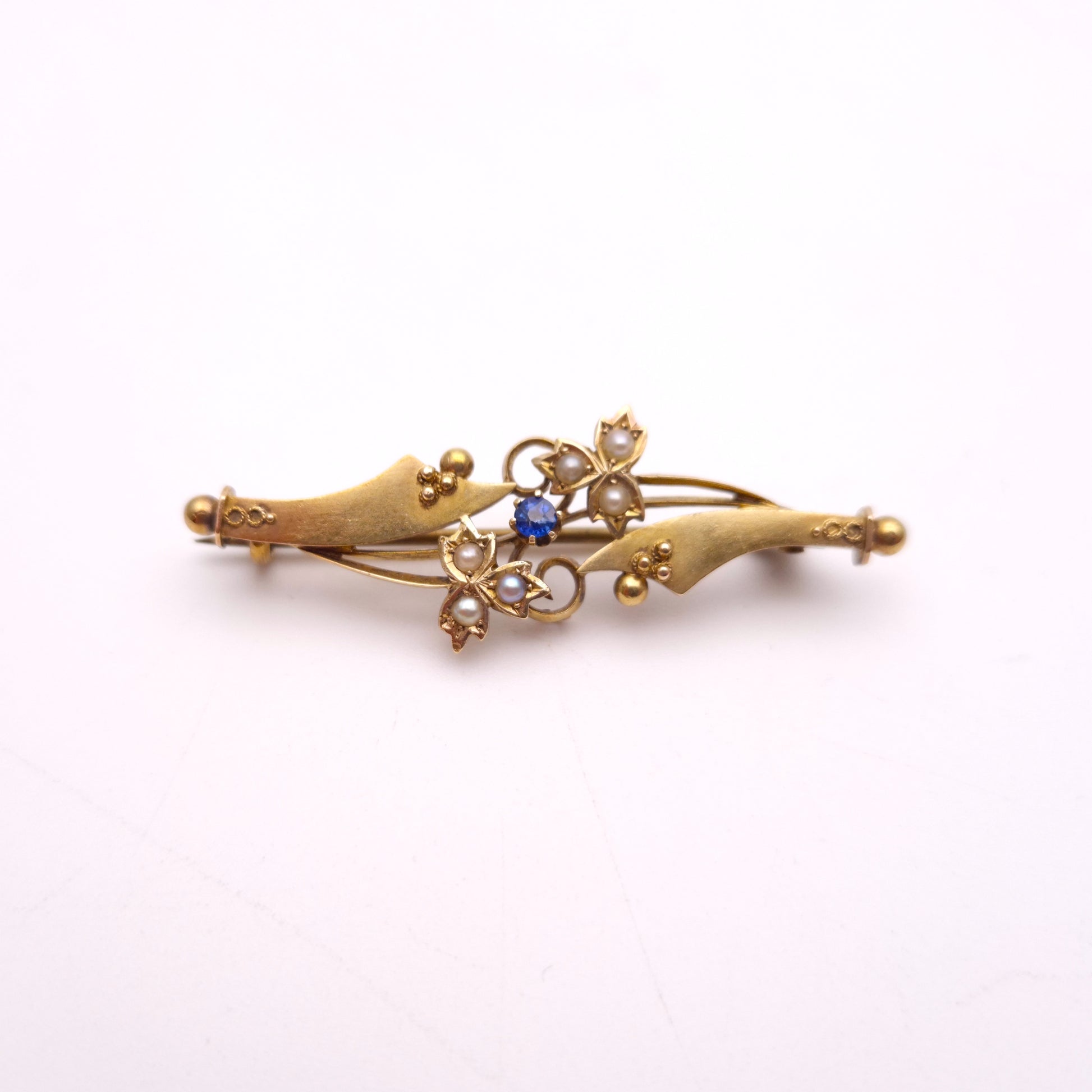 The brooch showcases a graceful, elongated bar design, elegantly adorned with intricate floral and foliate elements. At its heart, a vivid blue sapphire, adding a captivating pop of intense colour. This central gem is beautifully complemented by delicate seed pearls, meticulously set to form charming blossom clusters or subtle accents amidst the flowing gold work.