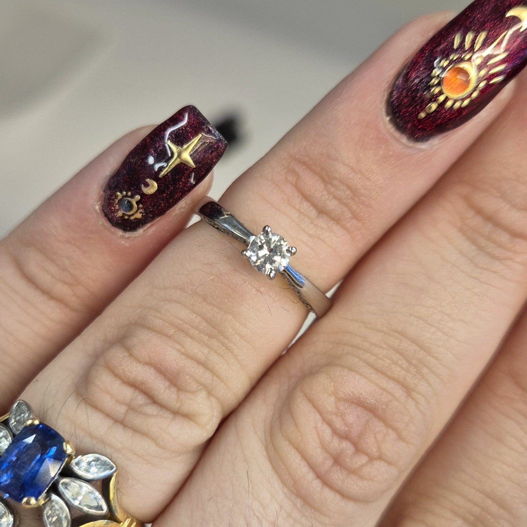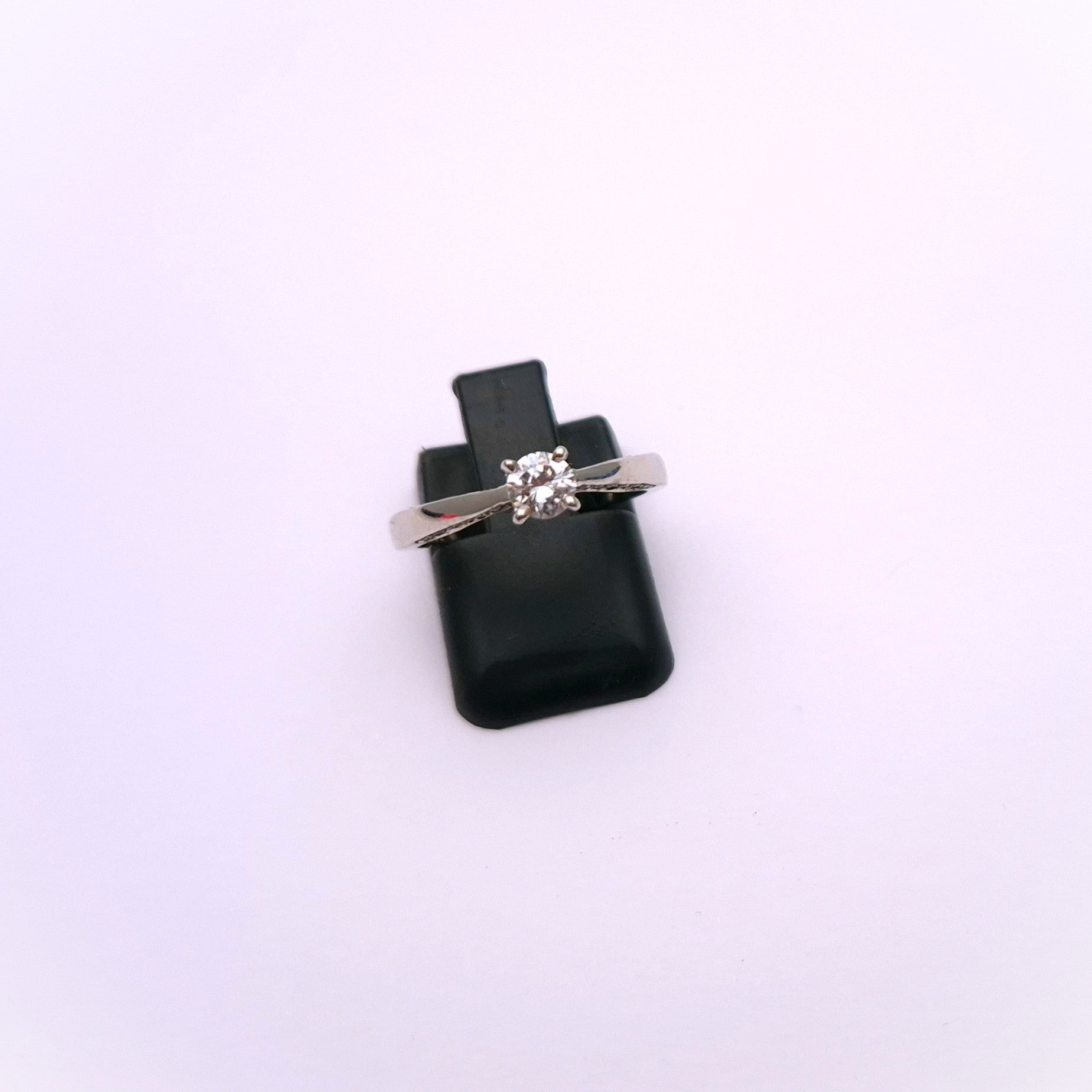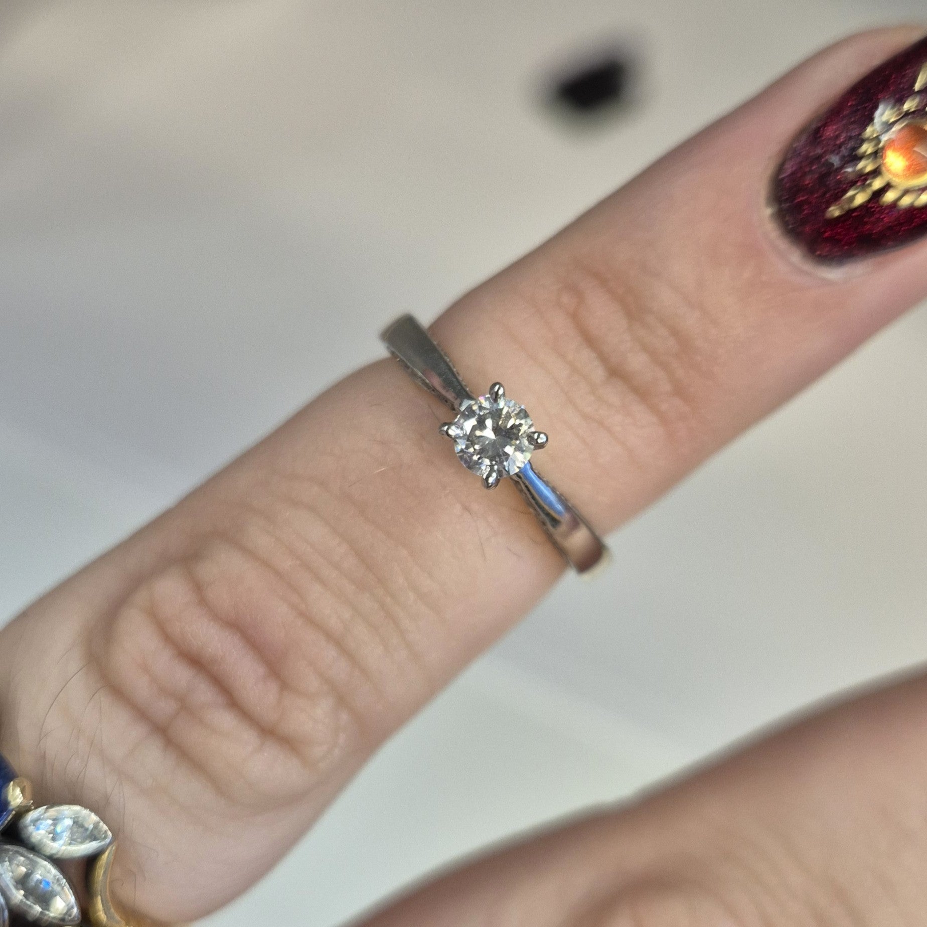 This Elegant classic style ring is made of 18ct white gold and is a simple solitaire style ring with a round cut diamond set at the centre of the ring with 4 claws. From the front that is all it appears but when looking from the side you see hidden diamonds set into the shoulders on both sides of the band giving an extra bit of sparkle without looking over the top from the front giving a total carat weight of 0.4ct.