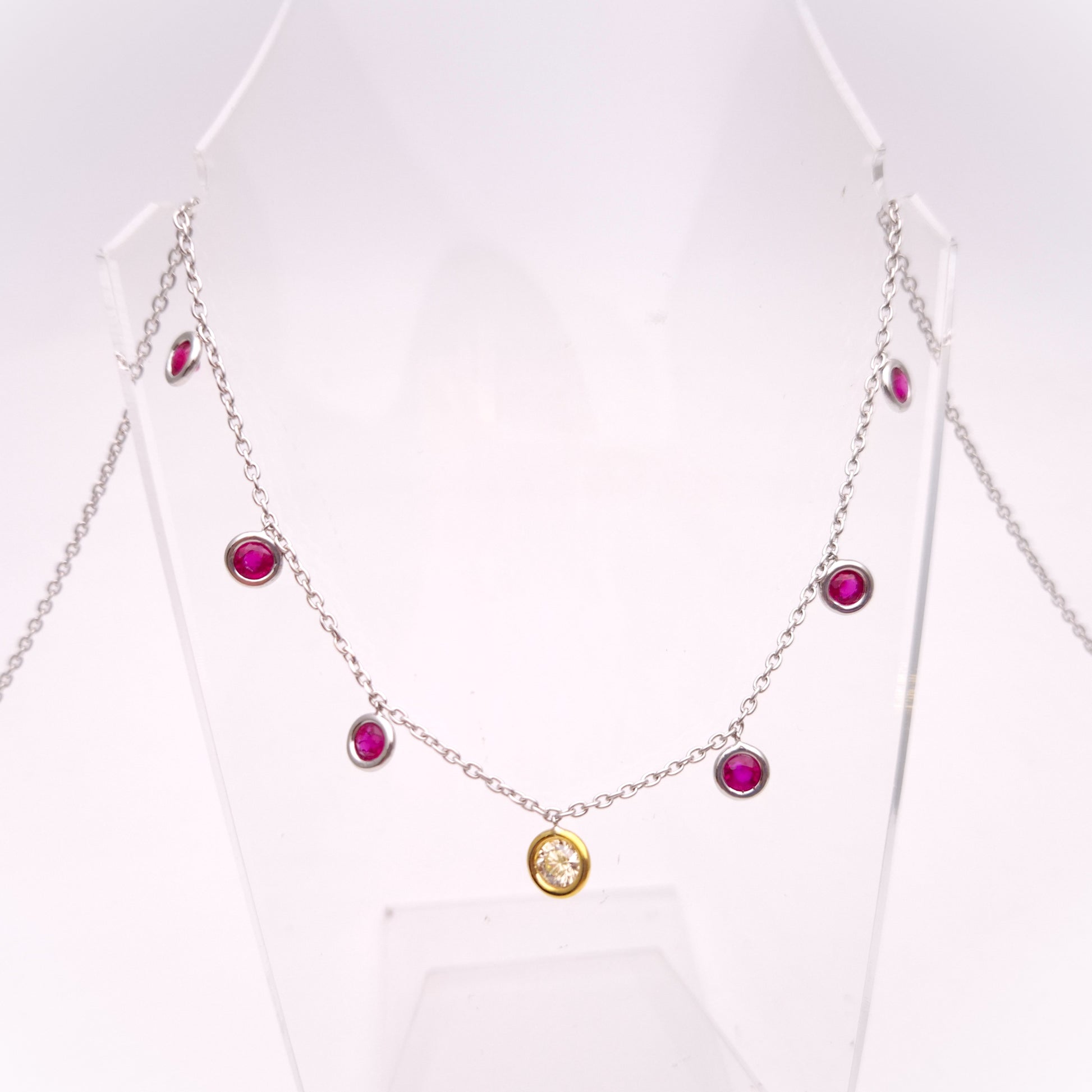 The necklace features a fine white gold chain, from which multiple gemstones suspended in collet or bezel settings, giving it a stylish "floating" or "station" look. The design is centred around a bright diamond set in yellow gold and is accented by six bezel-set rubies, which are a striking, deep pink-red colour and are evenly distributed along the chain. These vivid rubies add a bold pop of colour and movement.