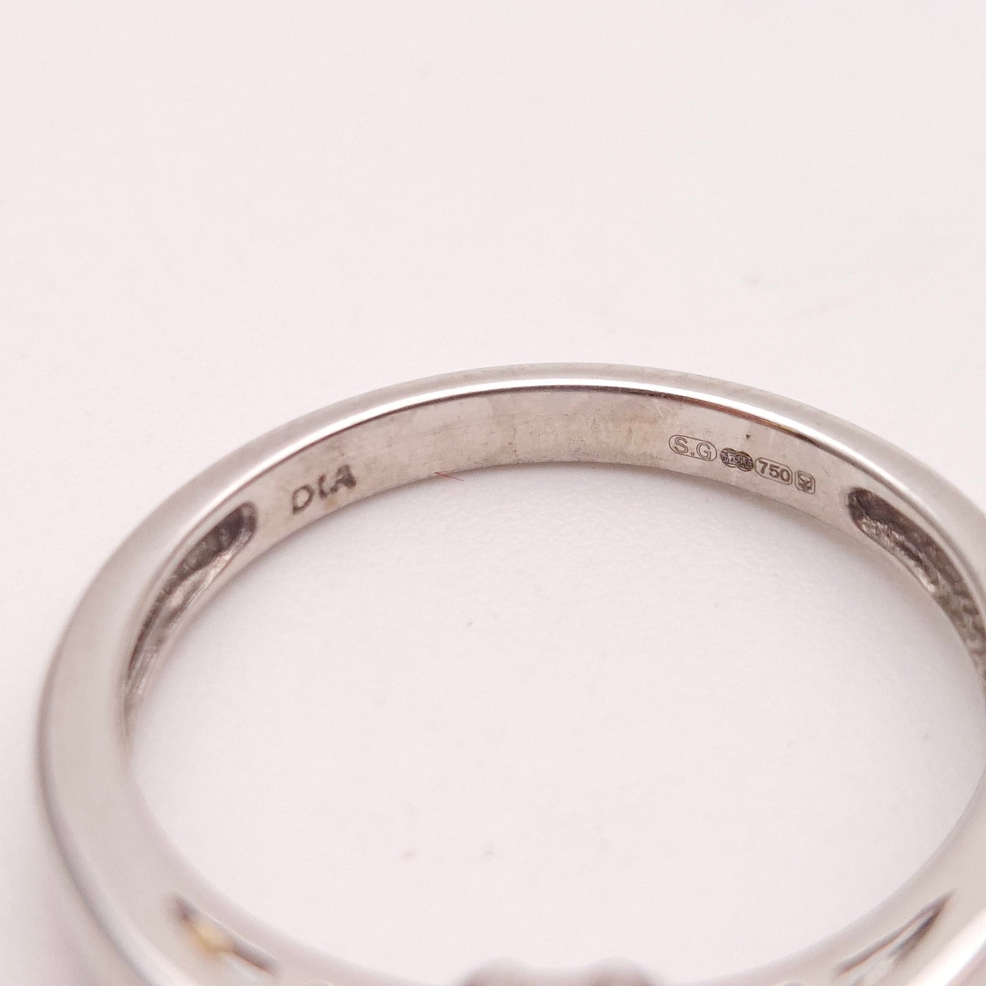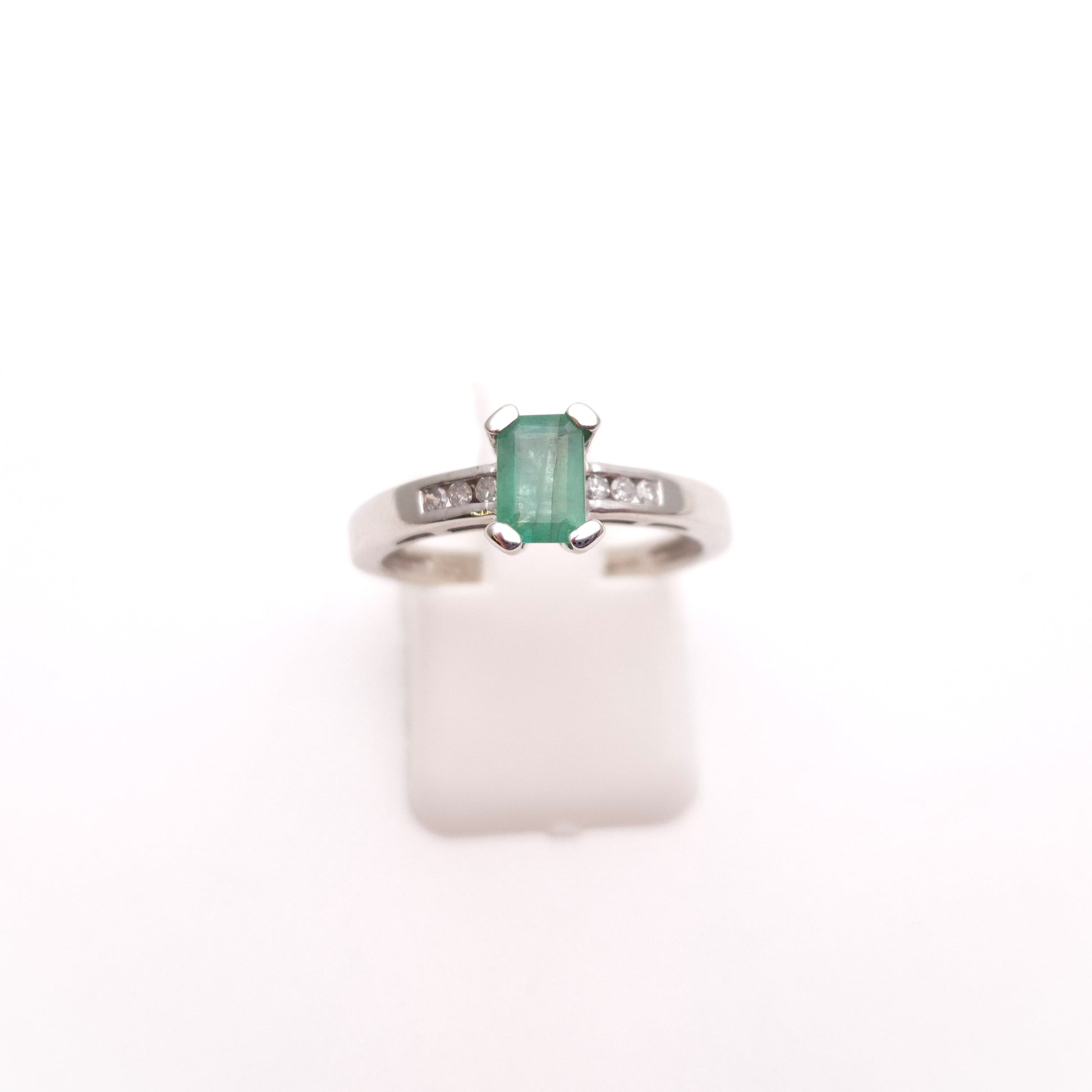 The gold setting is clean, modern, and substantial, constructed in 18-carat white gold. The band tapers gently towards the shoulders, enhancing the focus on the gemstones. This ring is an excellent choice for those who appreciate the classic brilliance of emeralds combined with the sleek luxury of white gold and an understated diamond accent, making it an ideal choice for a memorable engagement ring or a May birthstone gift.