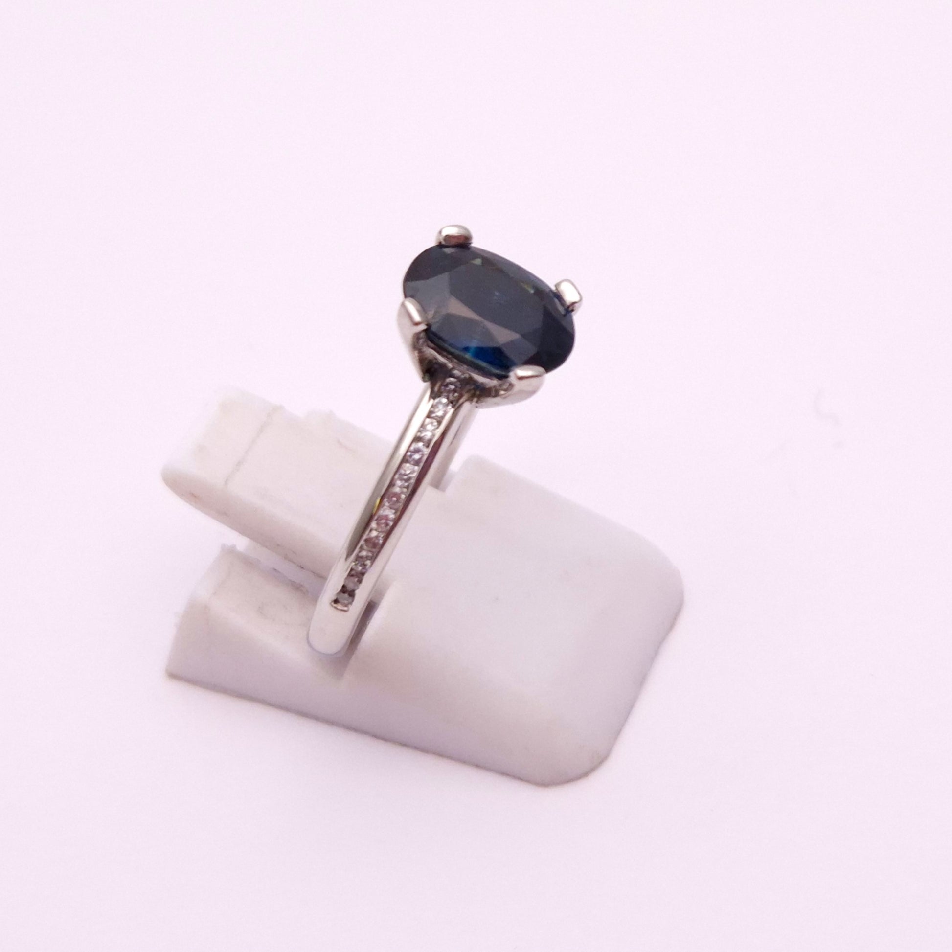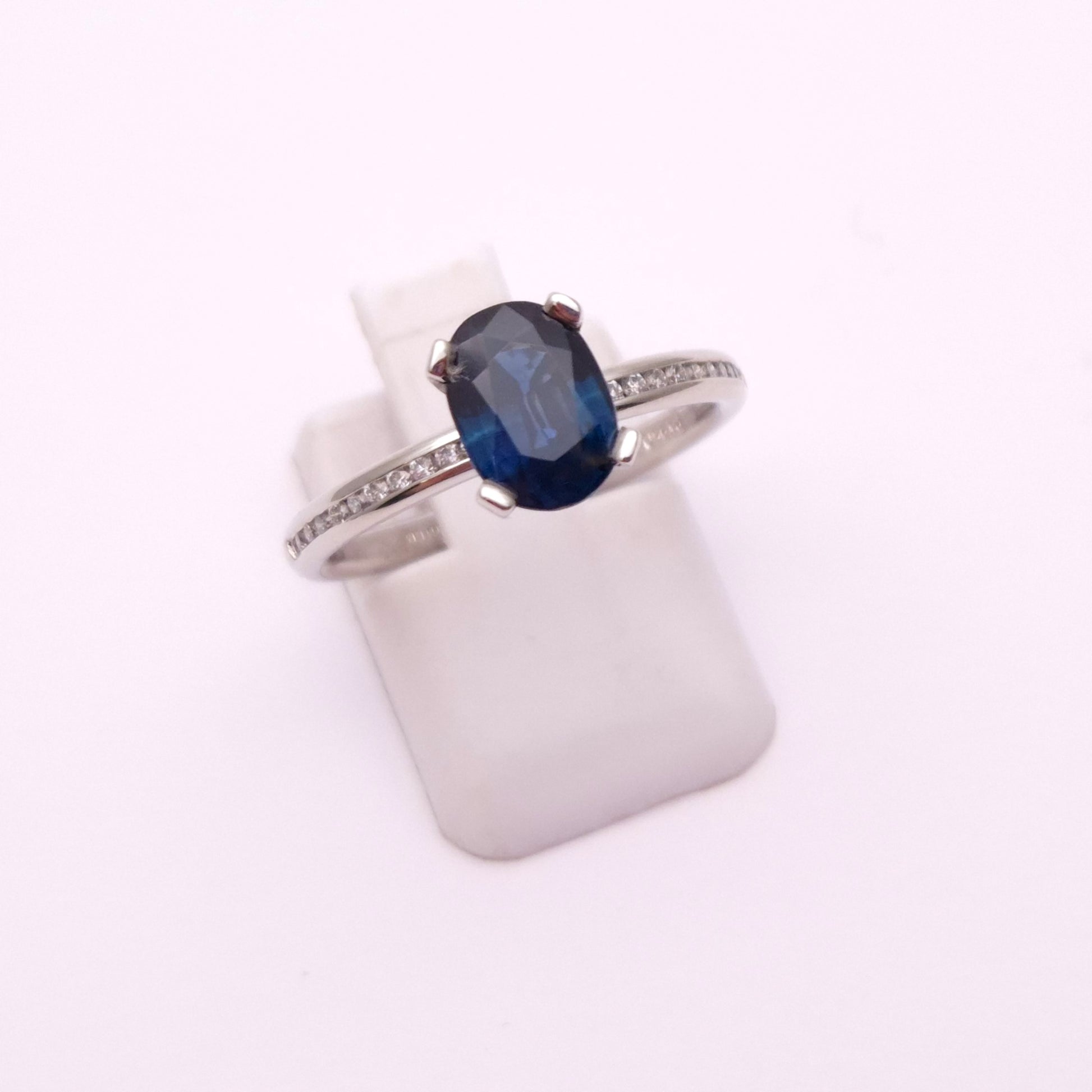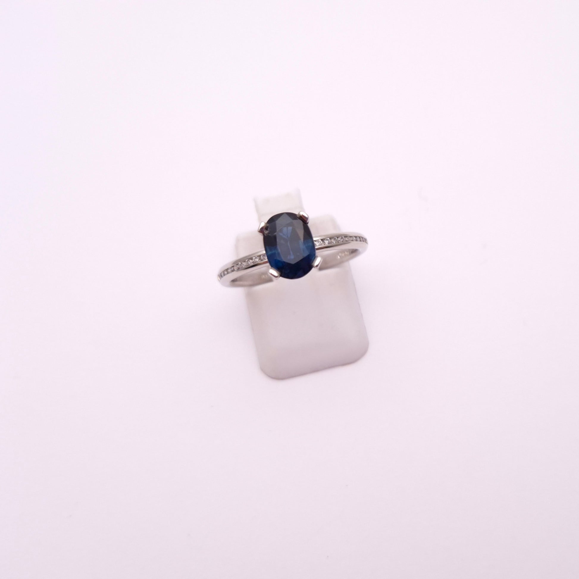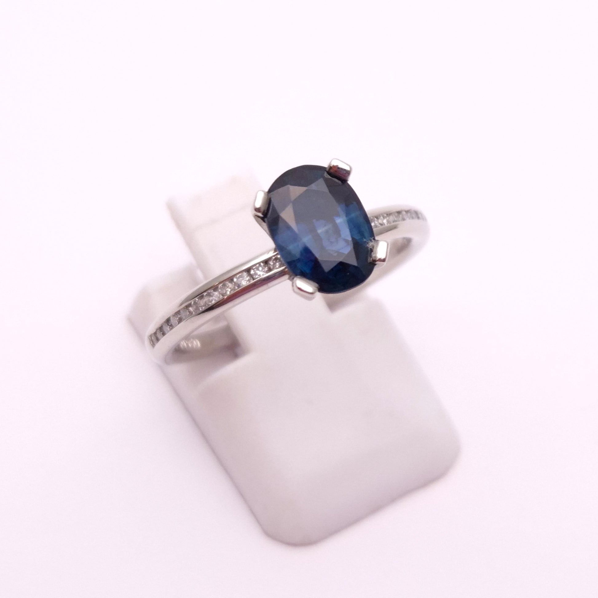 This Stunning ring is made from 18ct white gold. It features a beautiful deep blue oval cut sapphire stone set to the centre of the ring in a solitaire type setting. The shoulders are then channel set with a row of small round cut diamonds which extend down to about half way down the ring.