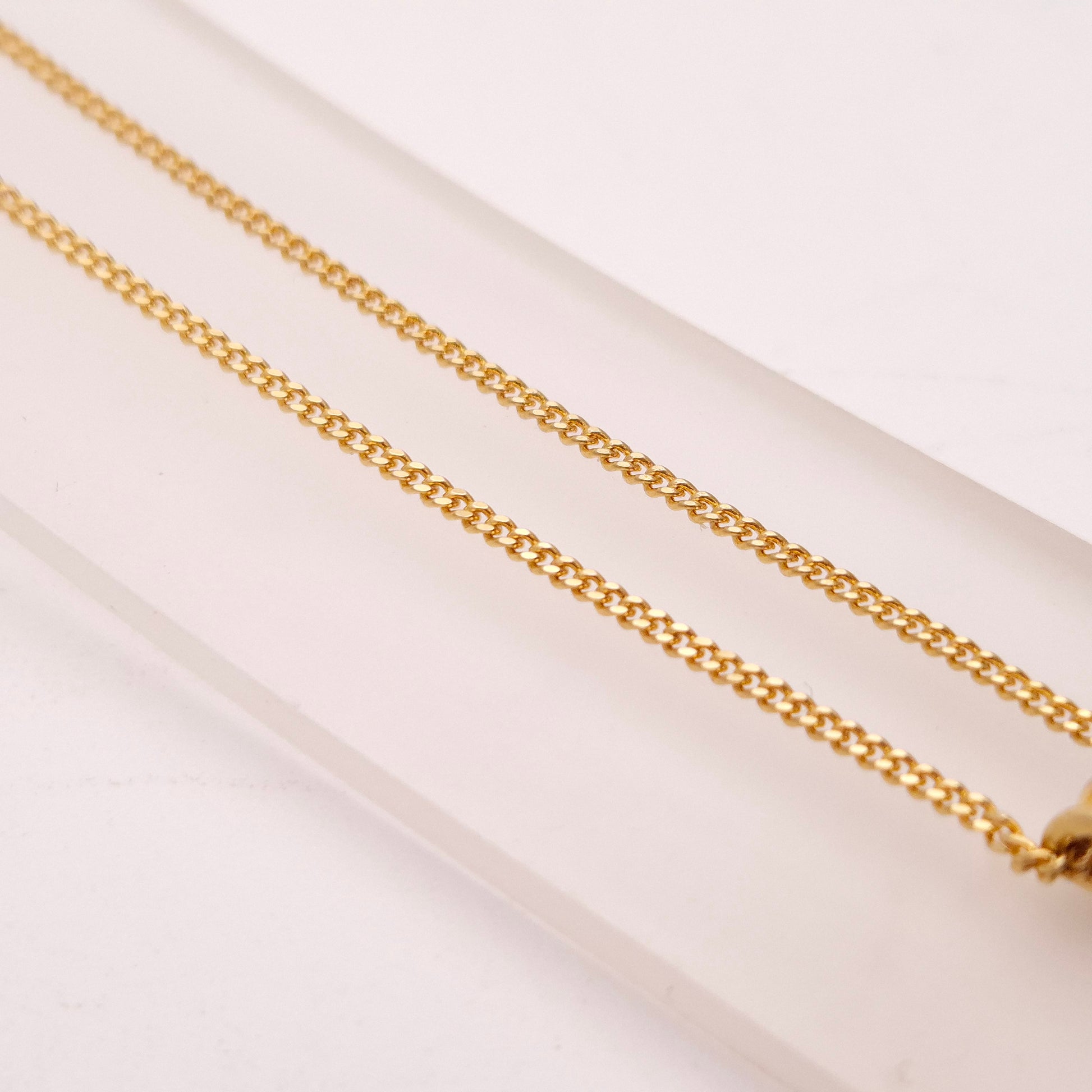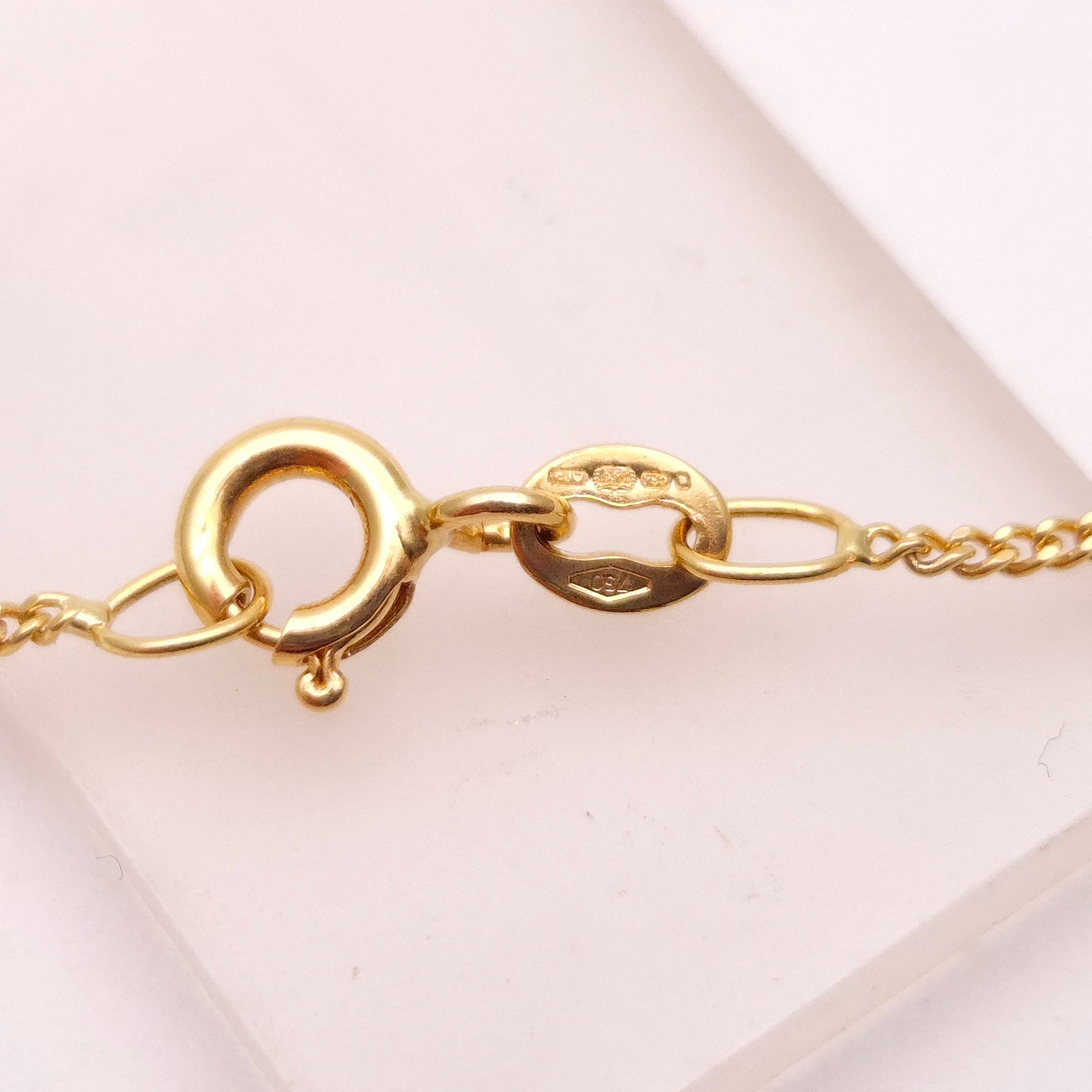 The pendant hangs from a delicate yet durable 18ct yellow gold curb chain, known for its interlocking, uniform links that create a subtle shimmer. The chain is secured with a reliable clasp, ensuring comfortable and secure wear.