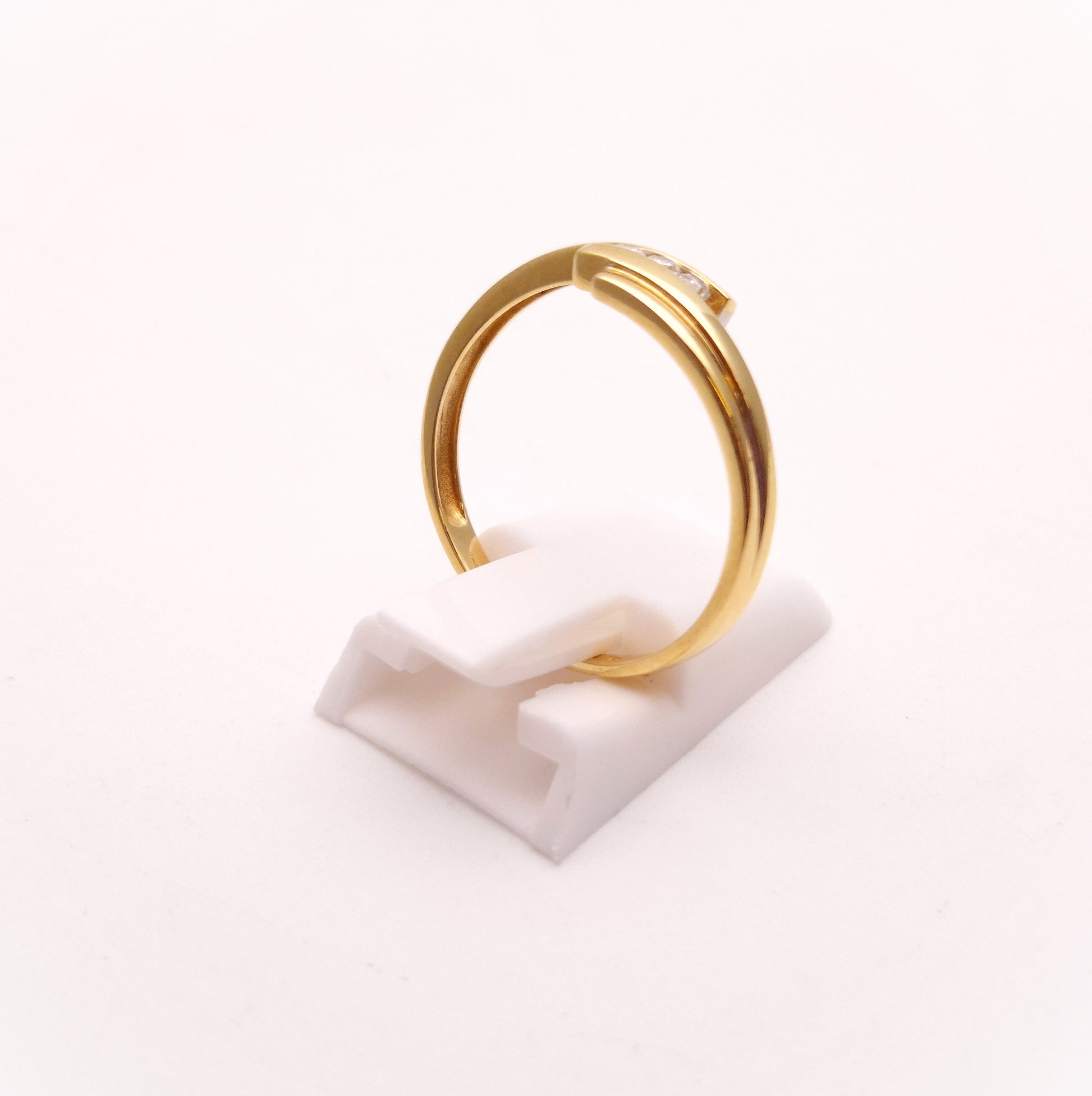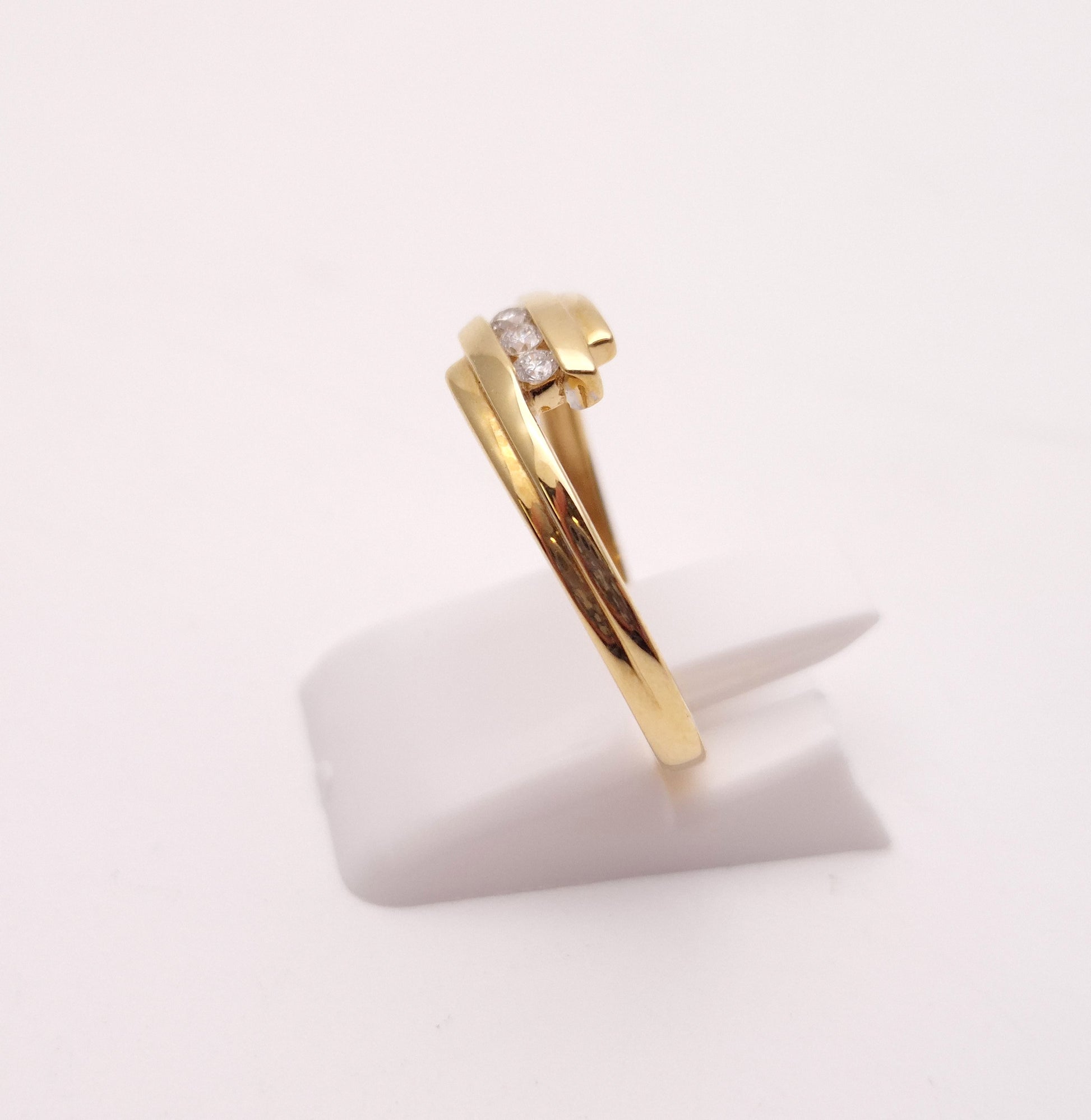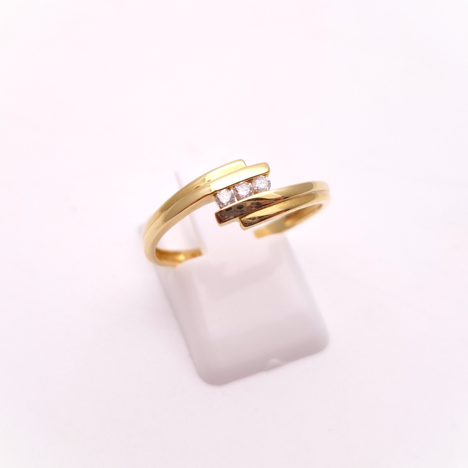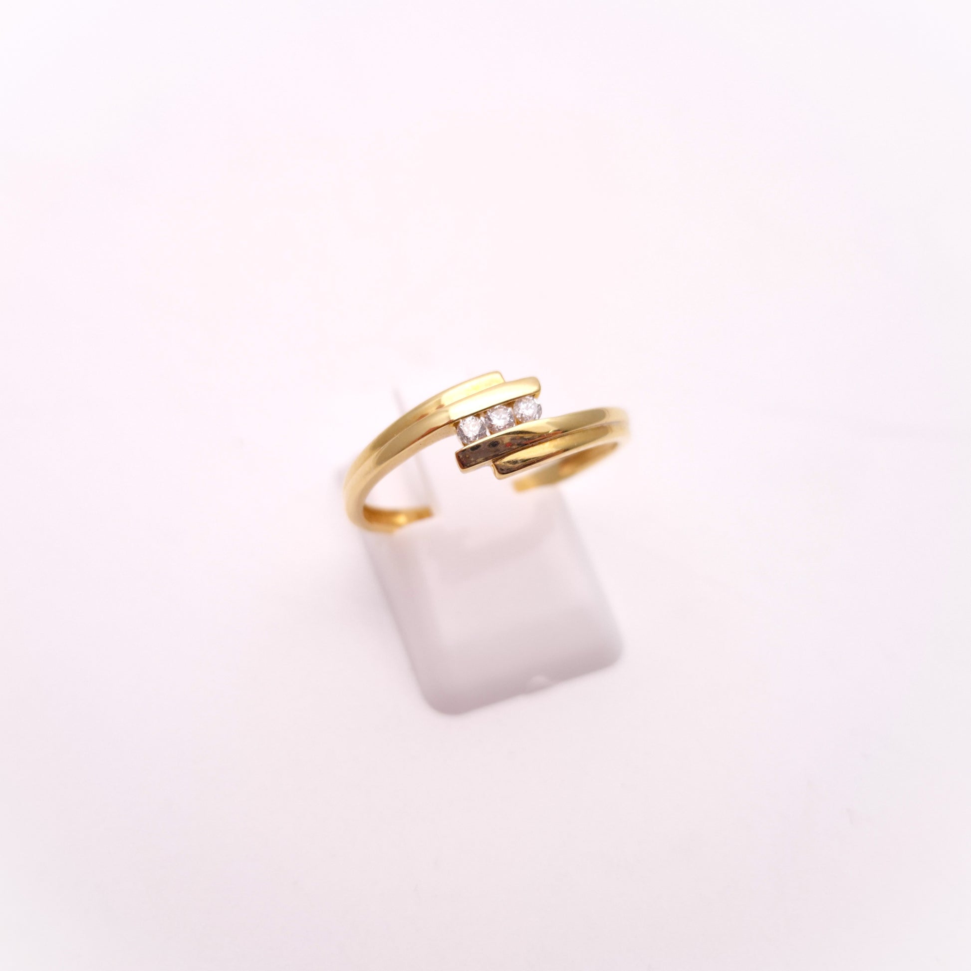 Crafted from luxurious 18 carat yellow gold, the ring features a unique crossover band design, creating a contemporary and flowing silhouette on the finger. Nestled within this artistic setting are three dazzling round brilliant-cut diamonds, perfectly aligned to maximize their sparkle and fire. The arrangement of the diamonds within the crossover design creates an illusion of continuous brilliance.