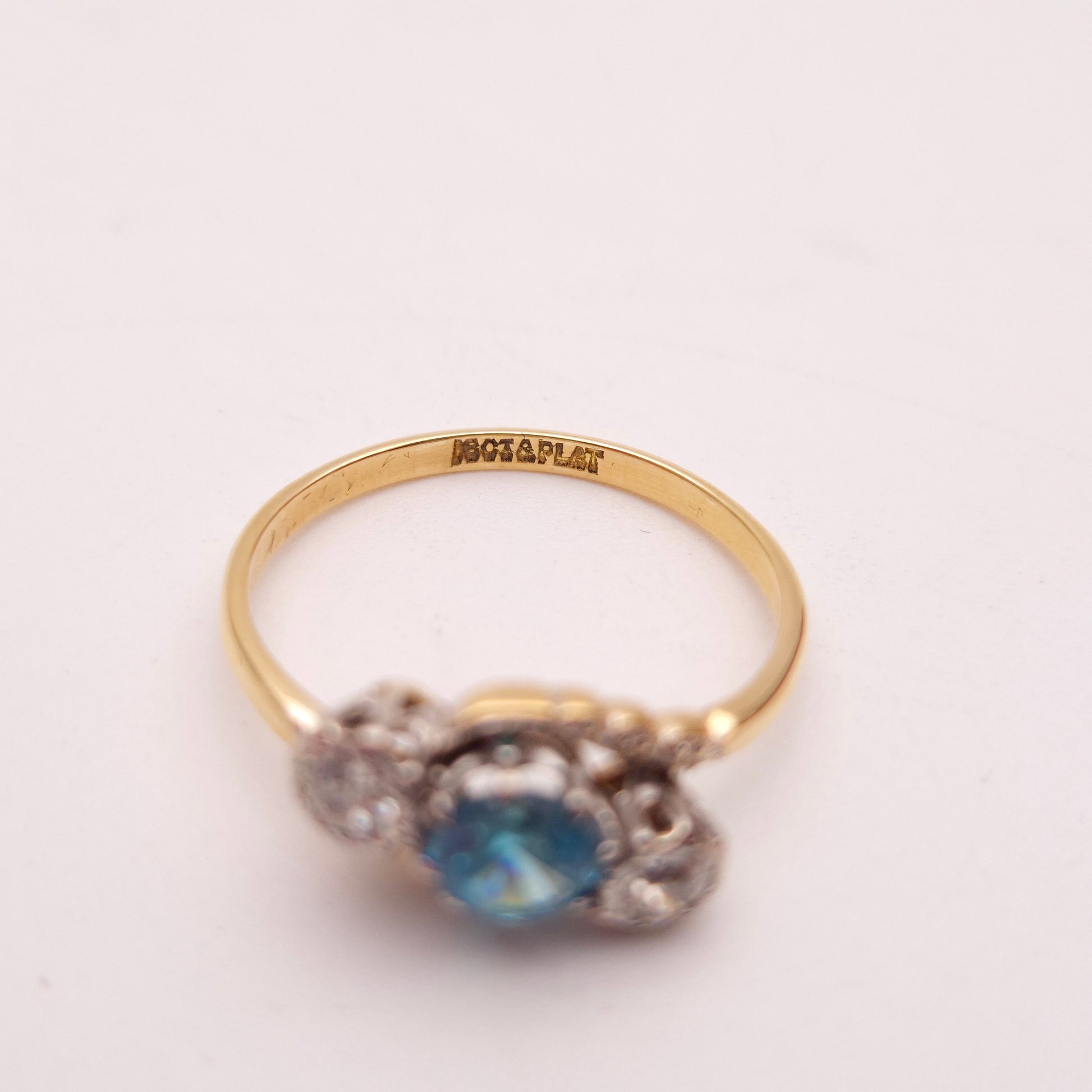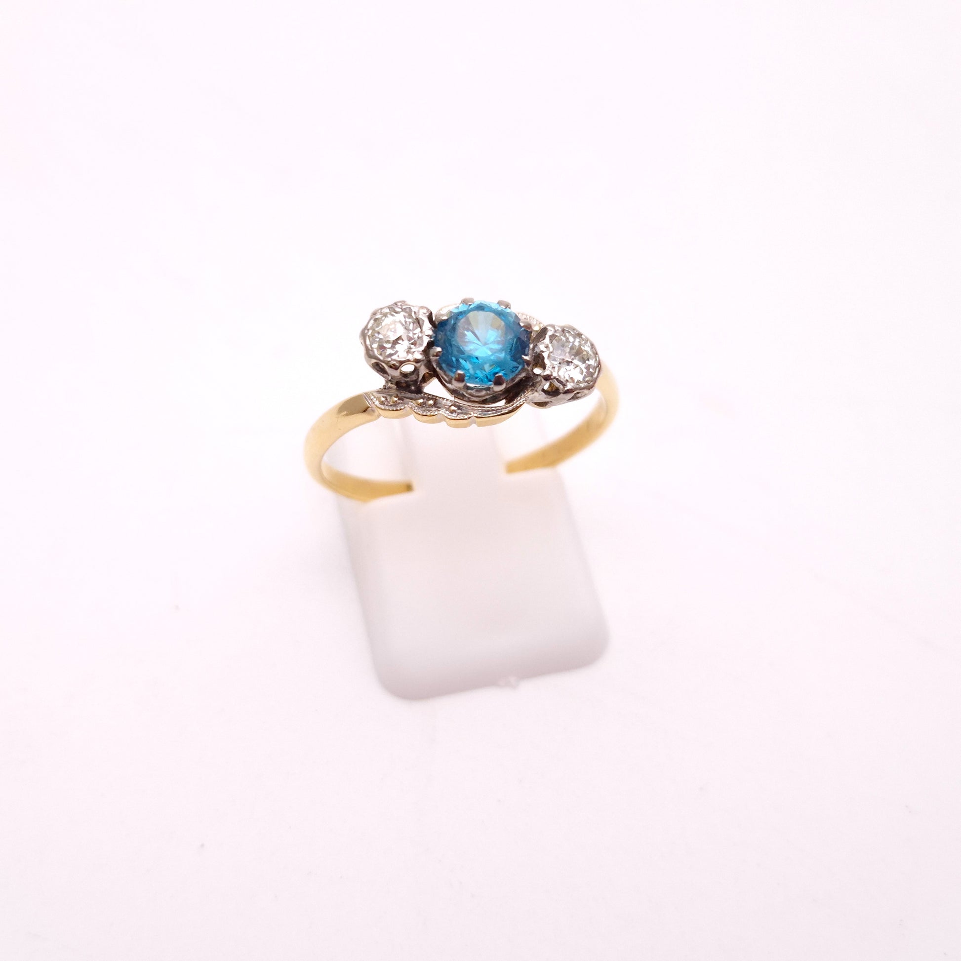 This enchanting antique ring, crafted in a striking combination of 18ct yellow gold and platinum, features a beautiful three-stone "trilogy" design, showcasing a vibrant blue zircon flanked by two sparkling diamonds.
