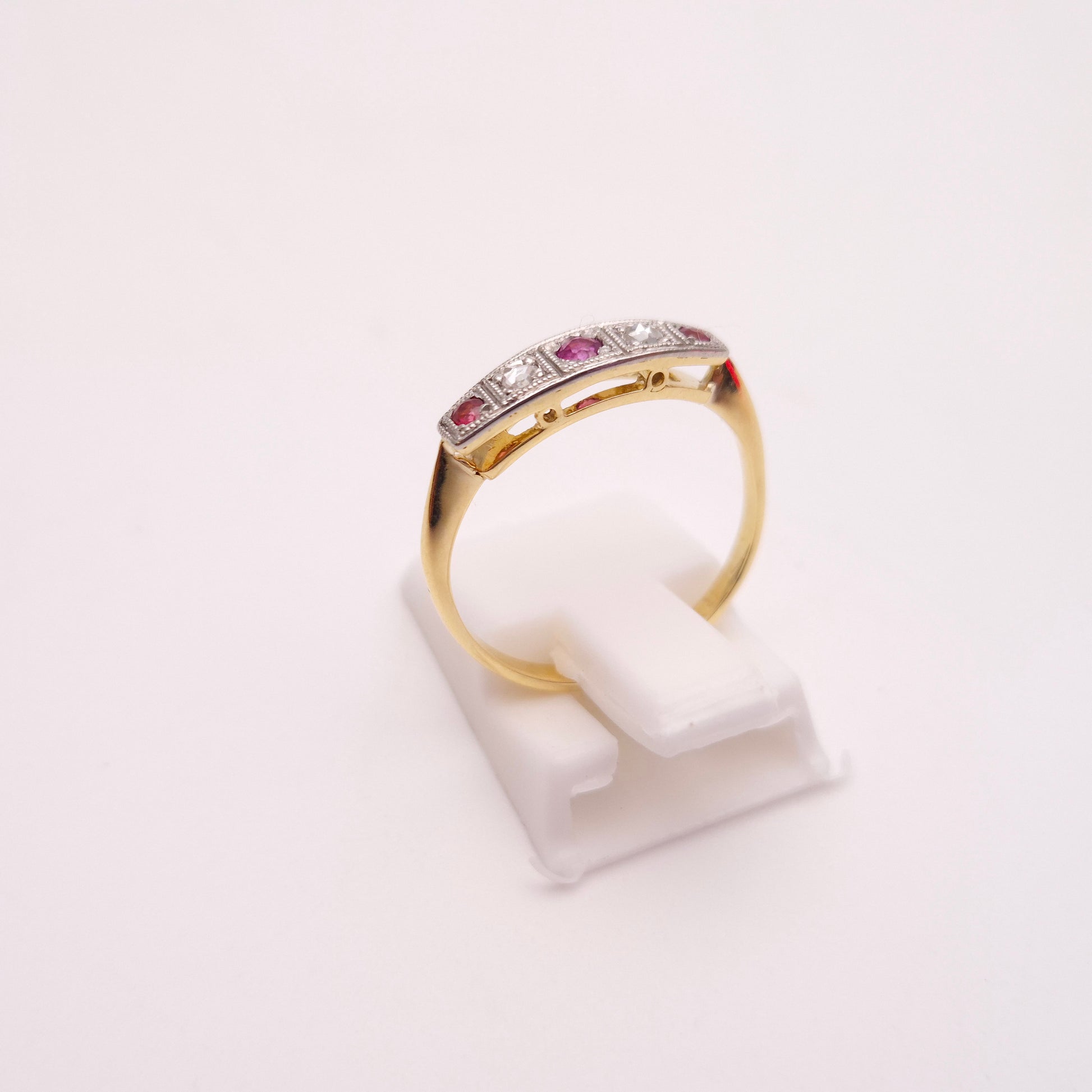 The design features a classic five-stone row arrangement across the finger. This row alternates between round-cut, richly coloured Rubies and bright, small Diamonds. The stones are set close together, maximizing their impact and creating a continuous band of alternating colour and sparkle.