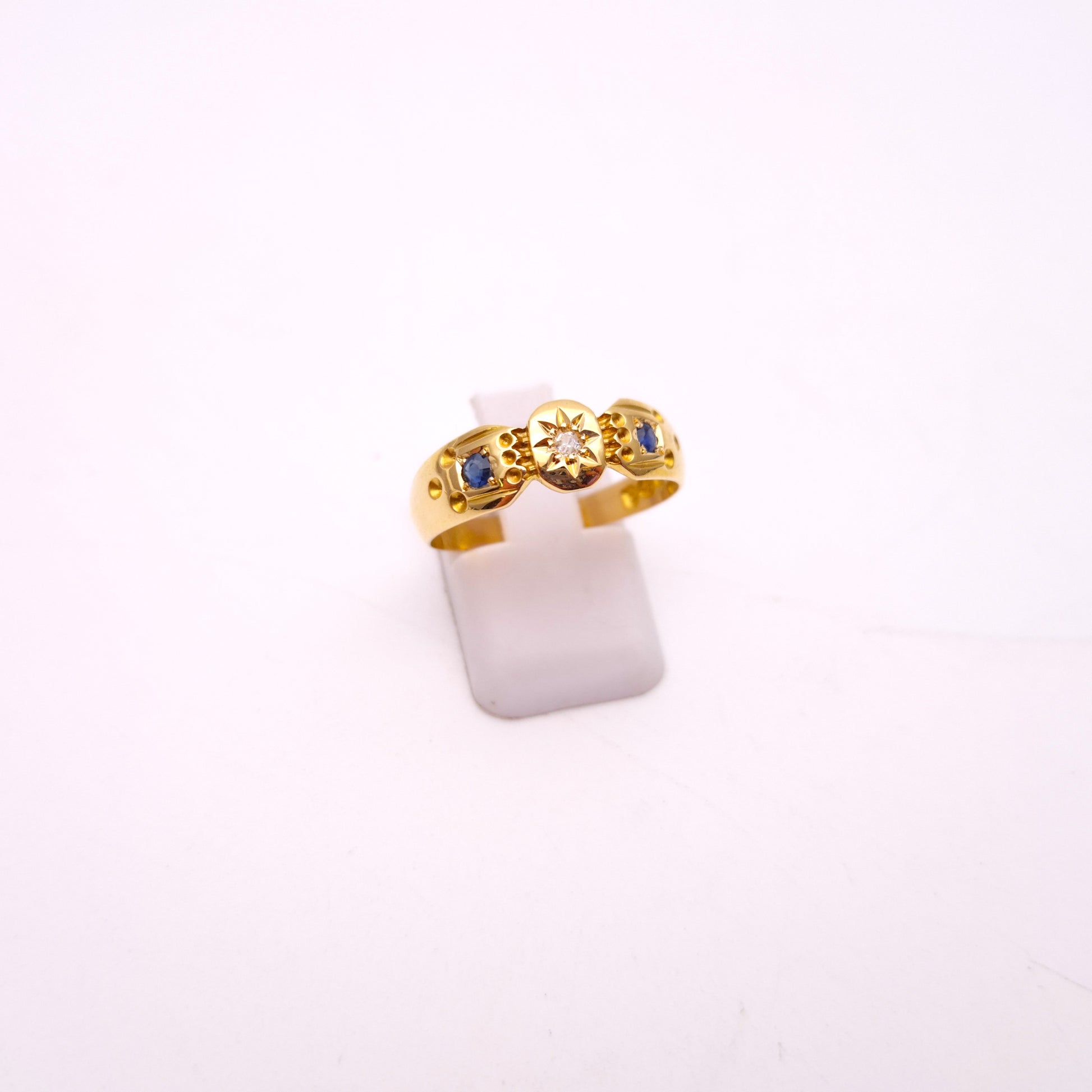The ring showcases a classic shaped band designed to sit gracefully on the finger. At its heart, a bright round diamond takes centre stage, radiating a beautiful sparkle. Flanking the central diamond are two deep, velvety blue sapphires, their rich colour providing a striking contrast to the diamond's brilliance and the warm glow of the gold. The gemstones are expertly set in a star-burst style within the gold, enhancing their individual beauty.