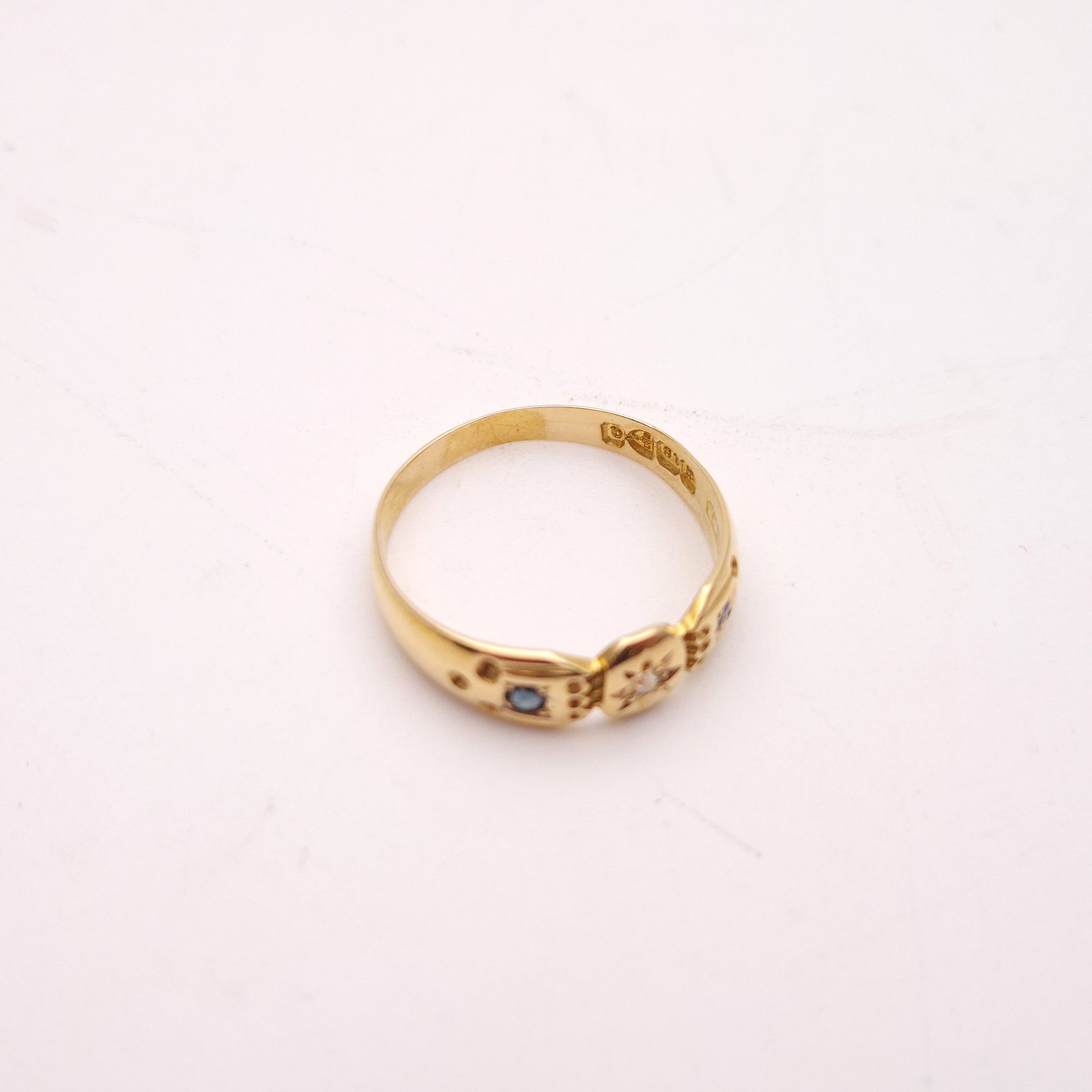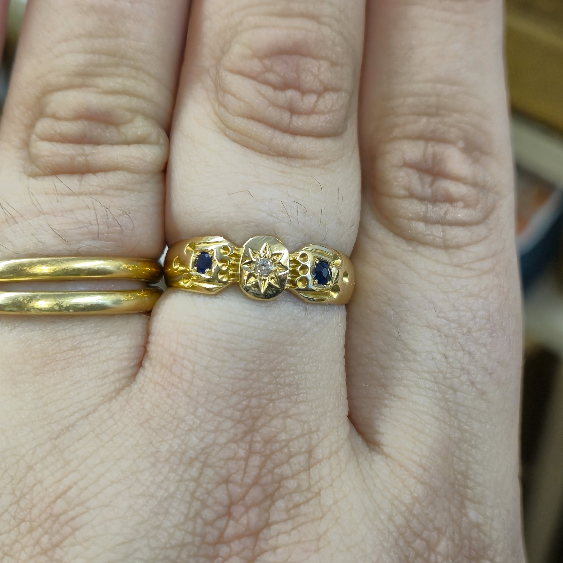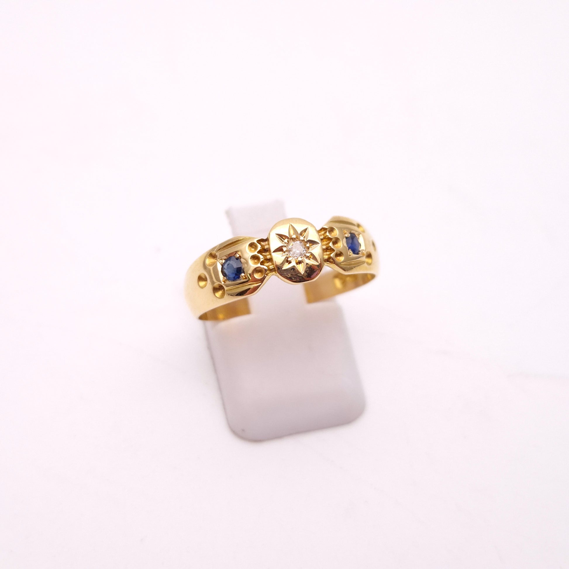 Step back in time and own a piece of history with this exceptional antique Victorian ring, meticulously crafted in rich 18ct yellow gold. Hallmarked in Chester in 1899, this ring is a true testament to the elegance and enduring quality of late Victorian jewellery, featuring a timeless combination of vibrant sapphires and a sparkling diamond.