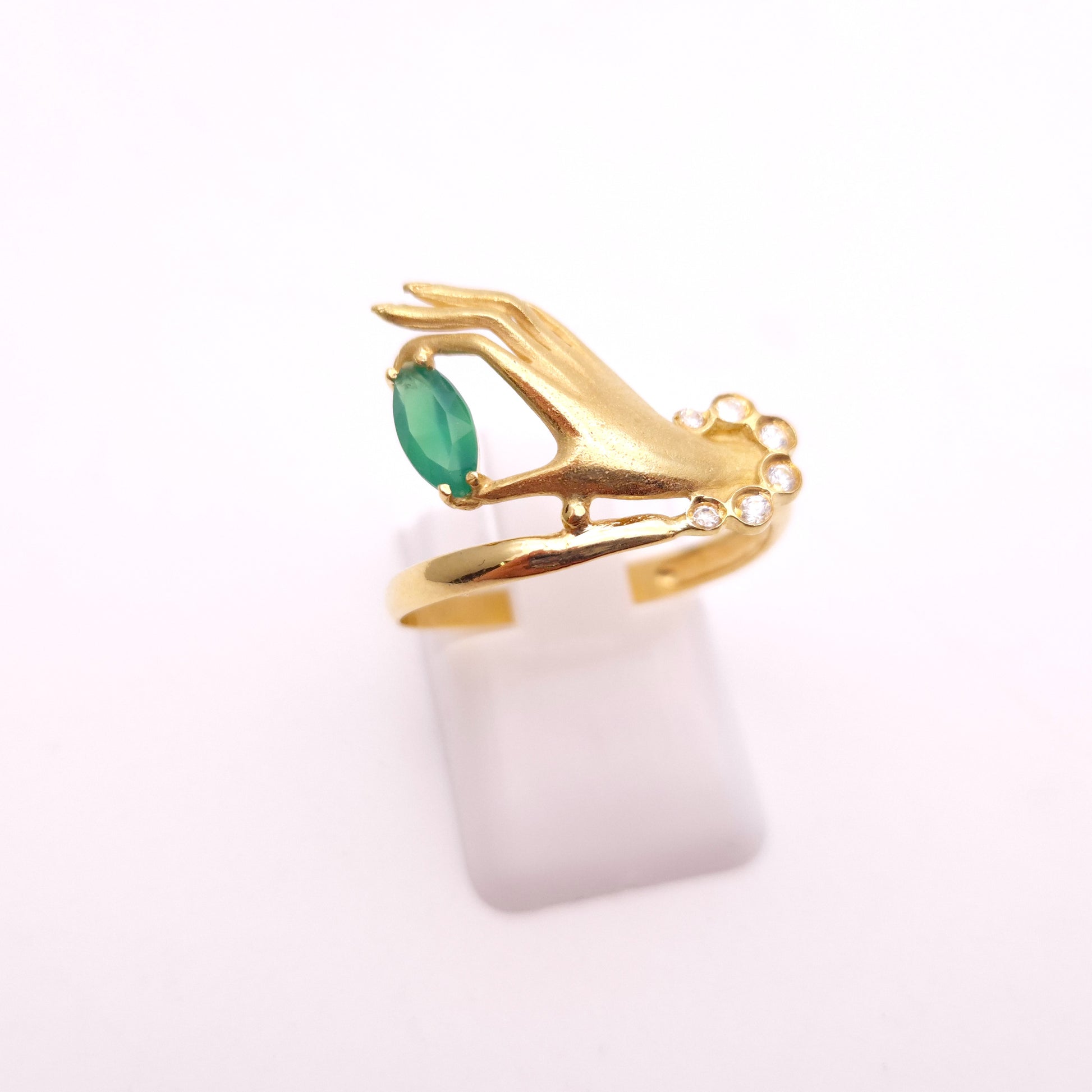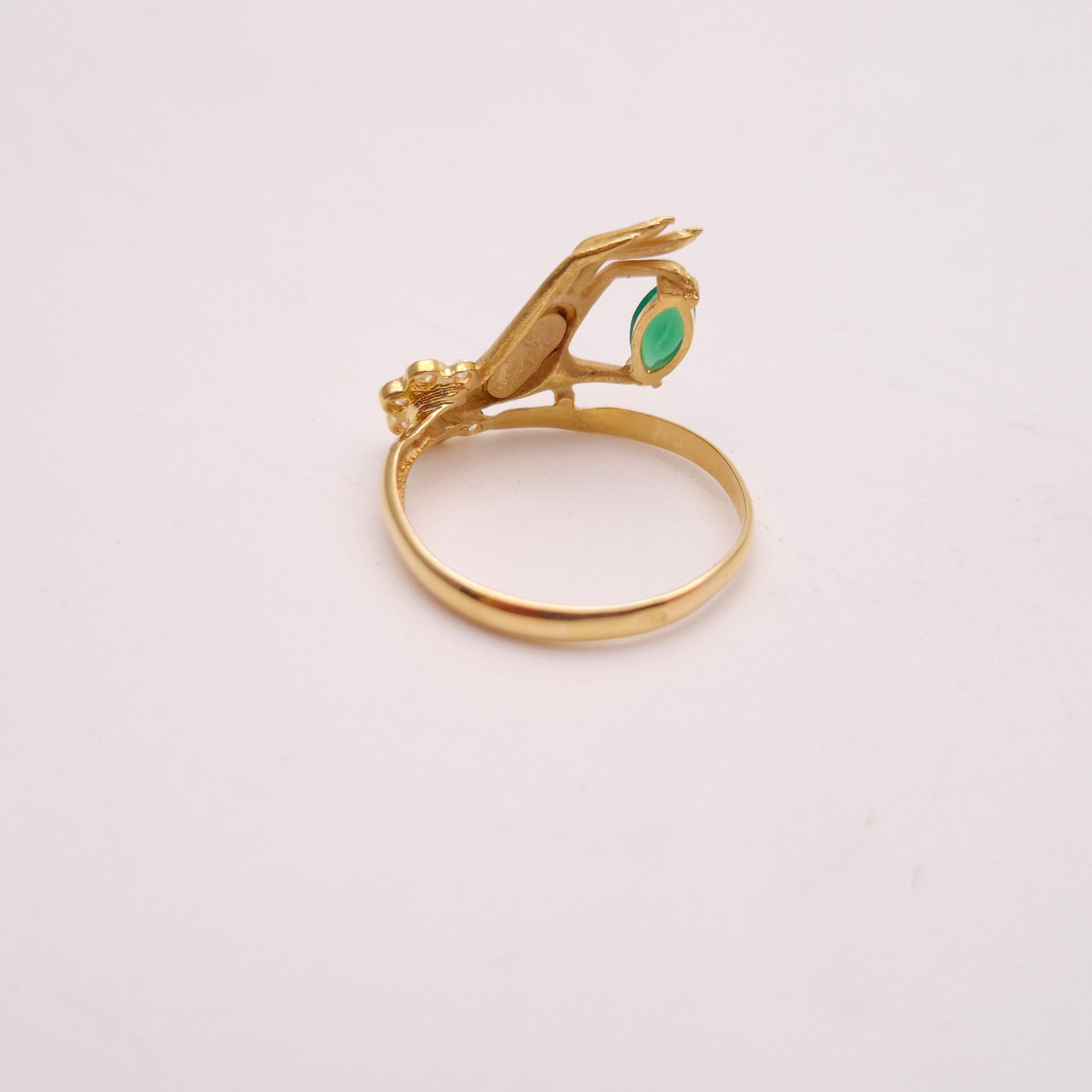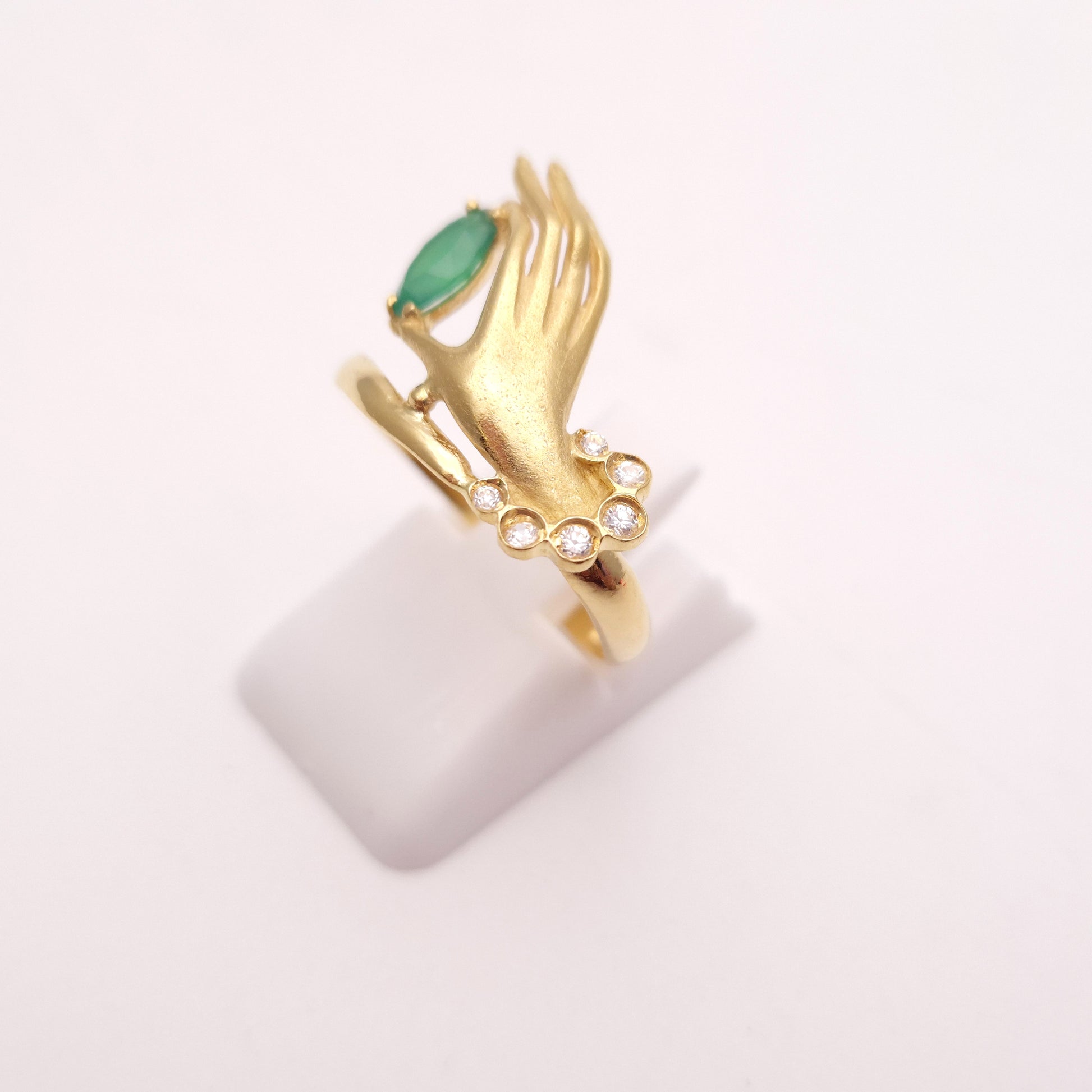 Although there are no specific hallmarks the piece has been acid tested and marks as 18ct. The polished 18ct yellow gold lends a rich, warm glow to the entire piece. This 18ct yellow gold chrysoprase and white stone "hand" ring is a remarkable and artistic statement piece. It's perfect for those who appreciate unique, conceptual jewellery, making it an unforgettable gift or a cherished addition to a truly distinctive collection.