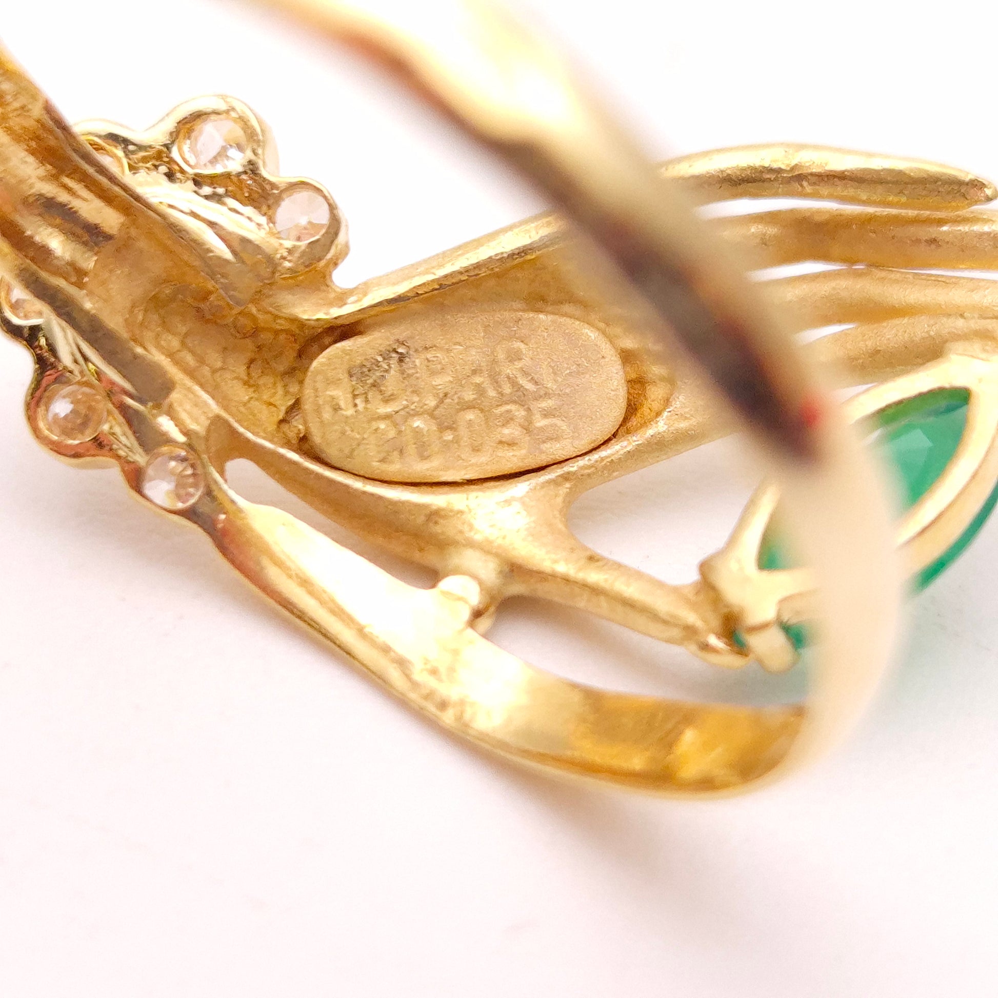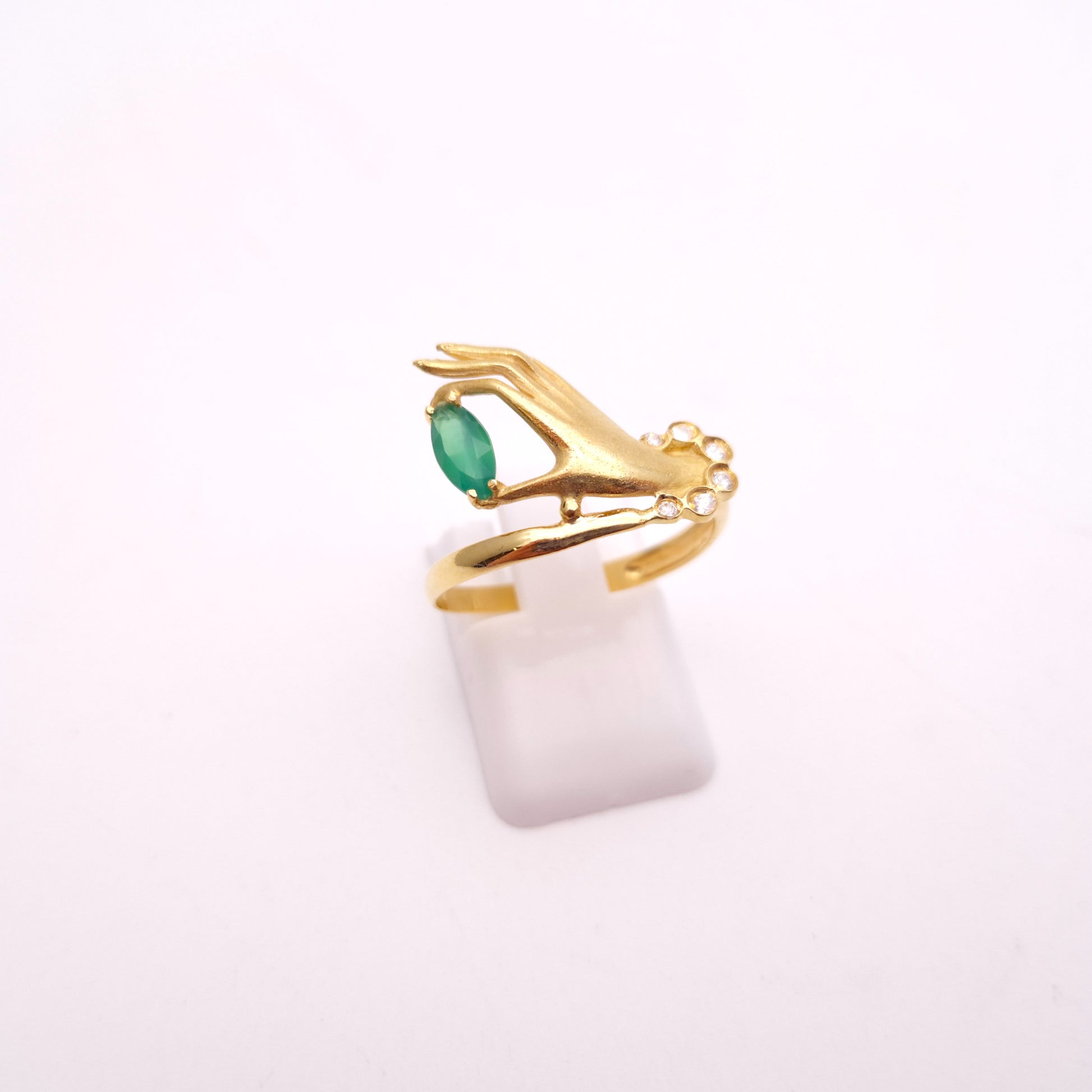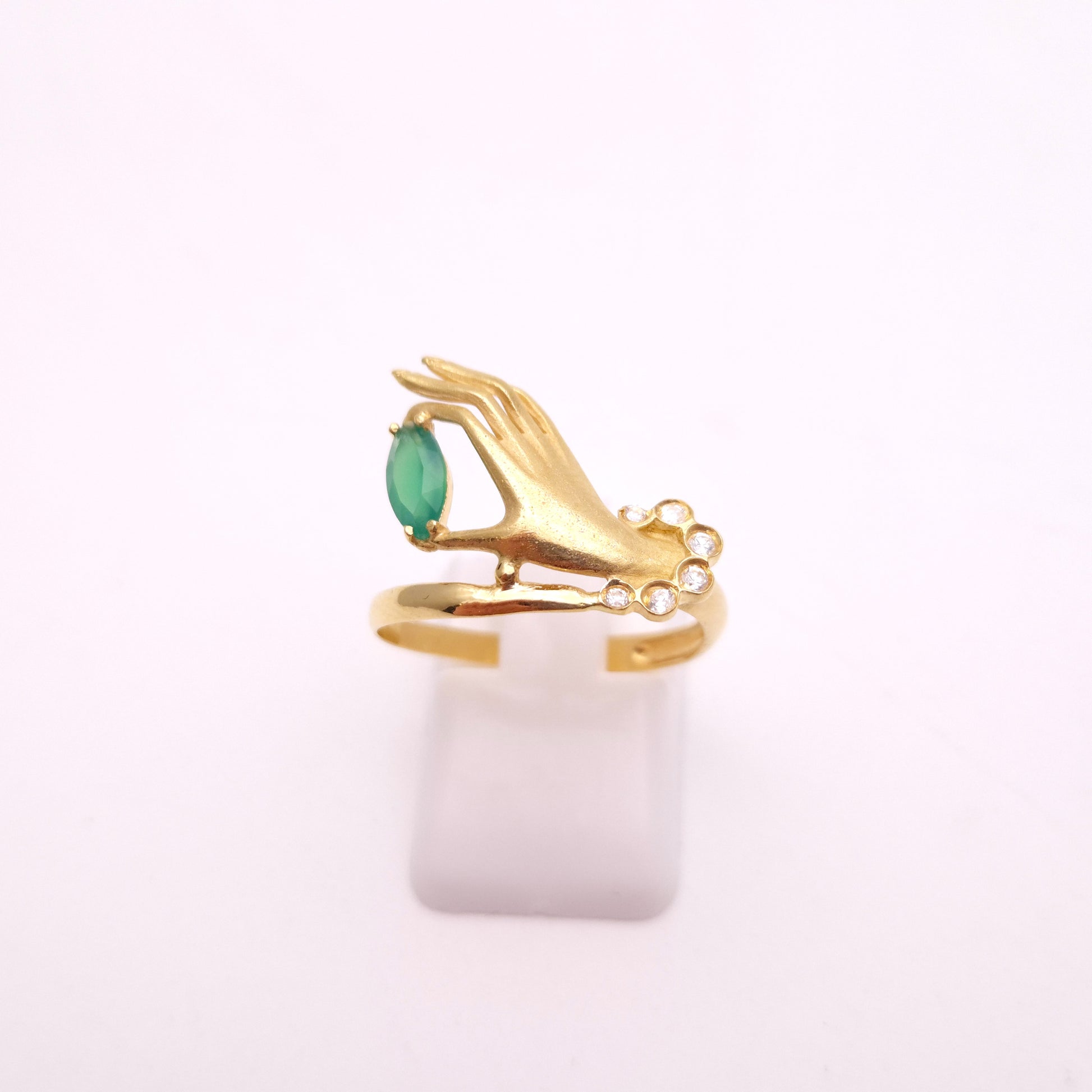 Although there are no specific hallmarks the piece has been acid tested and marks as 18ct. The polished 18ct yellow gold lends a rich, warm glow to the entire piece. This 18ct yellow gold chrysoprase and white stone "hand" ring is a remarkable and artistic statement piece. It's perfect for those who appreciate unique, conceptual jewellery, making it an unforgettable gift or a cherished addition to a truly distinctive collection.