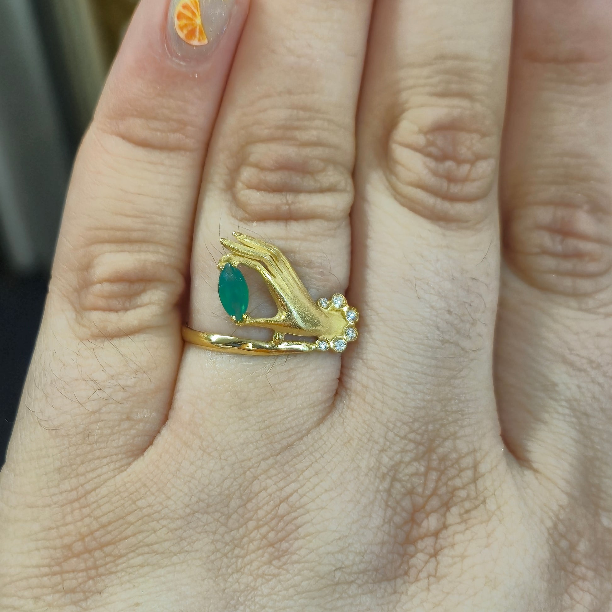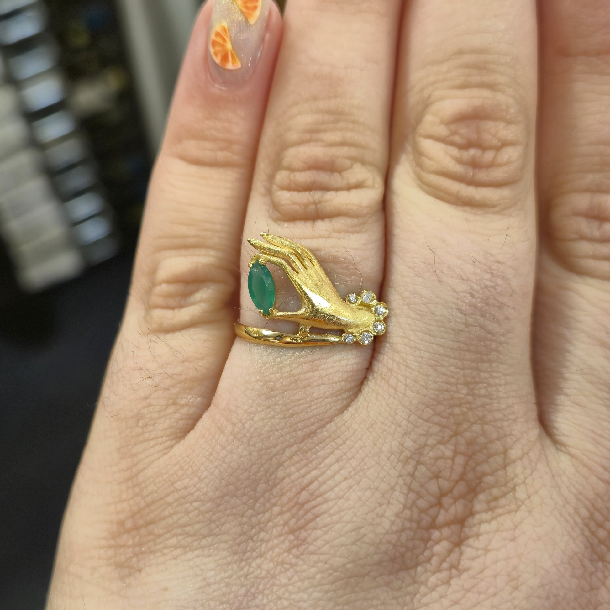 The centrepiece of this unique design is a beautifully sculpted hand, with intricate detailing on the fingers and palm, giving it a realistic and artistic touch. The hand appears to delicately grasp a striking marquise-cut chrysoprase stone, known for its enchanting translucent apple-green colour. This vivid green gemstone creates a stunning focal point. Adding to the allure, a sparkling line of small, brilliant white stones adorns the wrist or cuff area of the hand, adding a touch of brilliance and luxury.