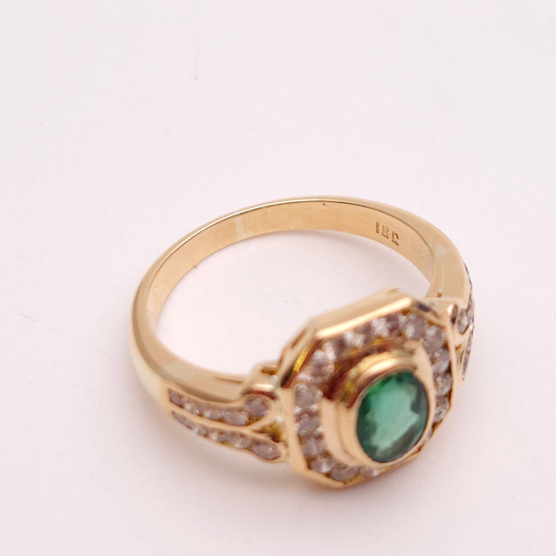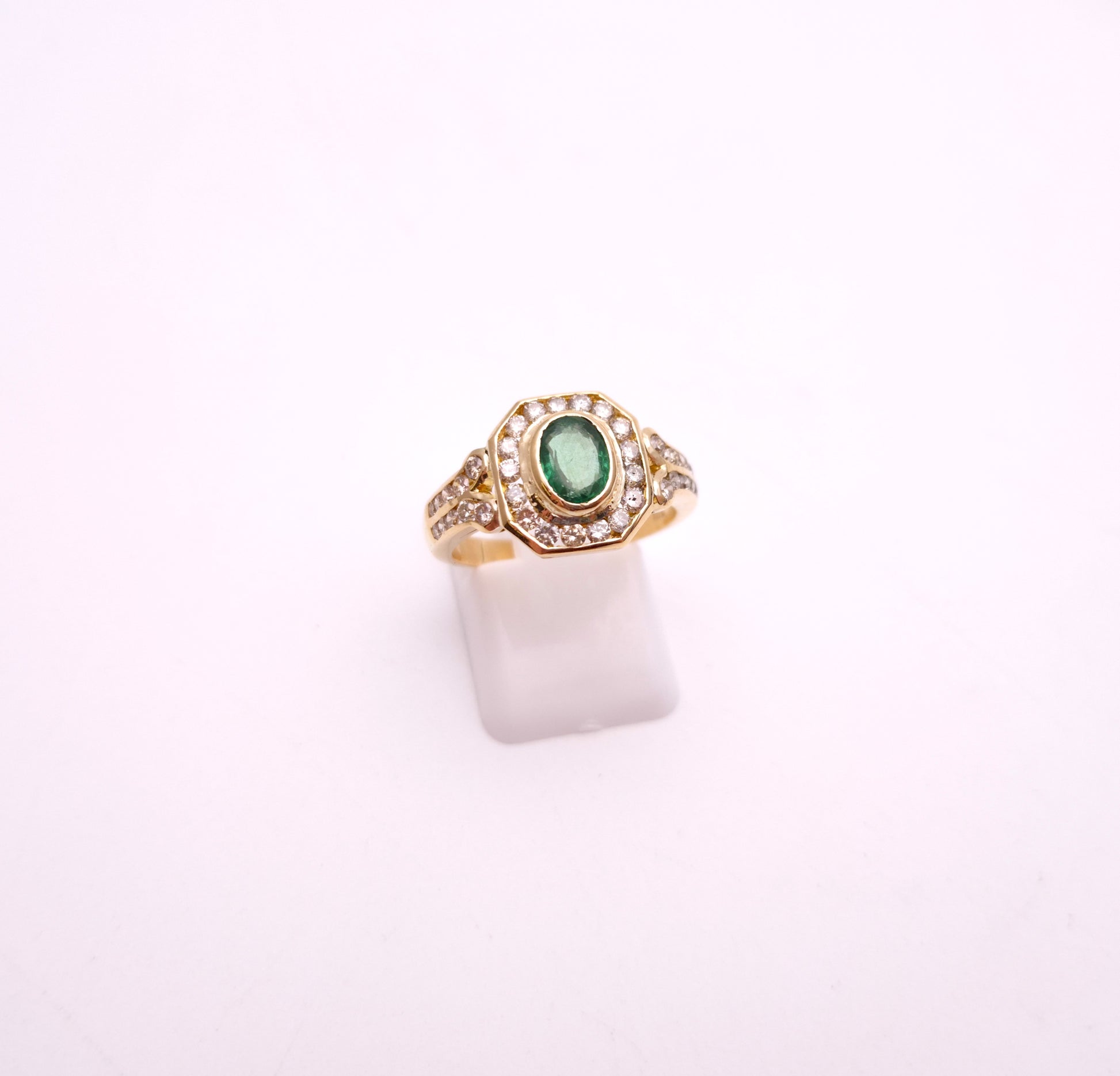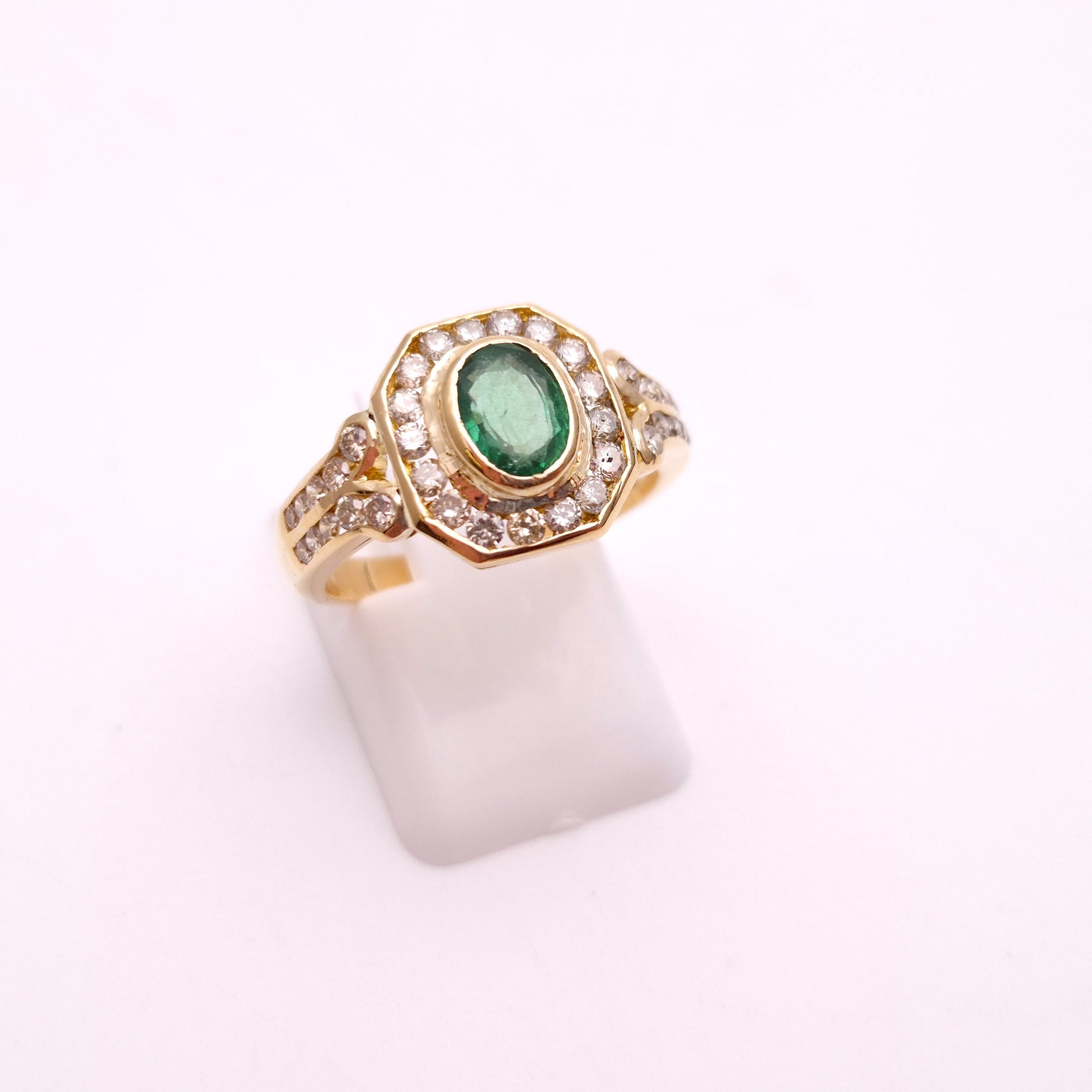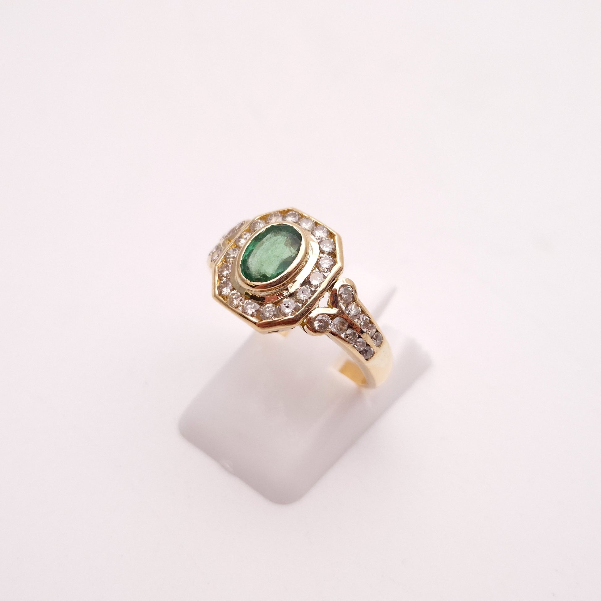 At its heart lies a captivating oval emerald, radiating a deep, mesmerizing green hue. This vibrant gemstone is perfectly framed by a brilliant halo of dazzling diamonds. The halo itself is distinctively octagonal, echoing the geometric precision characteristic of Art Deco design. Adding to its allure, the shoulders of the ring are intricately set with further rows of sparkling diamonds, extending the luxurious feel down the band. Crafted from high-quality 18-carat yellow gold, the substantial band provides a warm, enduring foundation for the precious gemstones.