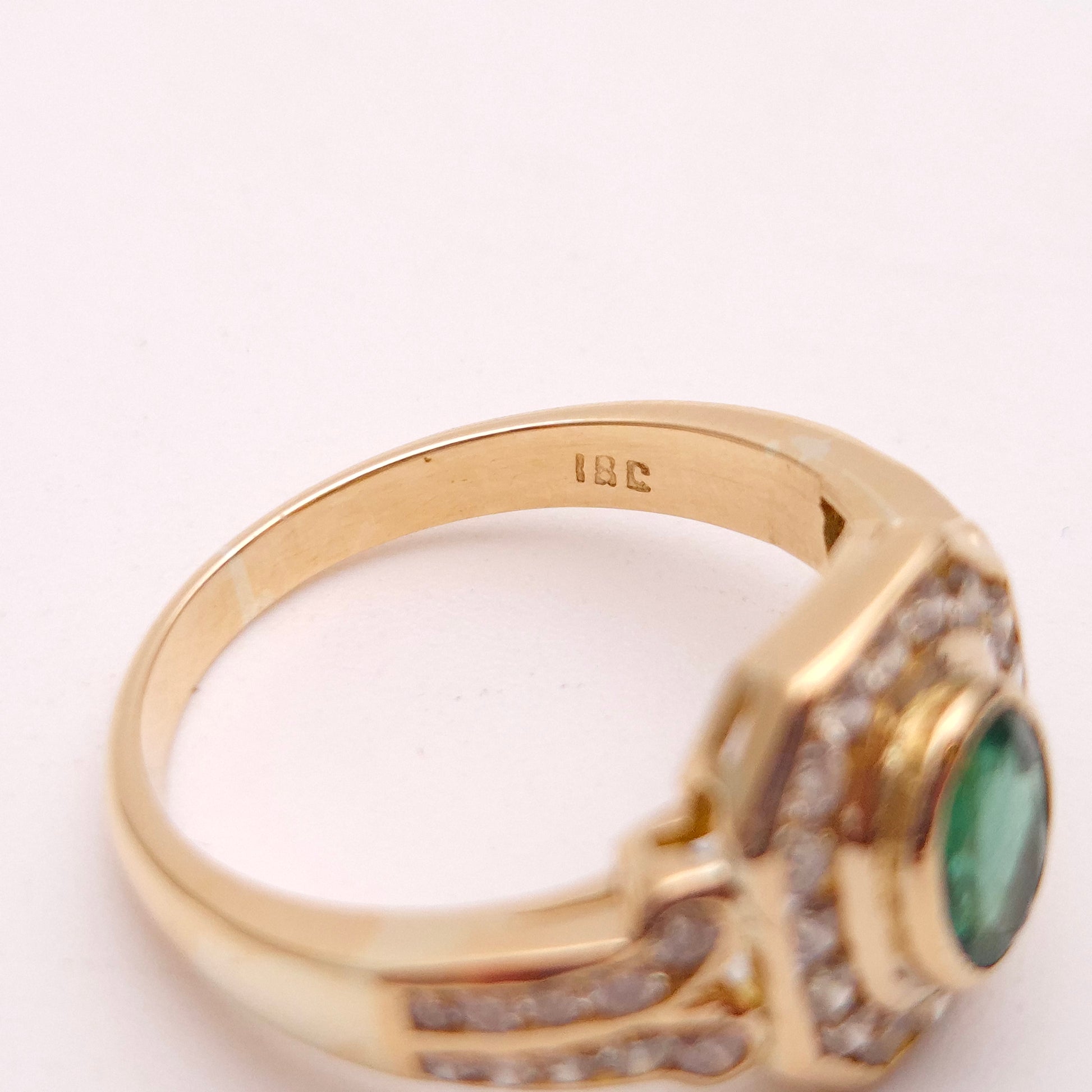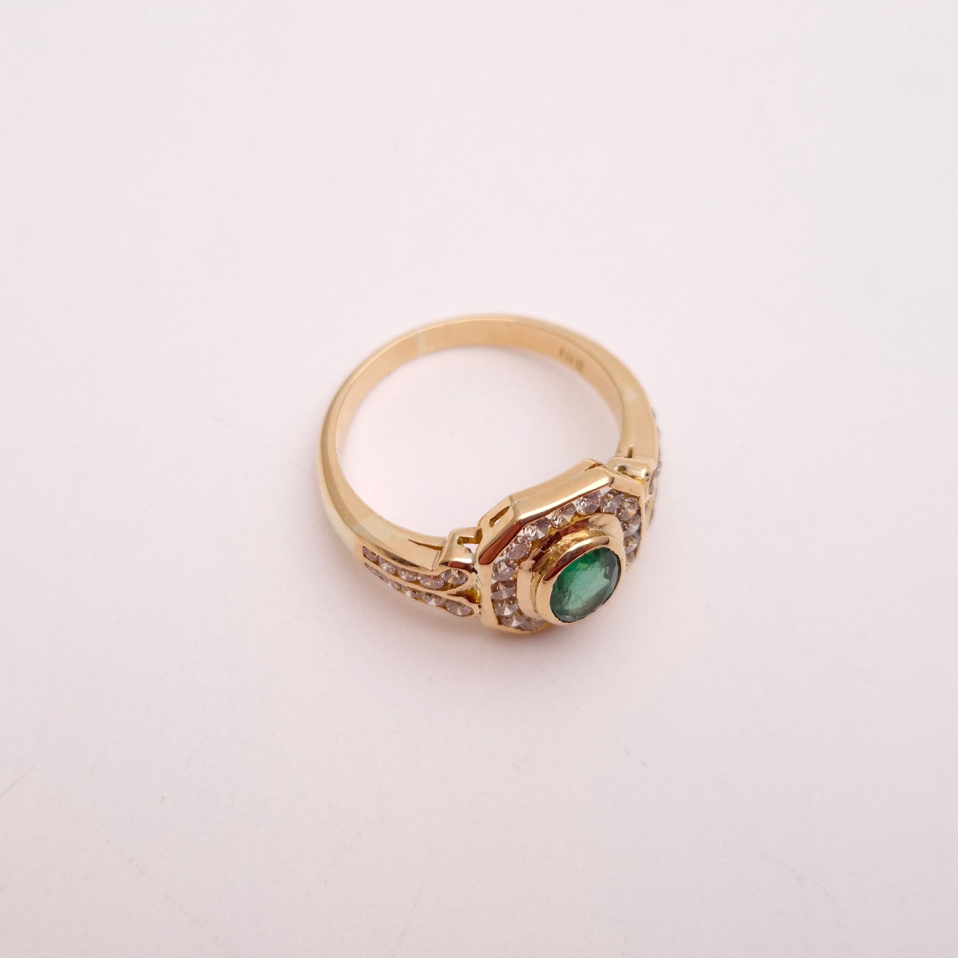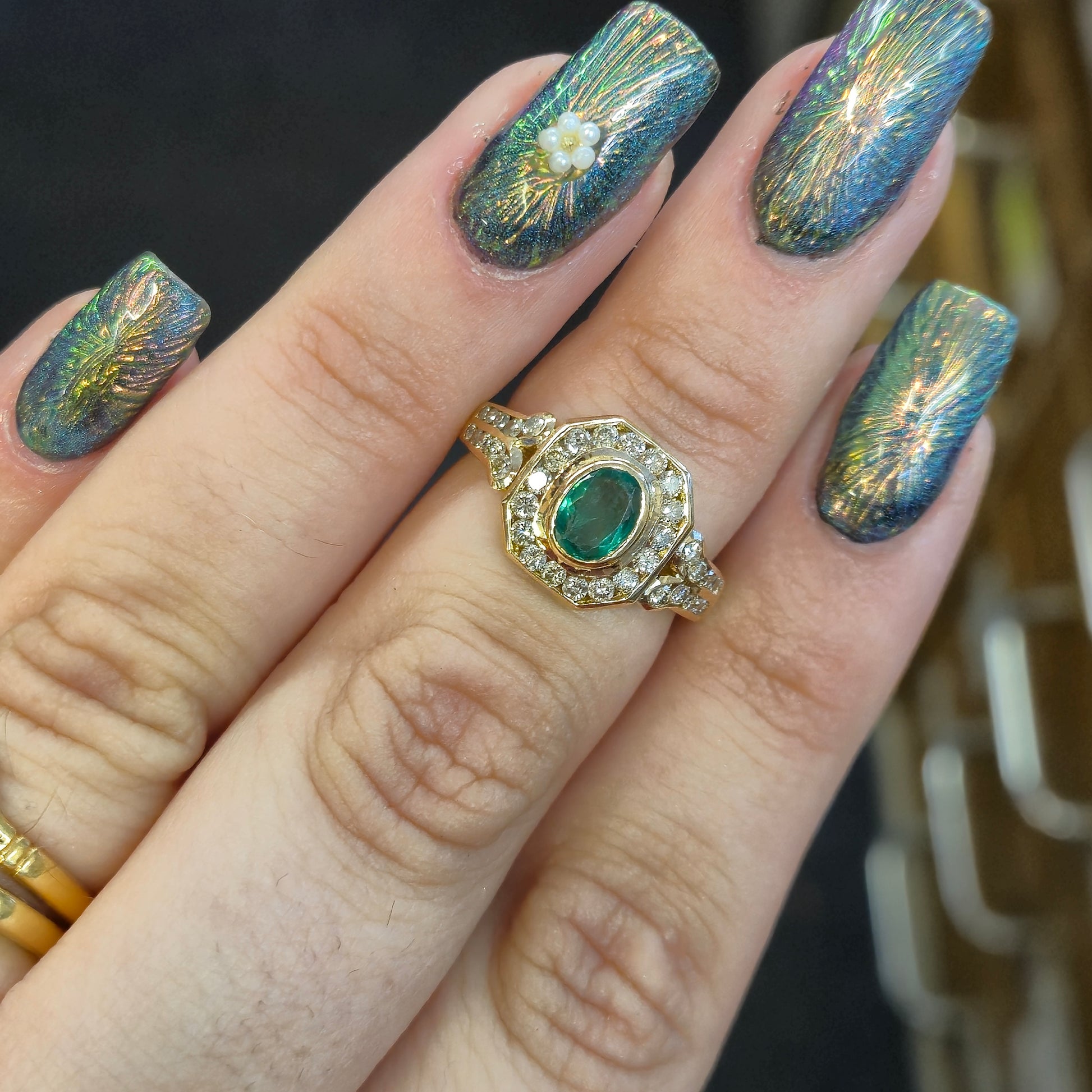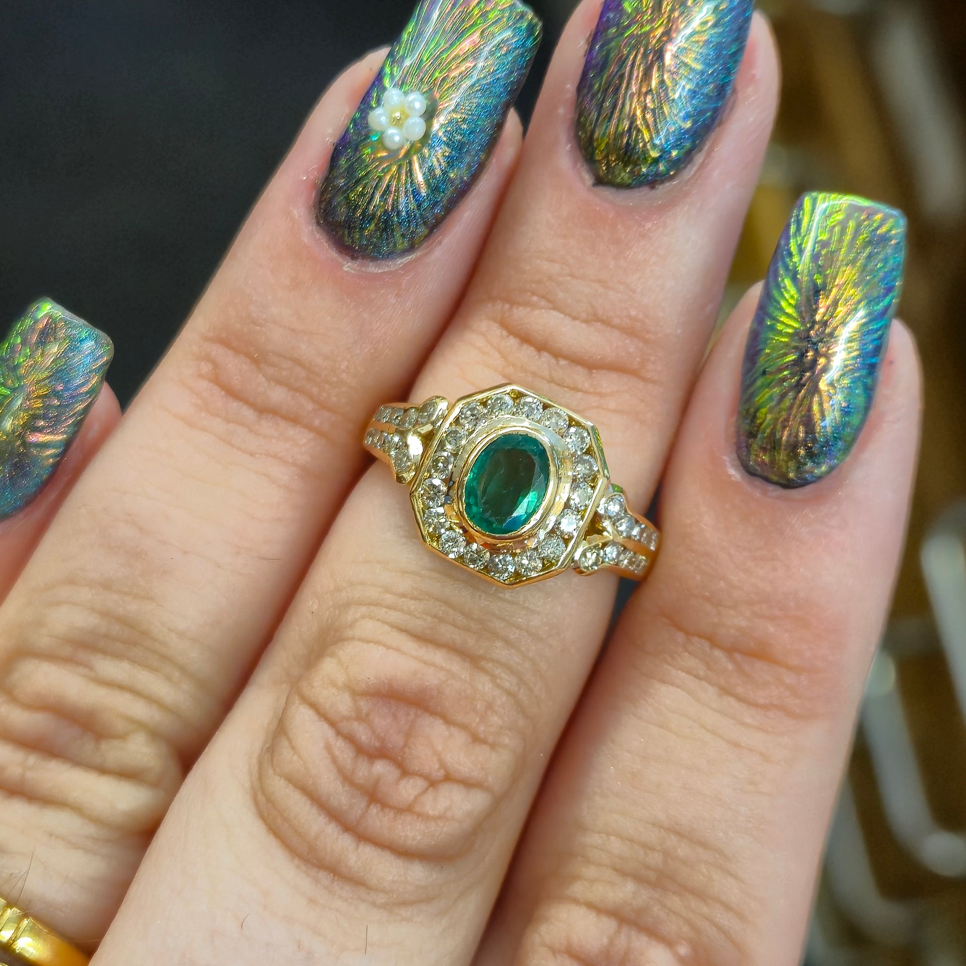 At its heart lies a captivating oval emerald, radiating a deep, mesmerizing green hue. This vibrant gemstone is perfectly framed by a brilliant halo of dazzling diamonds. The halo itself is distinctively octagonal, echoing the geometric precision characteristic of Art Deco design. Adding to its allure, the shoulders of the ring are intricately set with further rows of sparkling diamonds, extending the luxurious feel down the band. Crafted from high-quality 18-carat yellow gold, the substantial band provides a warm, enduring foundation for the precious gemstones.