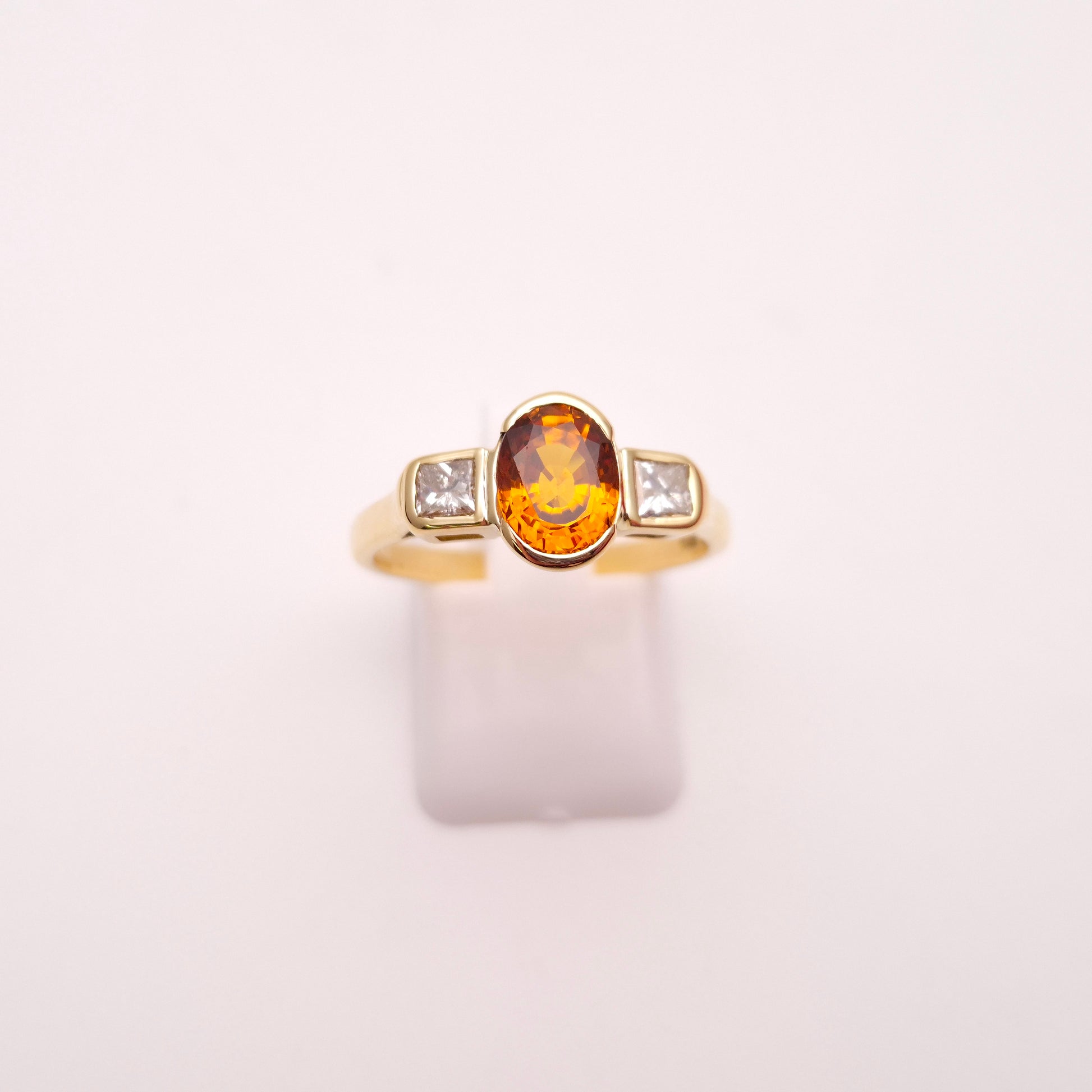 The ring features a timeless Trilogy design, symbolizing the past, present, and future. The centrepiece is a stunning oval-cut Orange Sapphire. The stone is semi bezel-set, meaning a polished gold rim encircles part of the stone, providing a smooth, contemporary look and excellent protection for the edges.