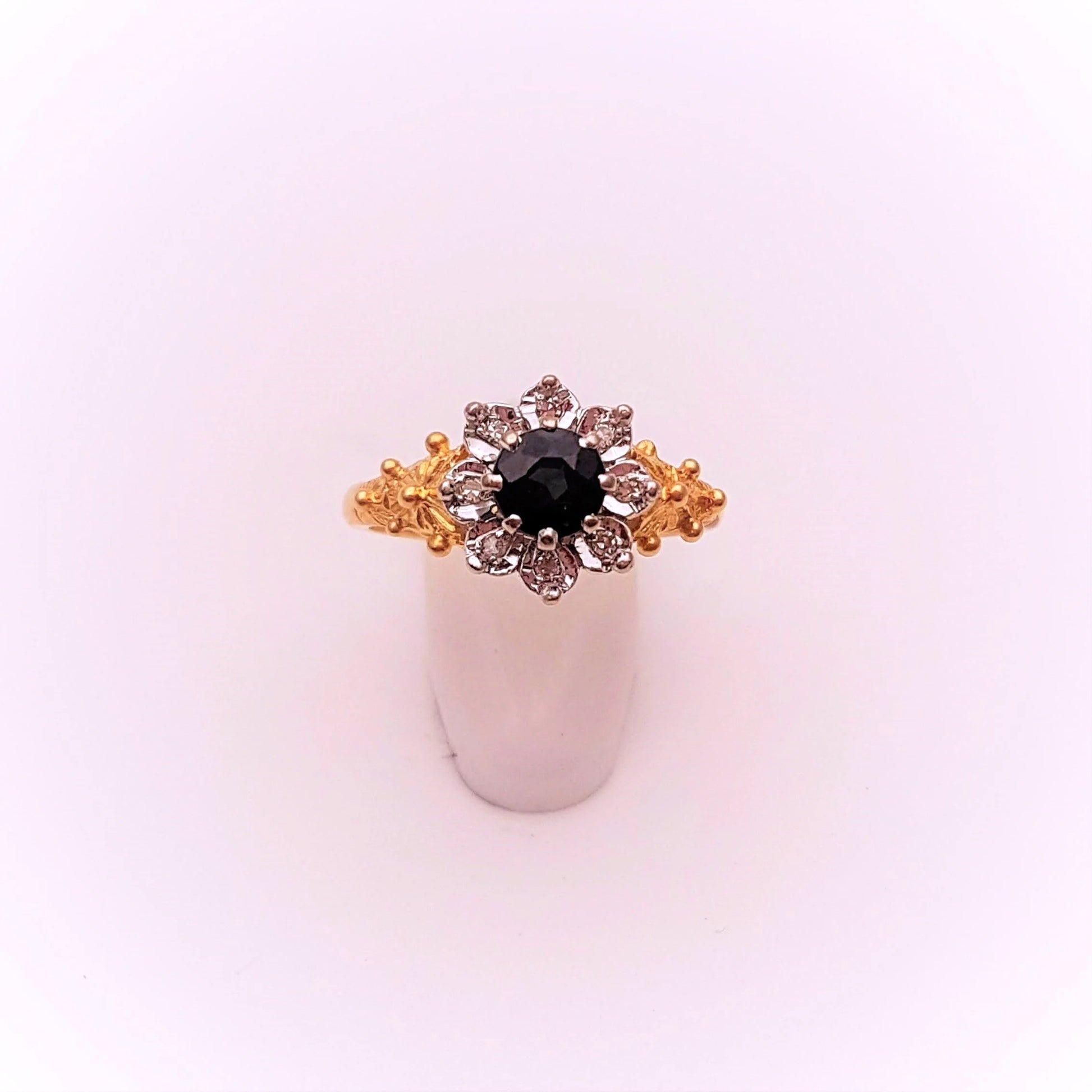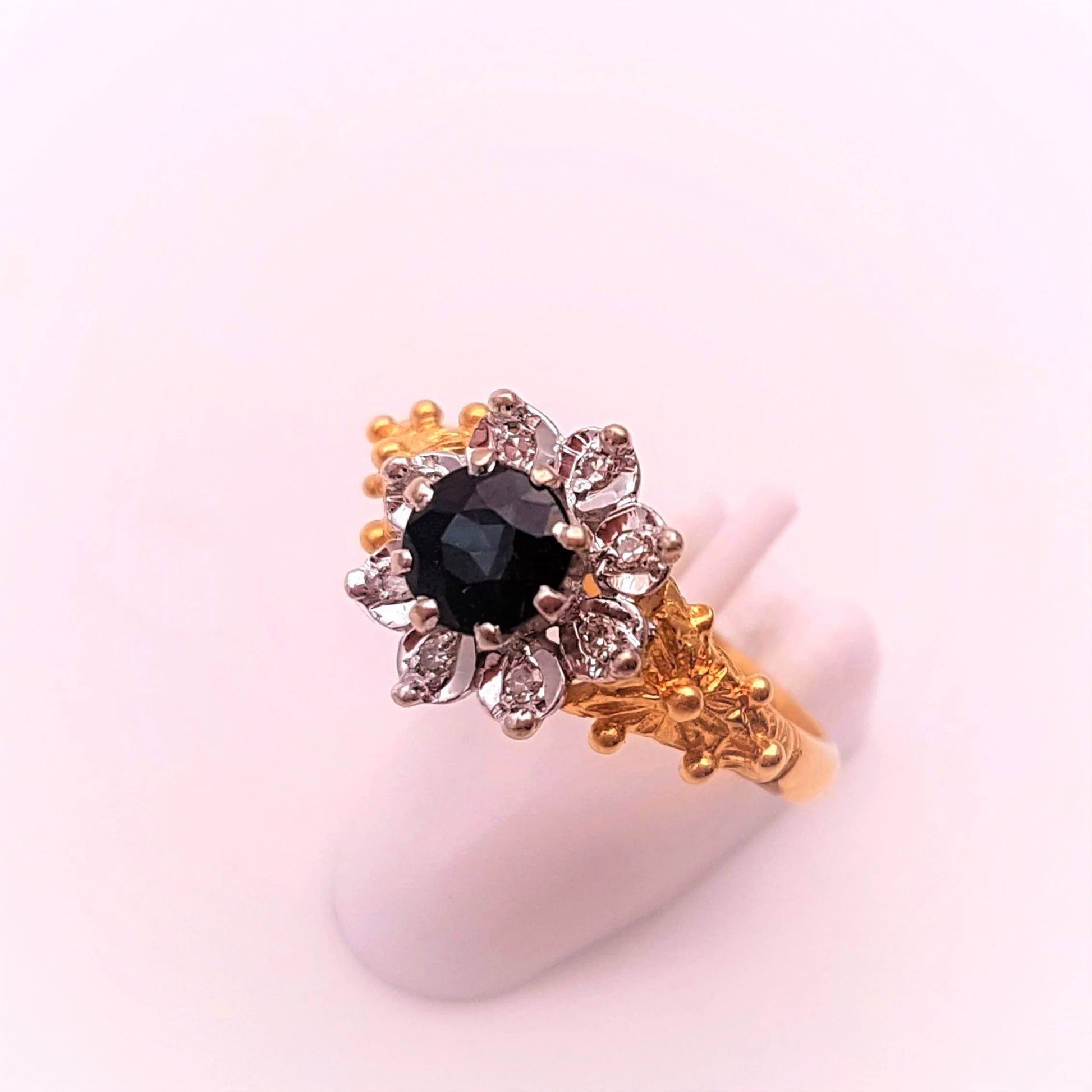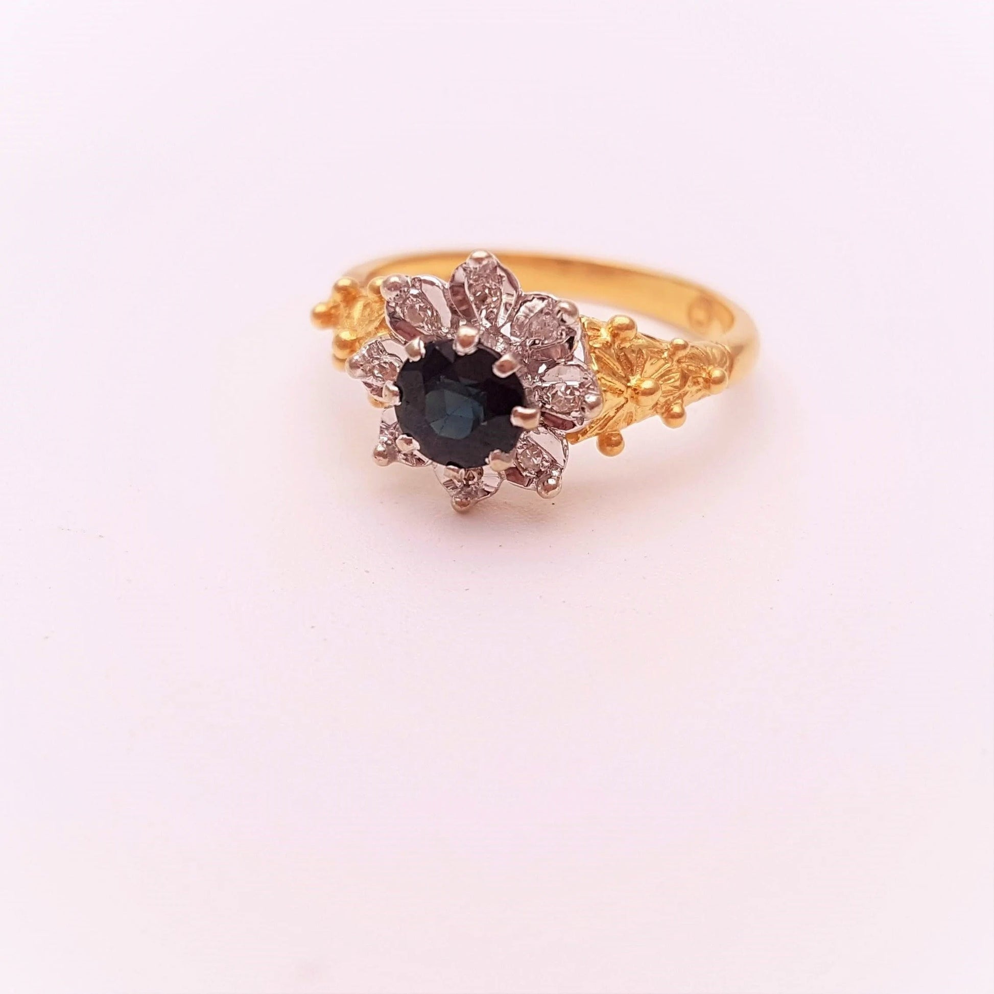 A stunning ring made from 18ct yellow gold and features a round cut sapphire set at the centre of the ring surrounded by 8 illusion set round cut diamonds with the white setting resembling a flower head . the band is yellow gold with extra detailing on the shoulders with floral resemblance. Stamped as 18ct and tests as such