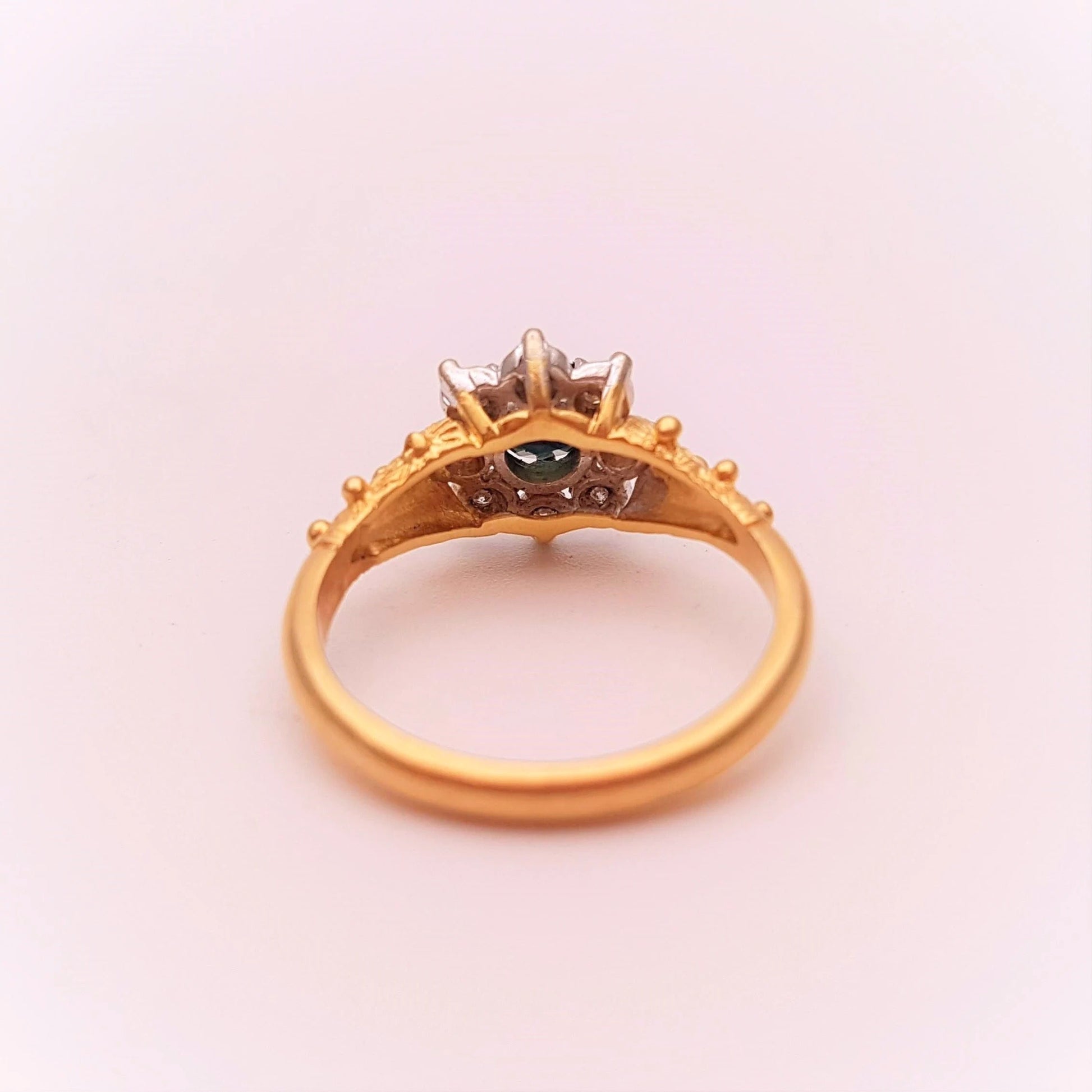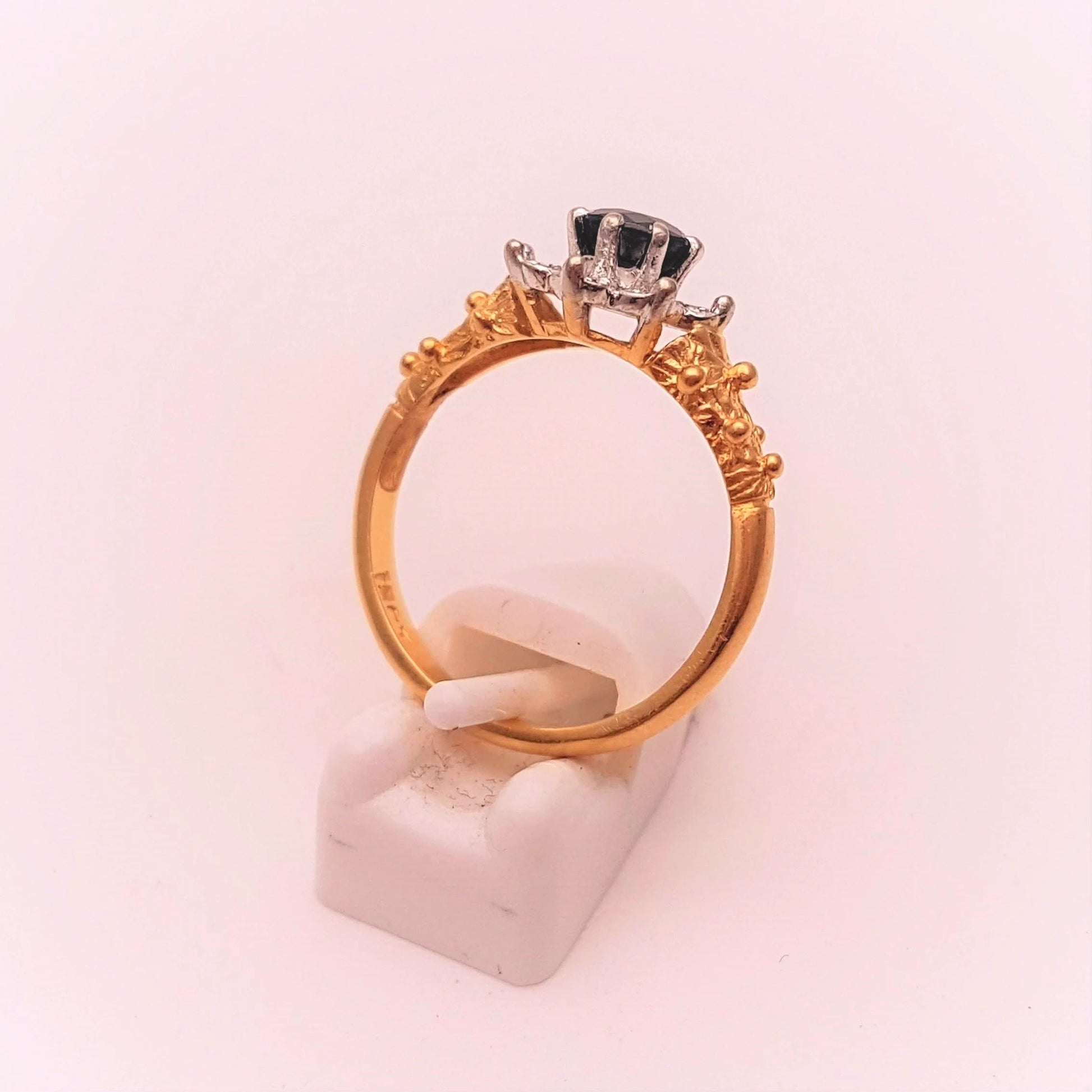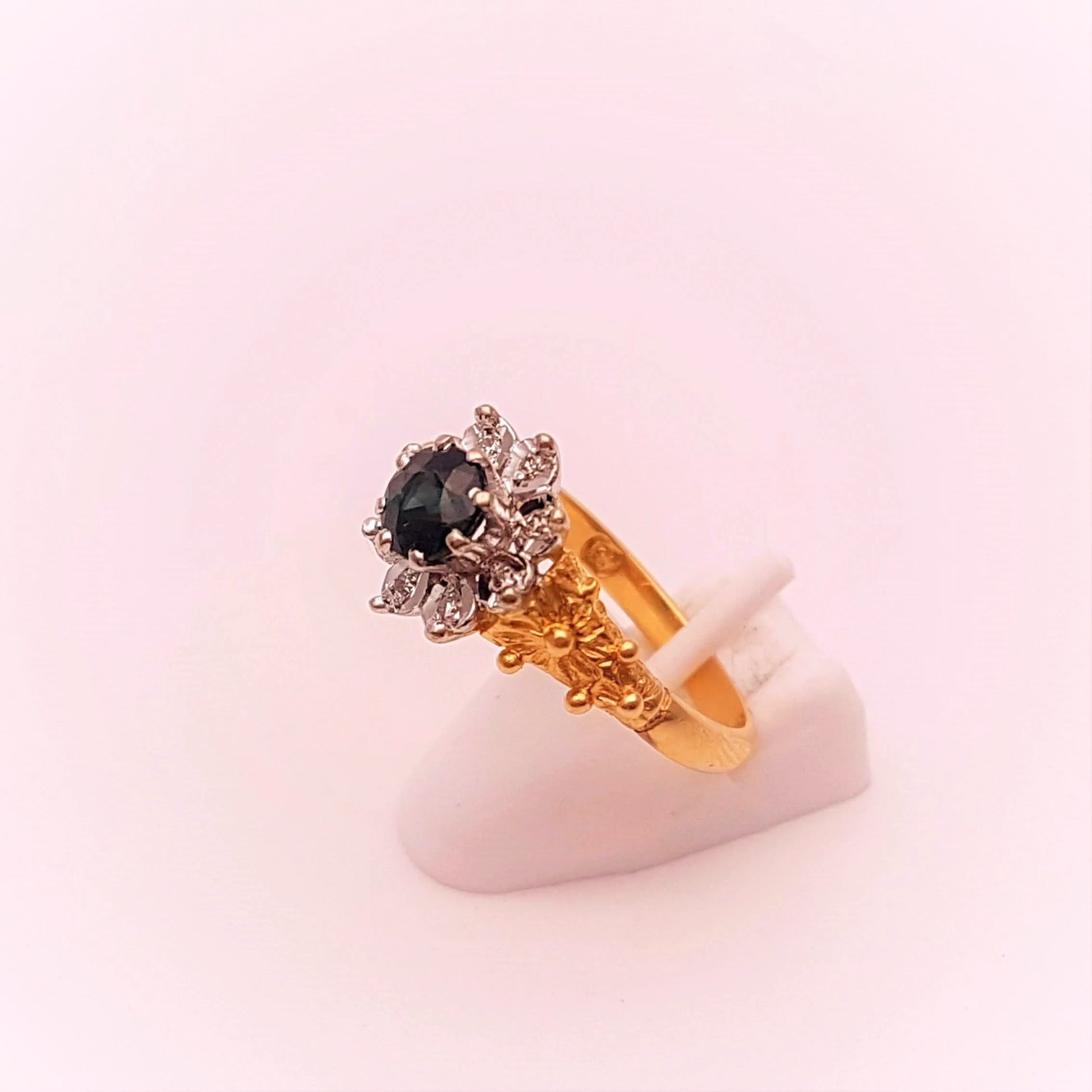 A stunning ring made from 18ct yellow gold and features a round cut sapphire set at the centre of the ring surrounded by 8 illusion set round cut diamonds with the white setting resembling a flower head . the band is yellow gold with extra detailing on the shoulders with floral resemblance. Stamped as 18ct and tests as such