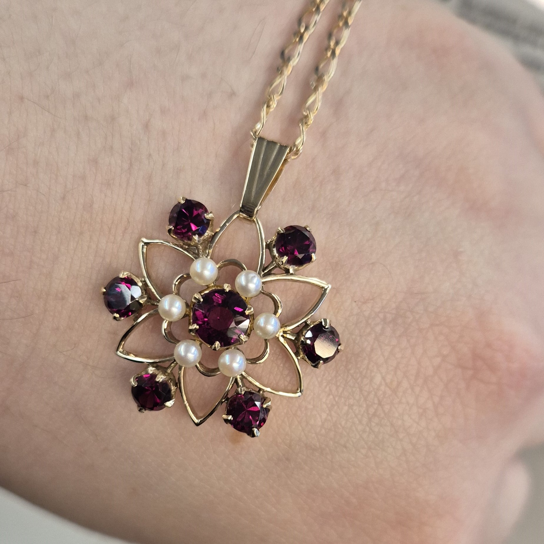 This stunning pendant piece is made from a nice warm yellow gold and is in the shape of flower / star with 6 points and is set with multiple round cut rhodolite garnets and pearls; and hangs from a yellow gold bale.