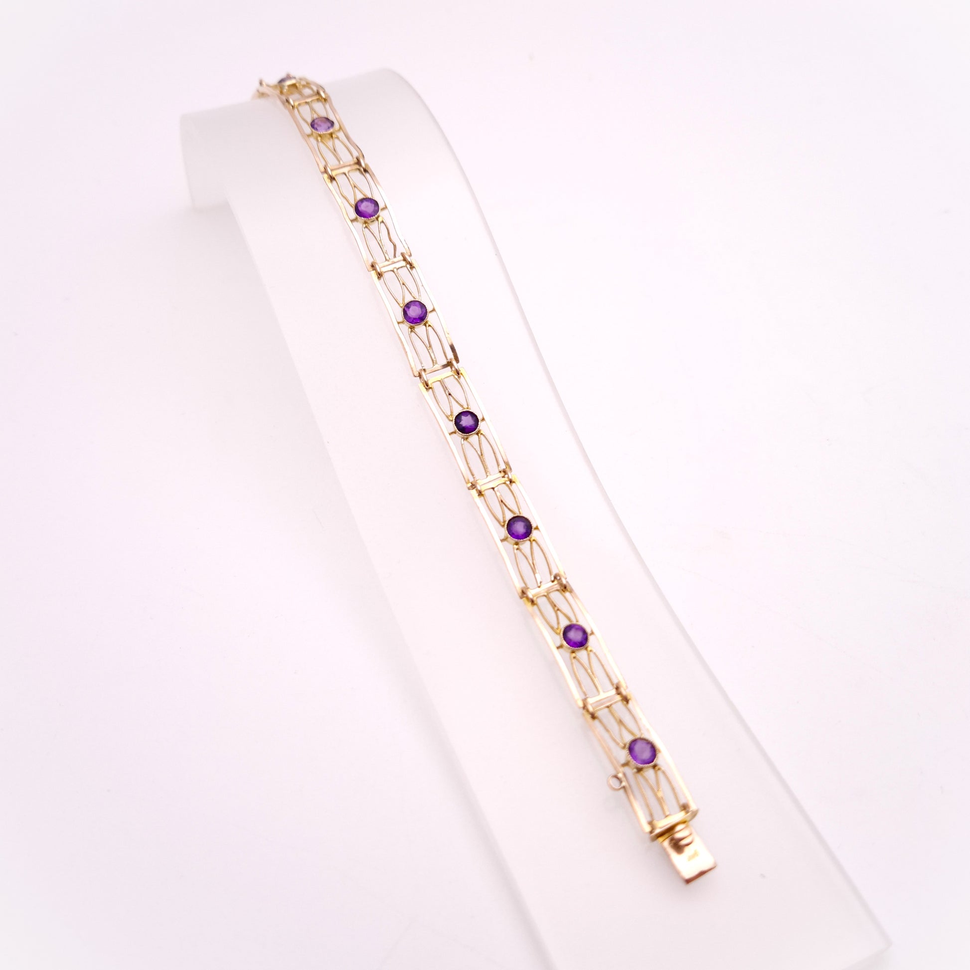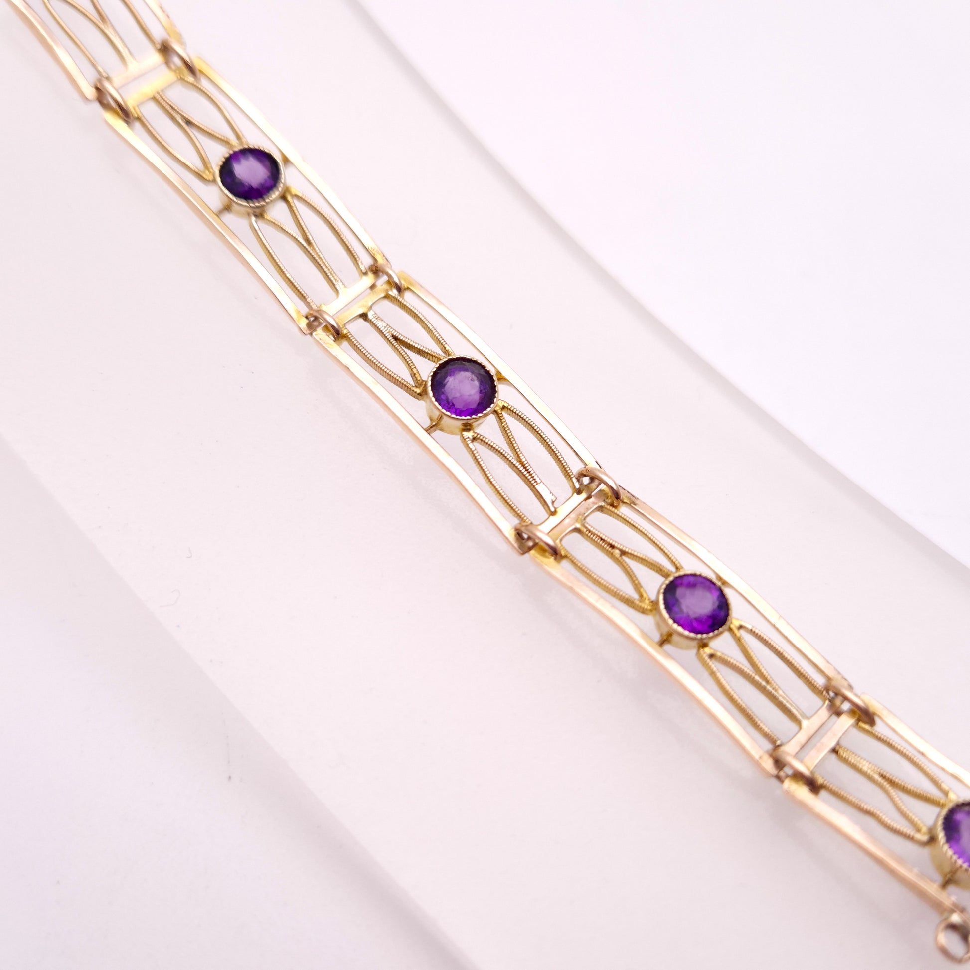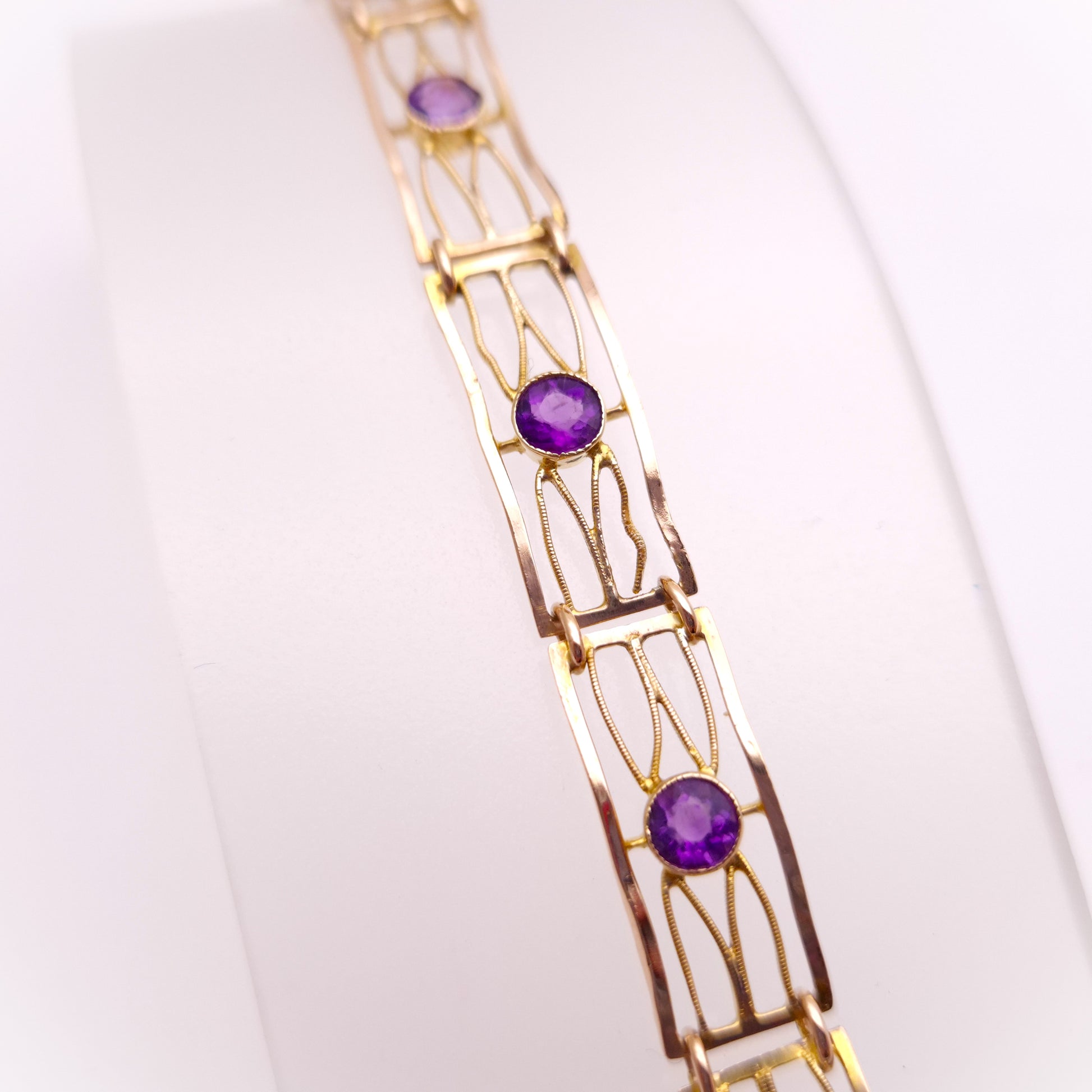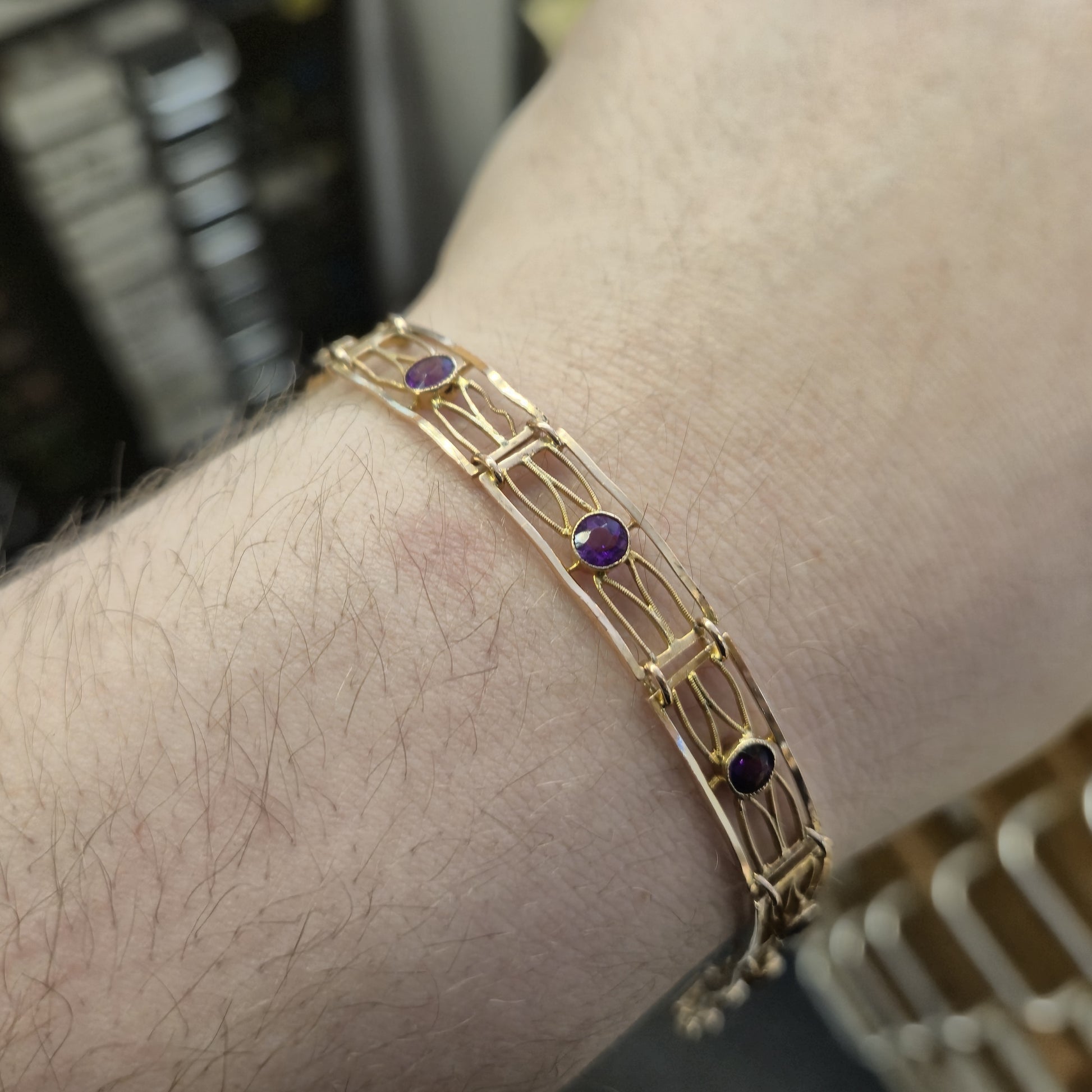 The bracelet is composed of a series of rectangular links, each meticulously designed with delicate open-work patterns that lend an airy and sophisticated feel. Within these links, a series of round-cut amethysts are bezel-set, their rich purple hues providing a striking contrast against the rosy warmth of the gold. The consistent spacing of the amethysts creates a harmonious flow along the length of the bracelet. The secure box clasp ensures a comfortable and safe fit, making this bracelet perfect for both everyday wear and special occasions. Its timeless design and beautiful colour combination make it a truly versatile and cherished addition to any jewellery collection.