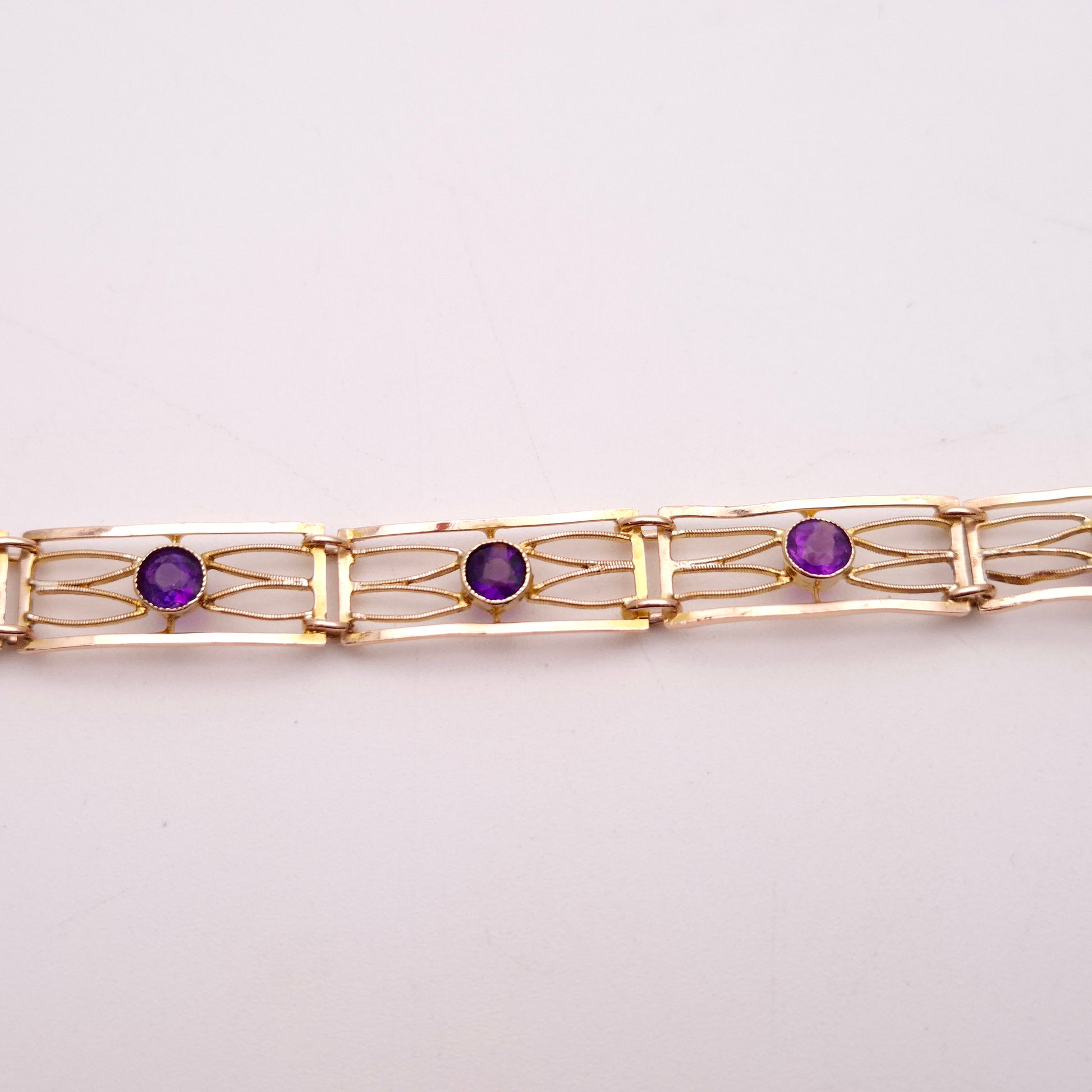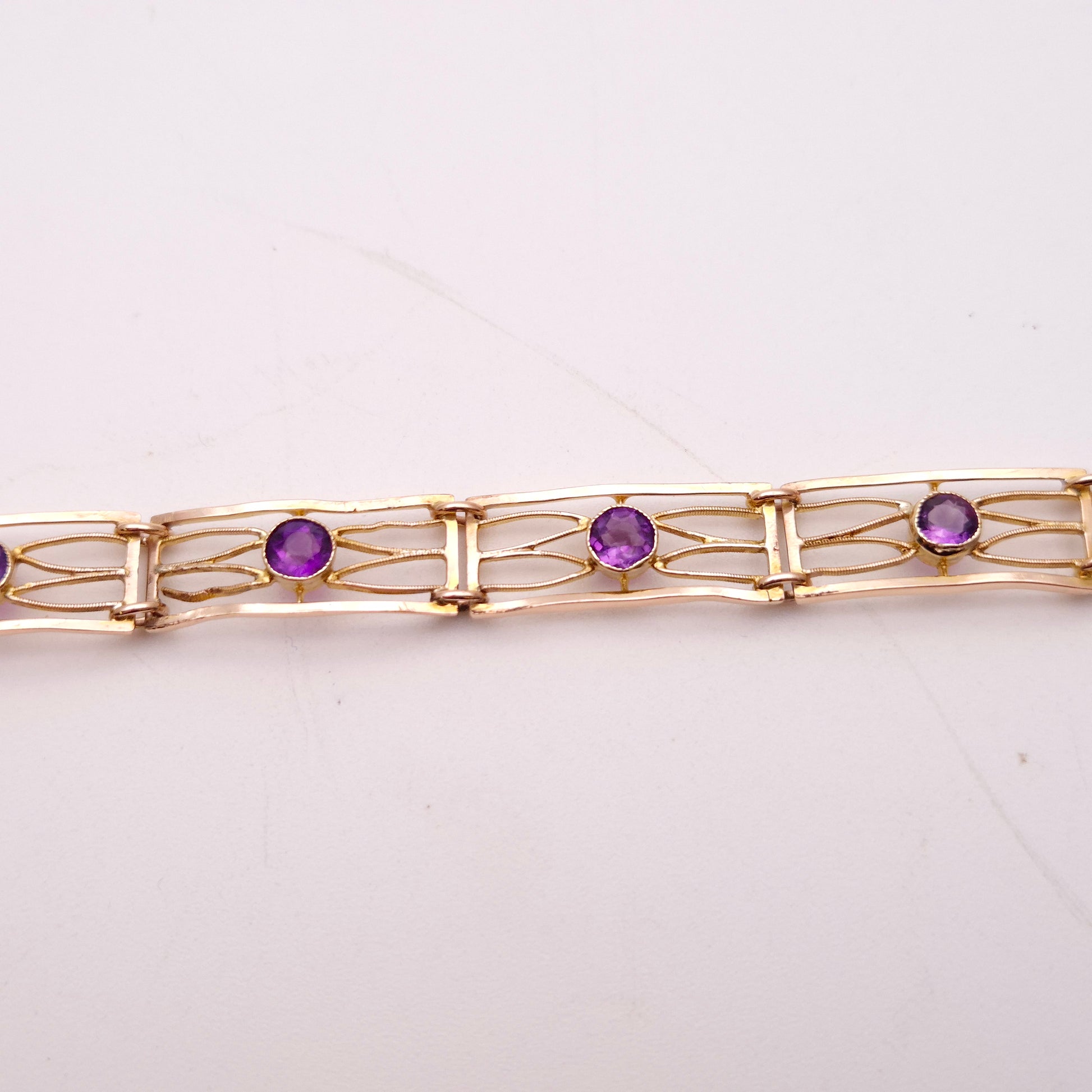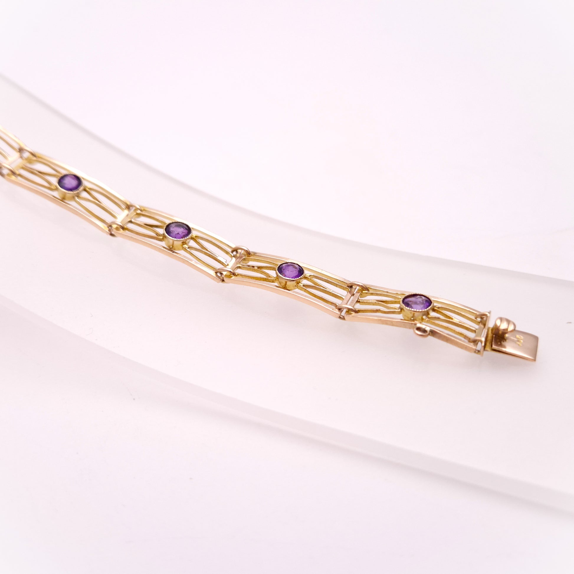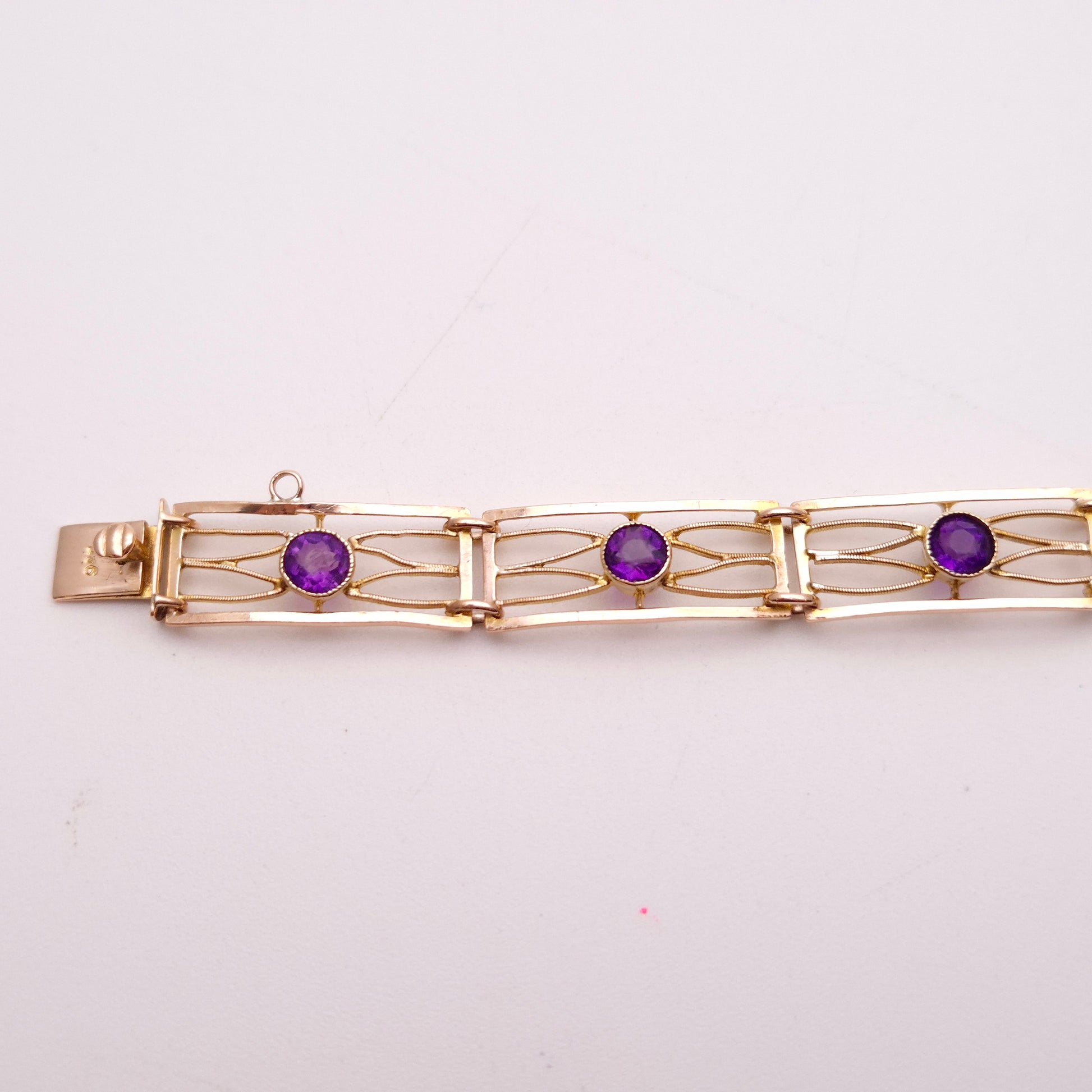 The bracelet is composed of a series of rectangular links, each meticulously designed with delicate open-work patterns that lend an airy and sophisticated feel. Within these links, a series of round-cut amethysts are bezel-set, their rich purple hues providing a striking contrast against the rosy warmth of the gold. The consistent spacing of the amethysts creates a harmonious flow along the length of the bracelet. The secure box clasp ensures a comfortable and safe fit, making this bracelet perfect for both everyday wear and special occasions. Its timeless design and beautiful colour combination make it a truly versatile and cherished addition to any jewellery collection.