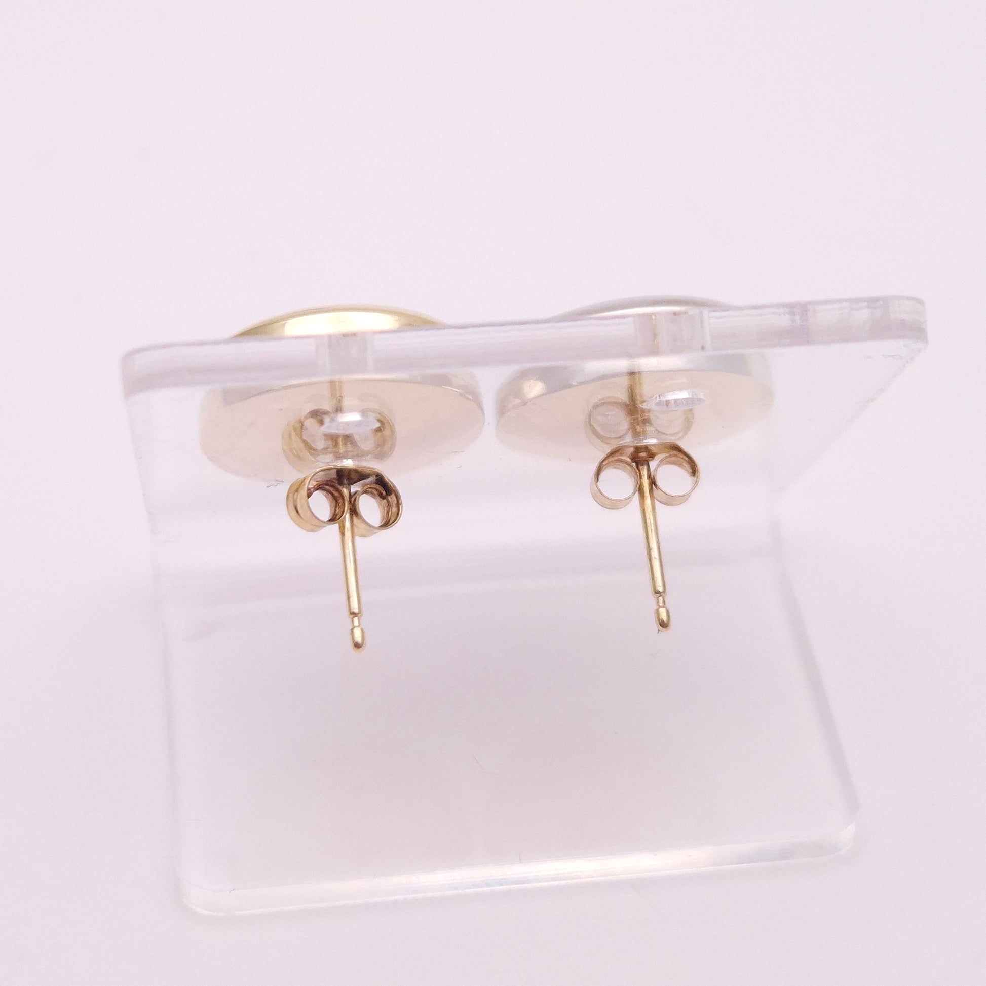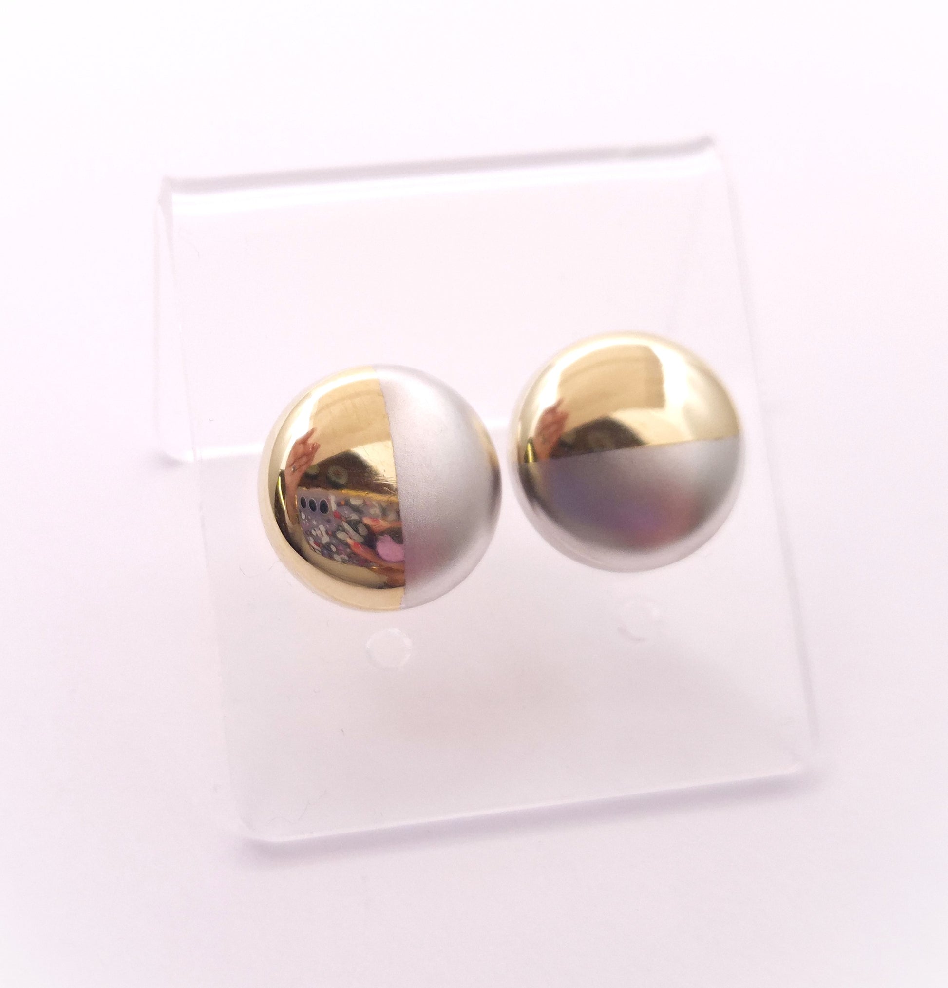 These simple stud earrings are made from 9ct gold and are a simple but effective design. they are a button style stud being round in shape and split down the centre with one side being polished yellow gold and the other being a slightly textured effect in white gold.