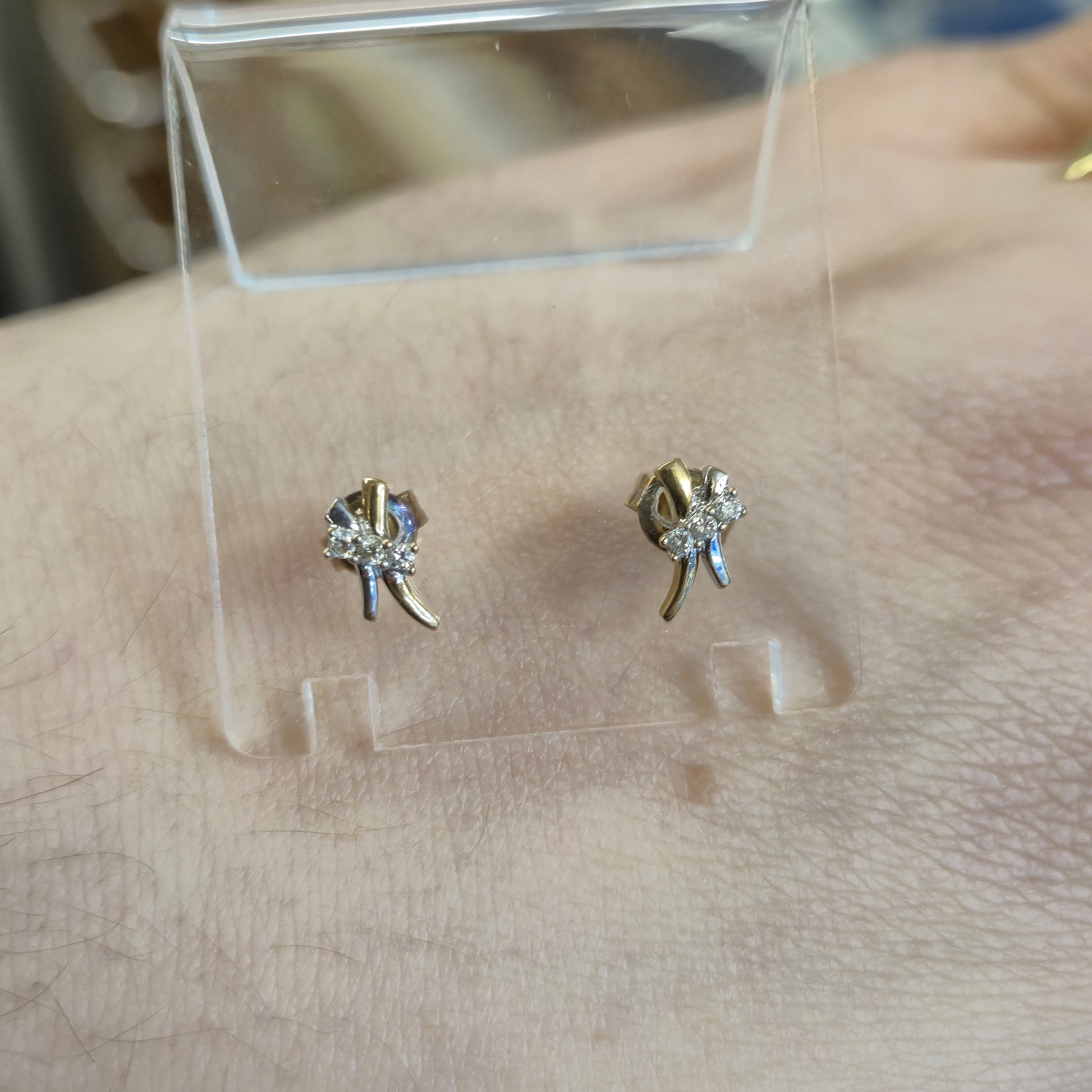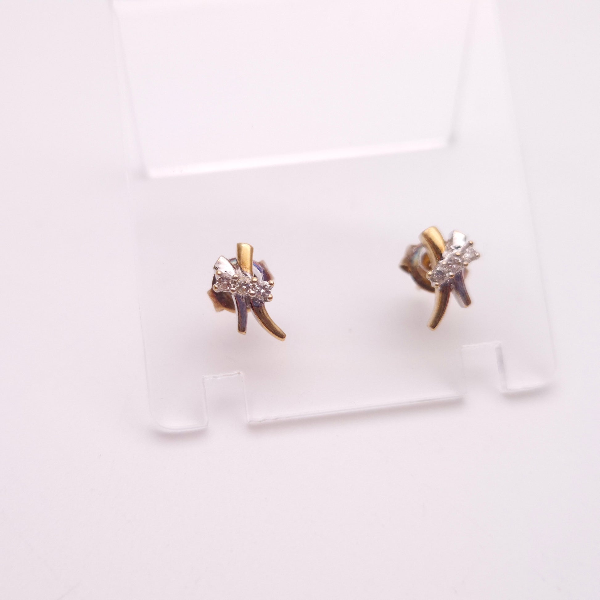 The design is a contemporary, abstract motif, resembling a stylized "X," a ribbon, or a modern bow. The two-tone effect is used to create contrast and depth: one section is in warm rose gold, while the opposing section is in bright white gold. Across the centre is delicately set row of small, shimmering round brilliant-cut diamonds. These diamond accents ensure the earrings catch the light beautifully and provide a brilliant focal point.
