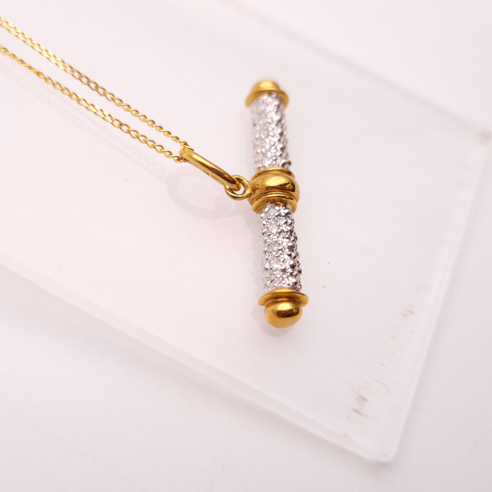 Contrasting beautifully with the diamond-set section, the smooth, polished caps at either end of the bar, as well as the bail, are finished in warm yellow gold. This two-tone detailing makes the pendant versatile, allowing it to be paired easily with both yellow and white gold jewellery. The pendant is suspended from a fine yellow gold chain, making this an elegant and ready-to-wear statement piece.