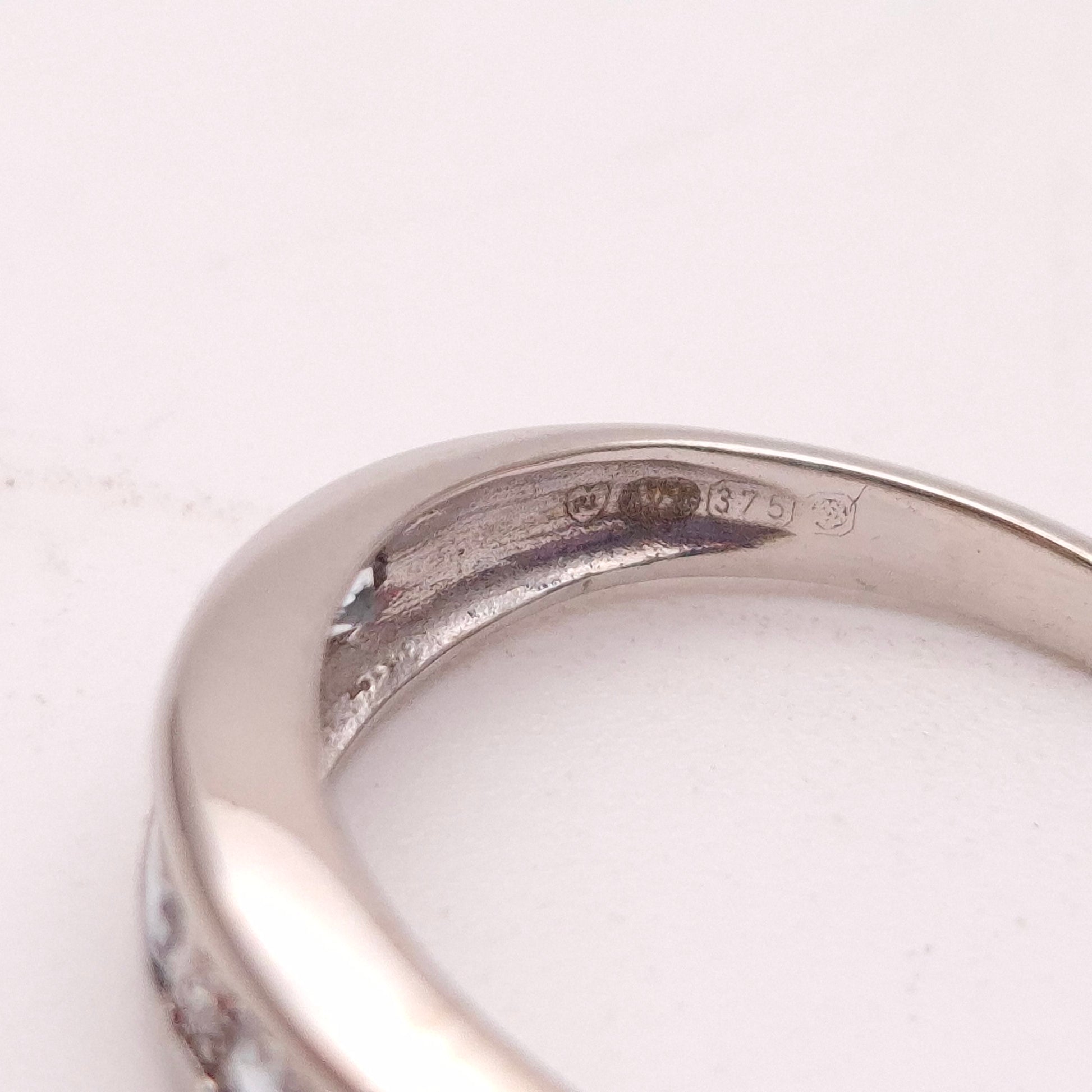 Crafted from lustrous 9-carat white gold, the ring showcases a row of five round aquamarines, each with its characteristic serene blue hue, reminiscent of clear ocean waters. These tranquil gemstones are beautifully interspersed with smaller, brilliant-cut diamonds, adding a touch of bright, icy sparkle. The stones are set within a mix of channel and claw settings, ensuring a smooth profile and protecting the gemstones.