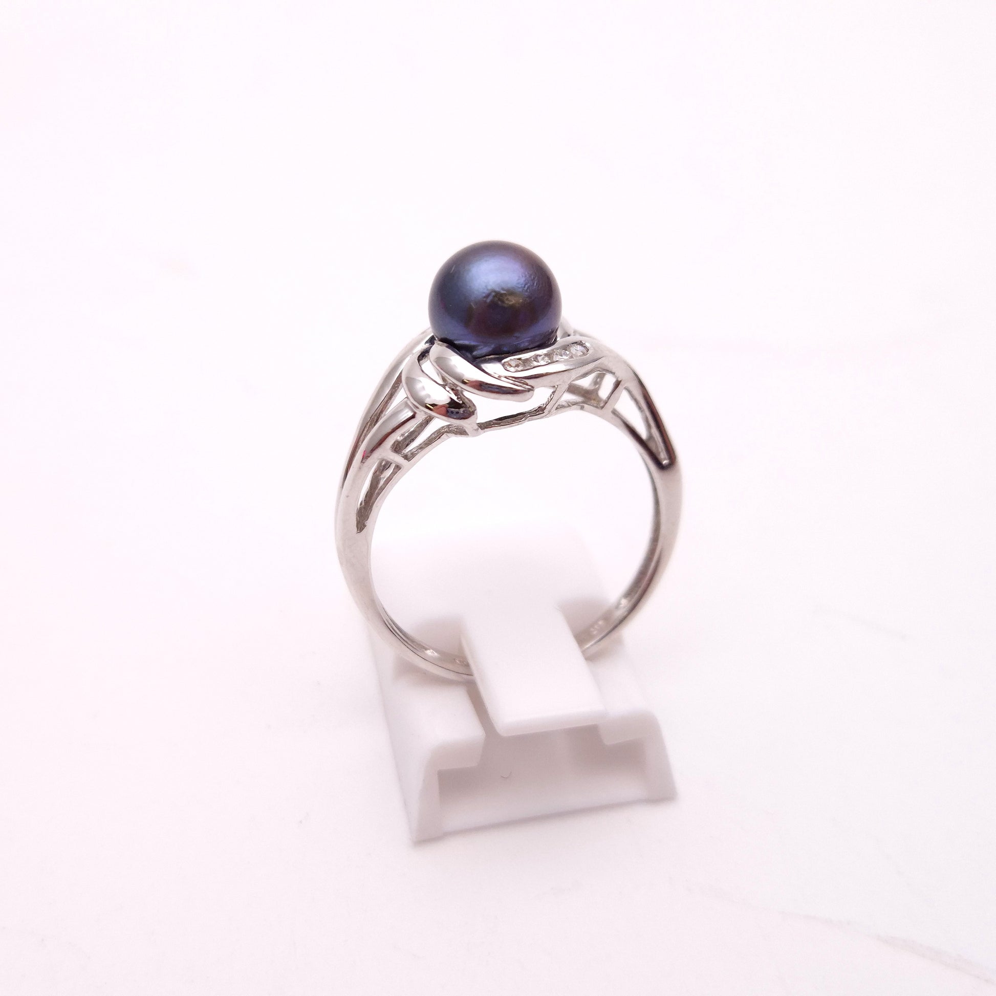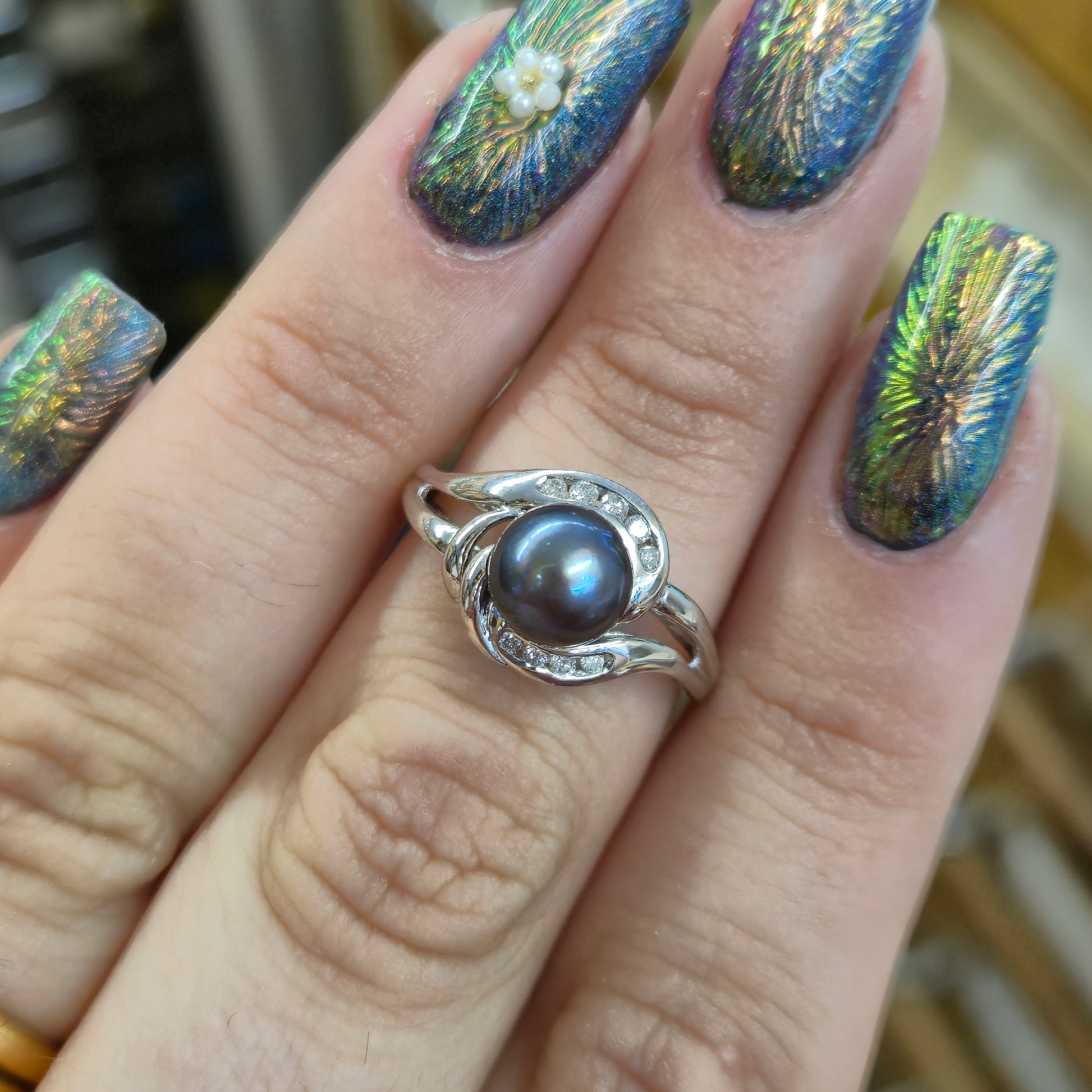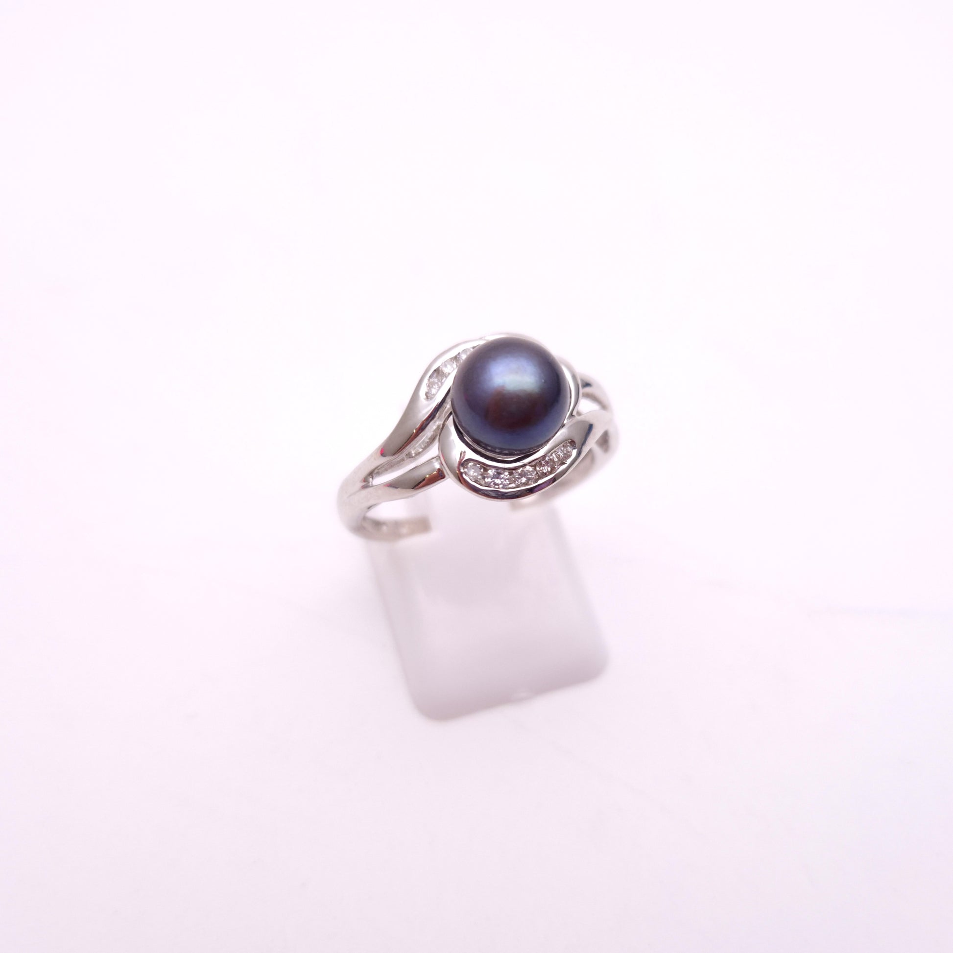 Embrace sophisticated elegance with this captivating 9ct white gold ring, featuring a lustrous black pearl embraced by a dazzling twist of diamonds. This contemporary design offers a modern take on classic pearl jewellery, making it a truly eye-catching piece.