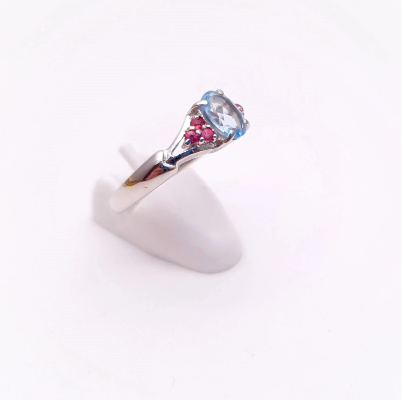 A pretty ring made from 9ct white gold with a central stone of blue topaz oval cut with 3 small round cut pink stones set to each side of the central stone