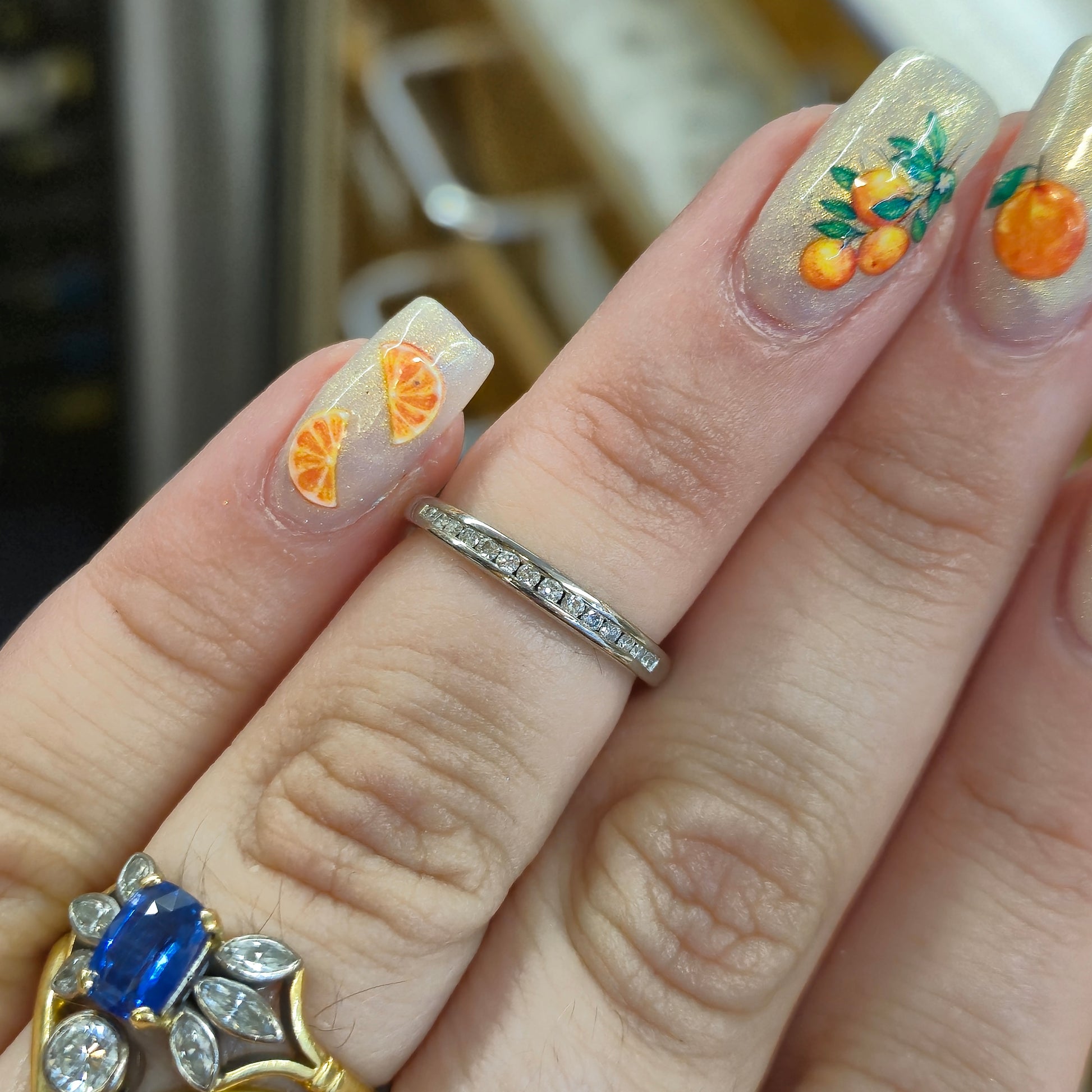 This ring showcases a row of brilliant round-cut diamonds, securely set within a smooth channel setting. This modern setting style protects the diamonds by encasing them between two precise metal walls, creating a sleek and uninterrupted line of sparkle. The diamonds extend across the top half of the ring, ensuring their brilliance is prominently displayed when worn.